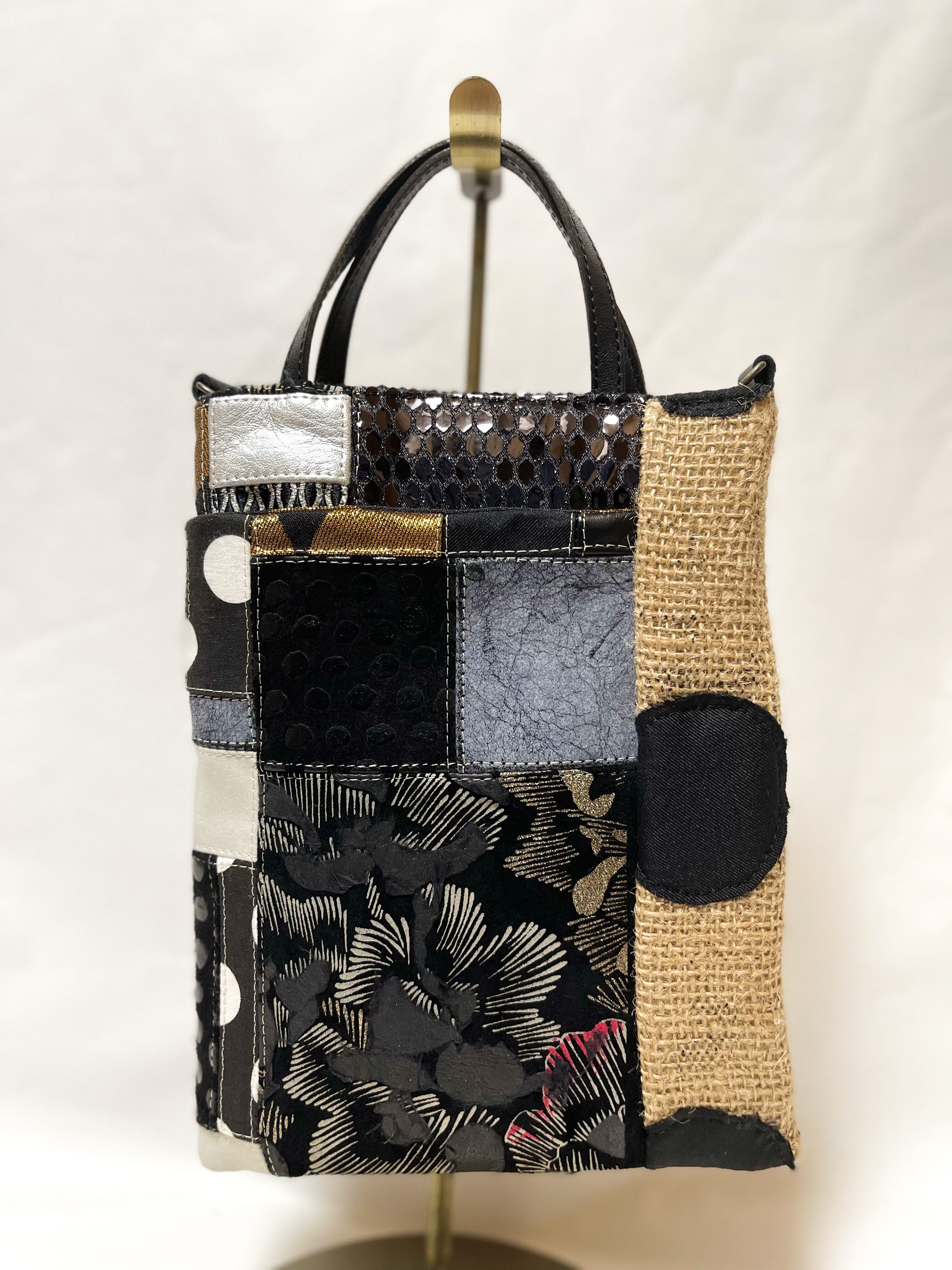 コーヒーの麻袋と本来は廃棄されてしまう端材や新しい素材を組み合わせパッチワークし、新しい型に仕上げた a Linden:tree オリジナルのサスティナブルアイテムで取り外し可能のショルダーが付いたミニミニサイズのトートバッグです。