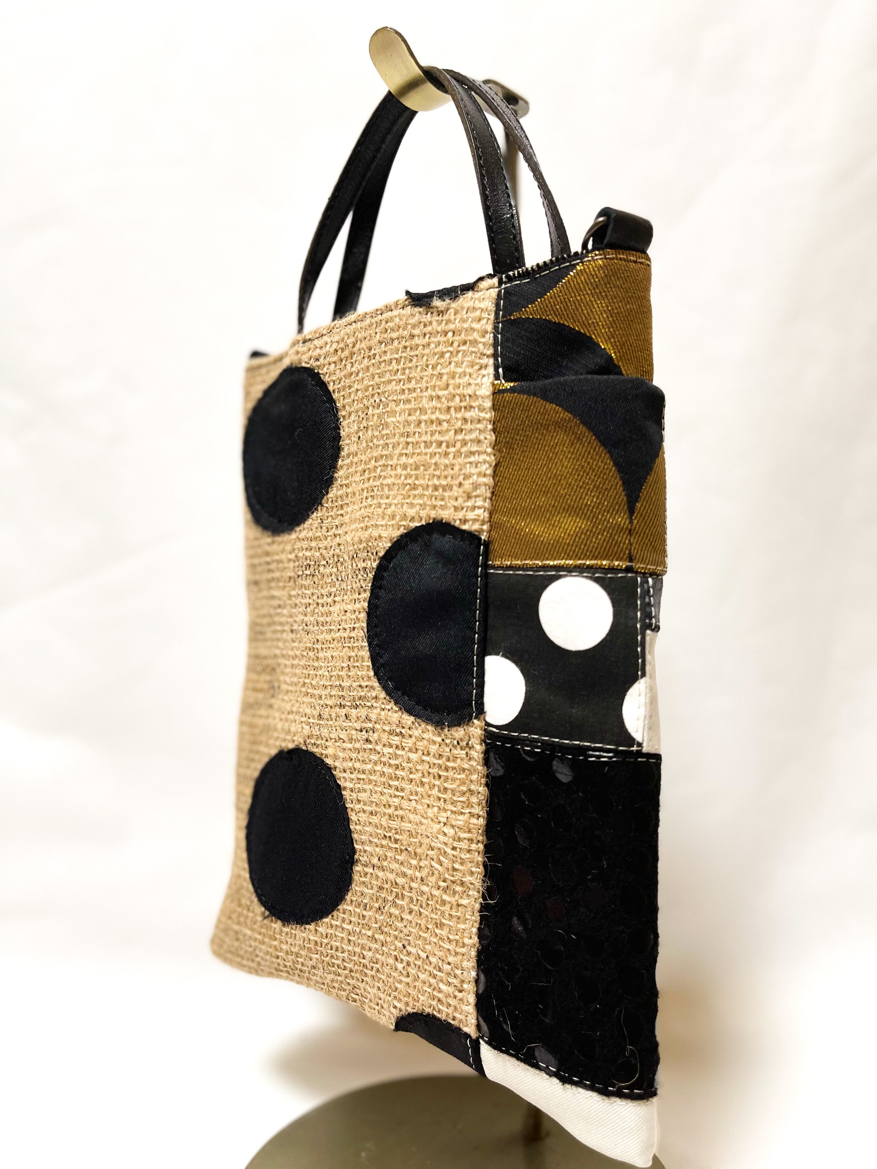 コーヒーの麻袋と様々な布地や端材のレザー等を組合せパッチワークにした仕様で、大きなドットがアクセント。