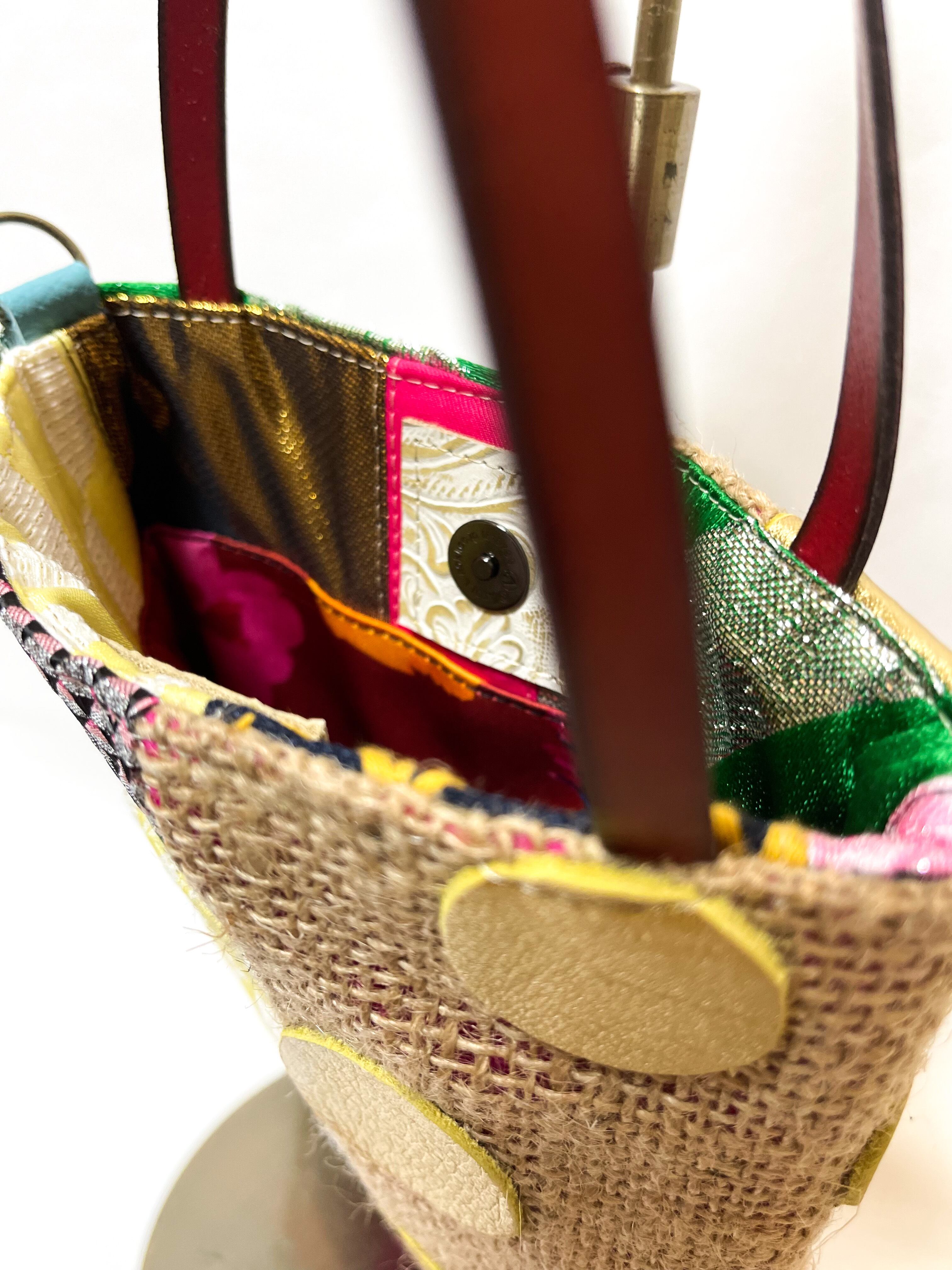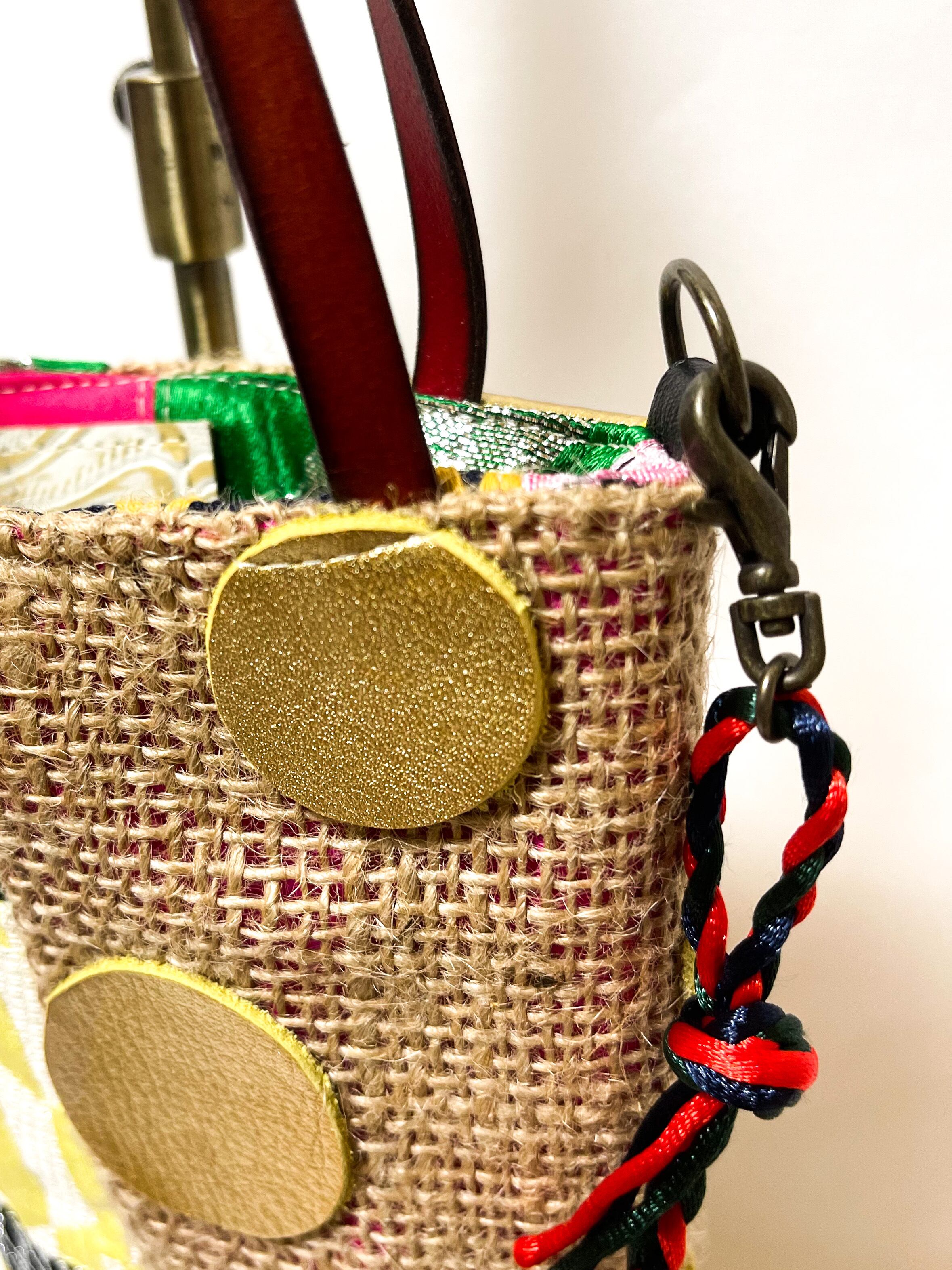 コーヒーの麻袋と本来は廃棄されてしまう端材や新しい素材を組み合わせパッチワークし、新しい型に仕上げた a Linden:tree オリジナルのサスティナブルアイテムで取り外し可能のショルダーが付いたミニミニサイズのトートバッグです。