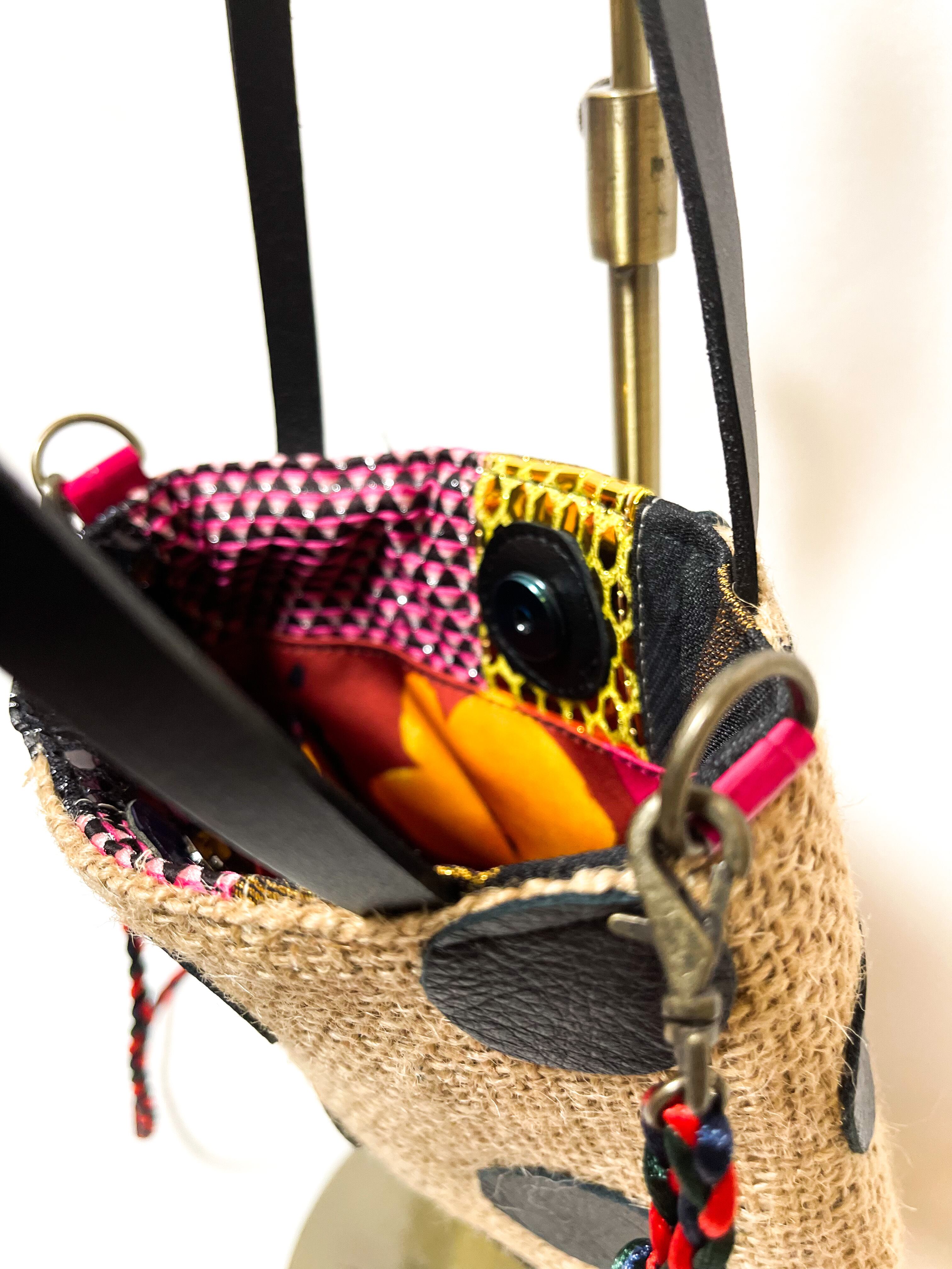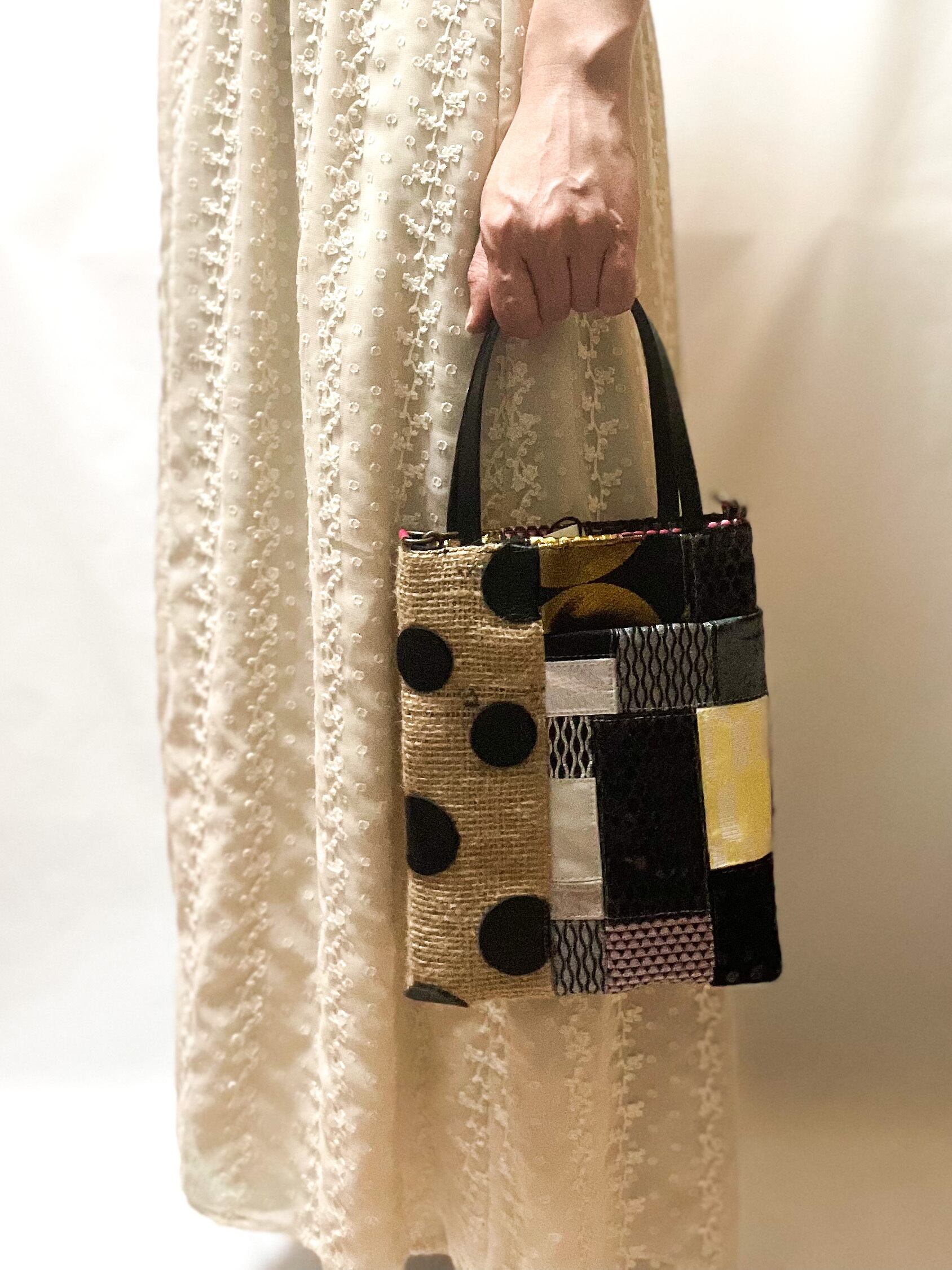 コーヒーの麻袋と本来は廃棄されてしまう端材や新しい素材を組み合わせパッチワークし、新しい型に仕上げた a Linden:tree オリジナルのサスティナブルアイテムで取り外し可能のショルダーが付いたミニミニサイズのトートバッグです。