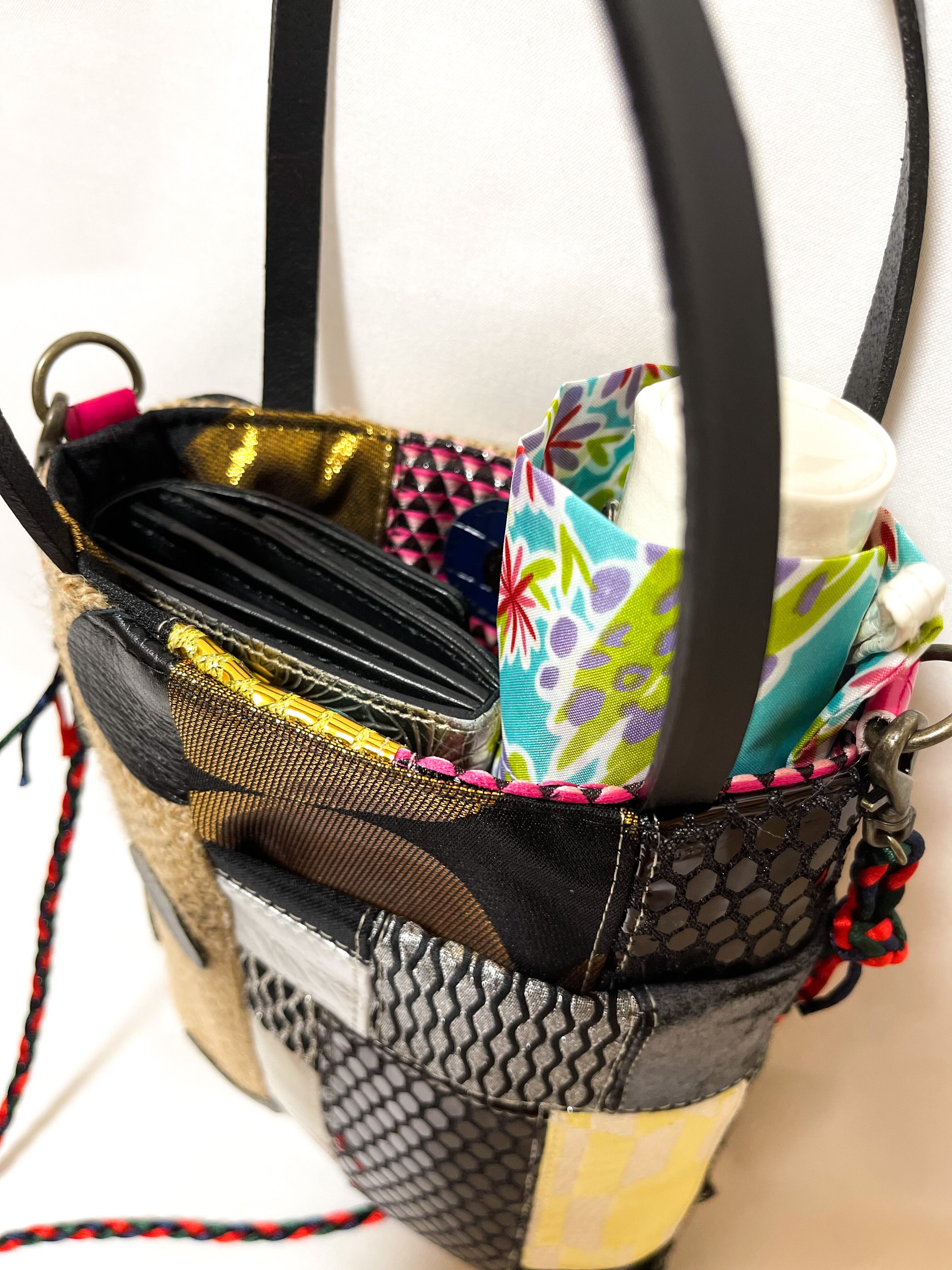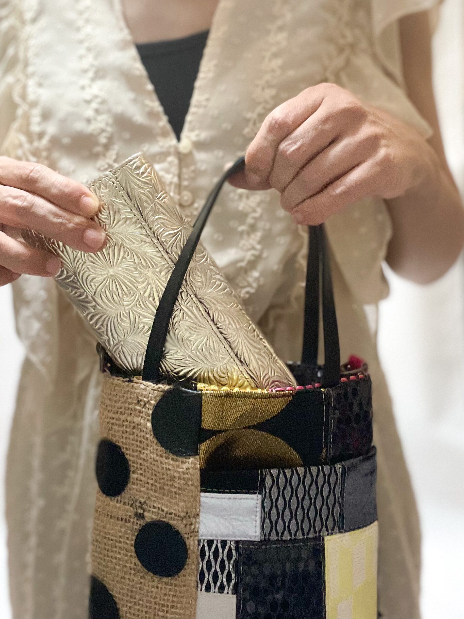 コーヒーの麻袋と様々な布地や端材のレザー等を組合せパッチワークにした仕様で、レザーのドットがアクセント。