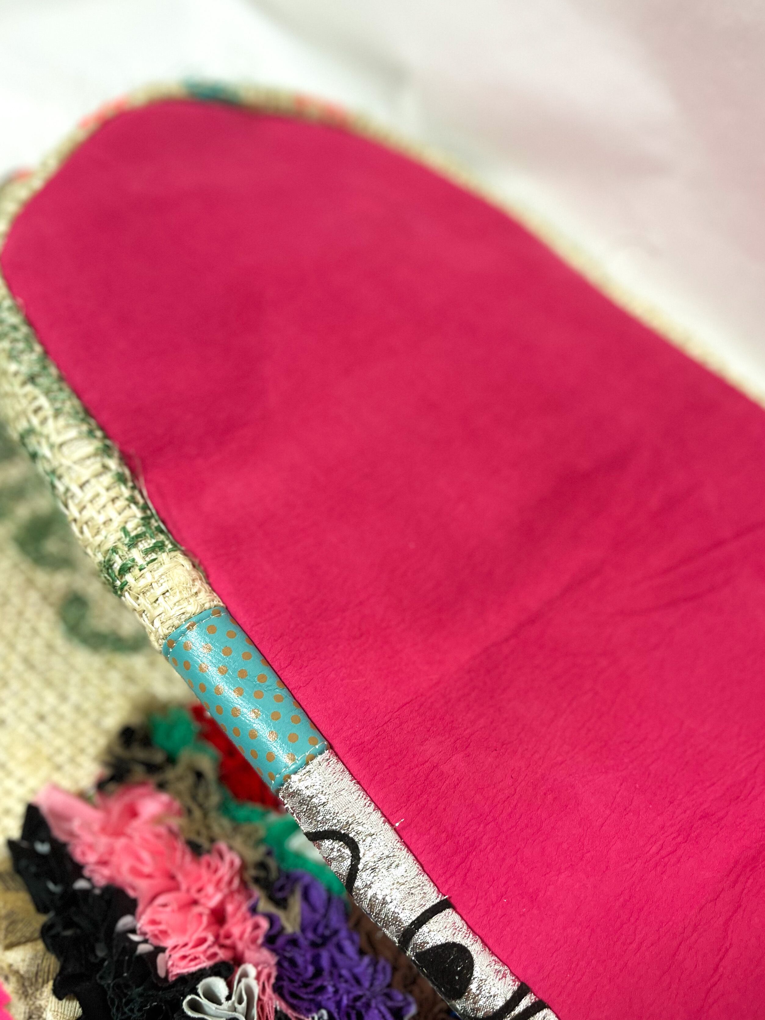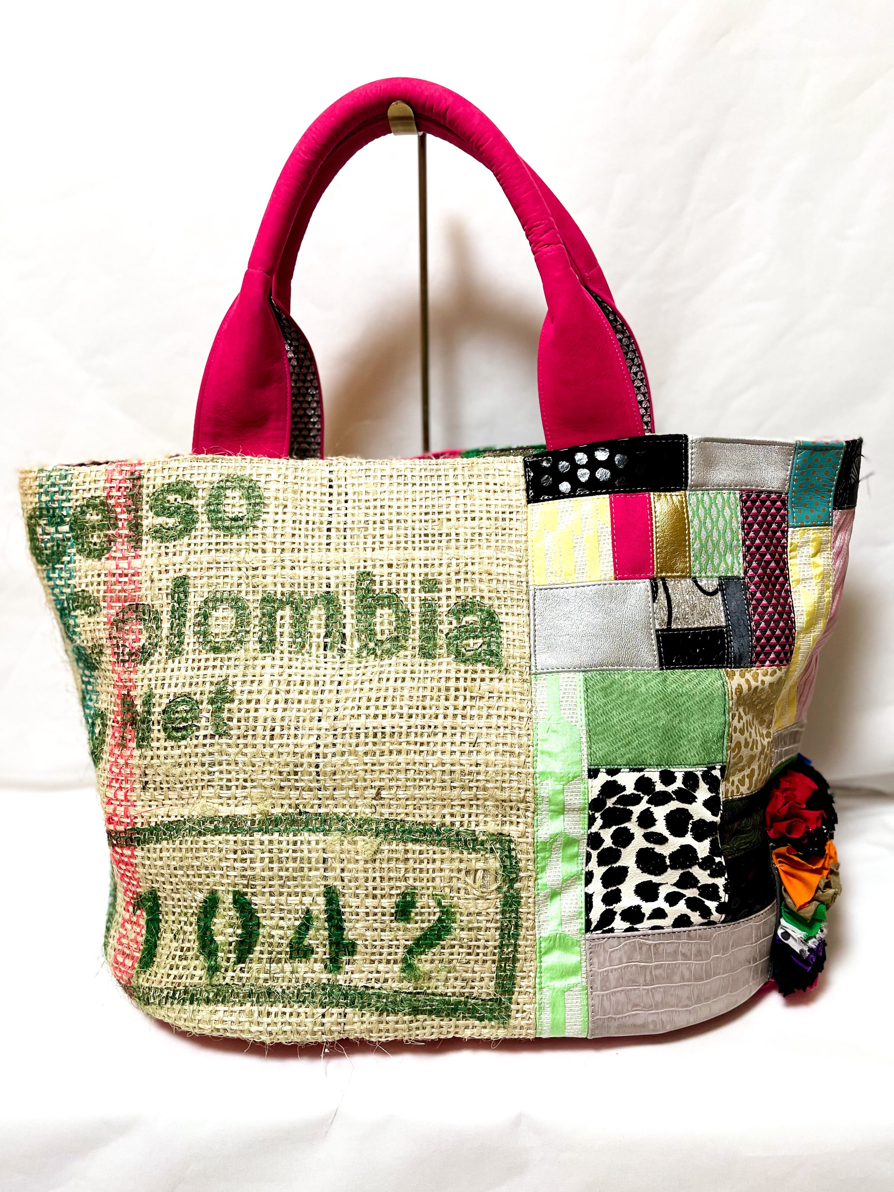 様々な布地をフリルにし端材の革などをコーヒーの麻袋とミックスしパッチワークしたデザインで、シンプルとは真逆のデコラティブなデザインに仕上げました。