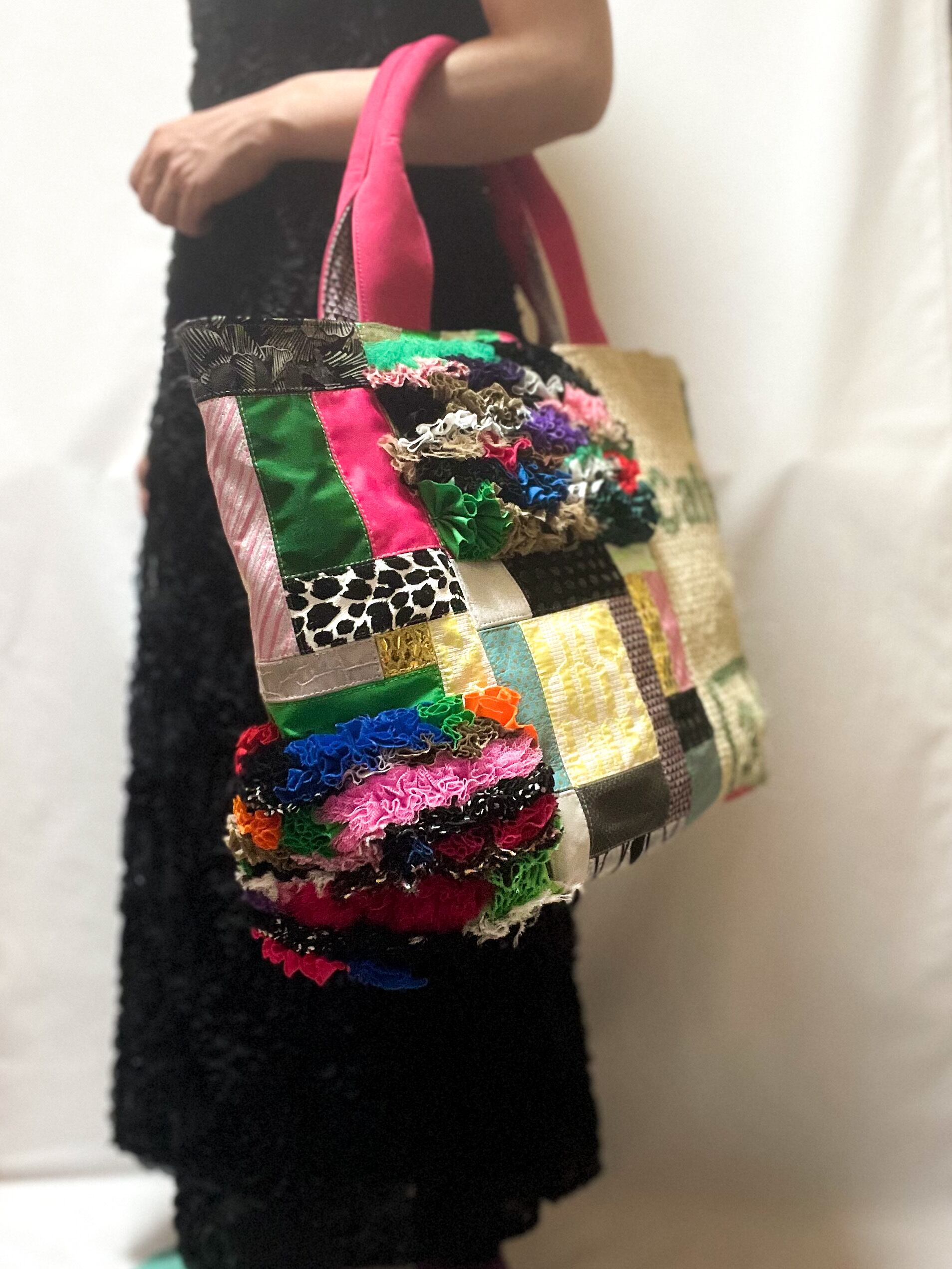 本来は廃棄されてしまう端材を新しい素材と組み合わせフリルの布地を作り更にパッチワークにし新しい型に仕上げました。