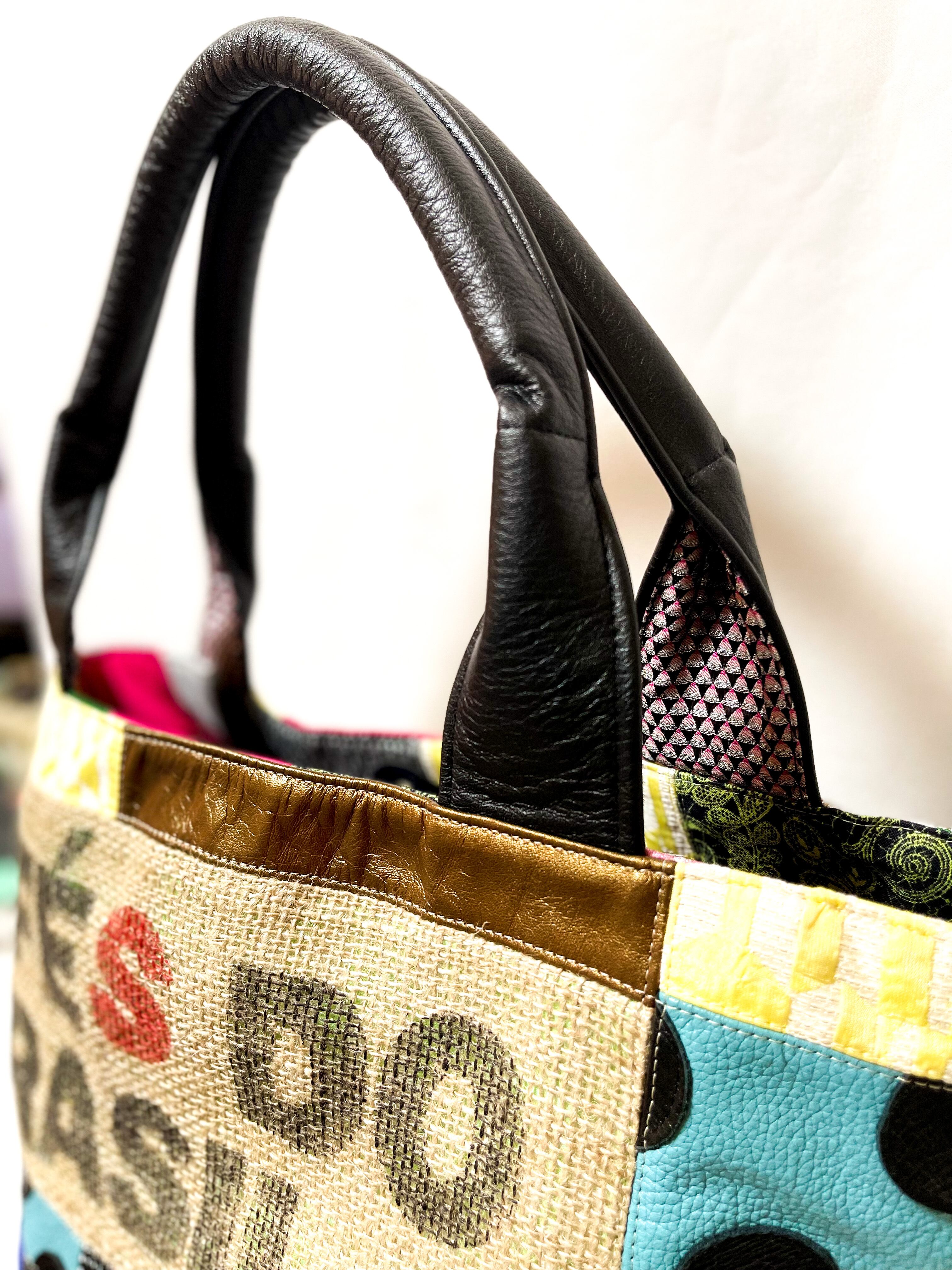 様々な布地や端材の革などをコーヒーの麻袋とミックスしパッチワークしたデザインで、シンプルとは真逆のデコラティブなデザインに仕上げました。