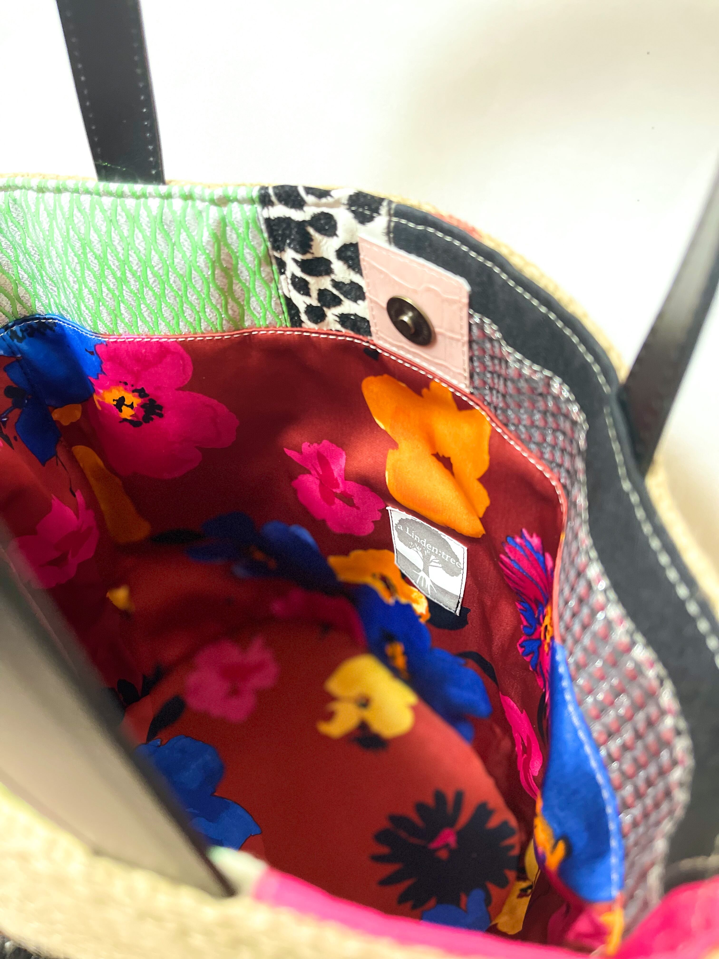 裏地には花柄の布を使用し内側の縁面には端材をパッチワーク、底面に端材の型押したレザーを使用したりと自身にしか分からないオシャレ感もあります。