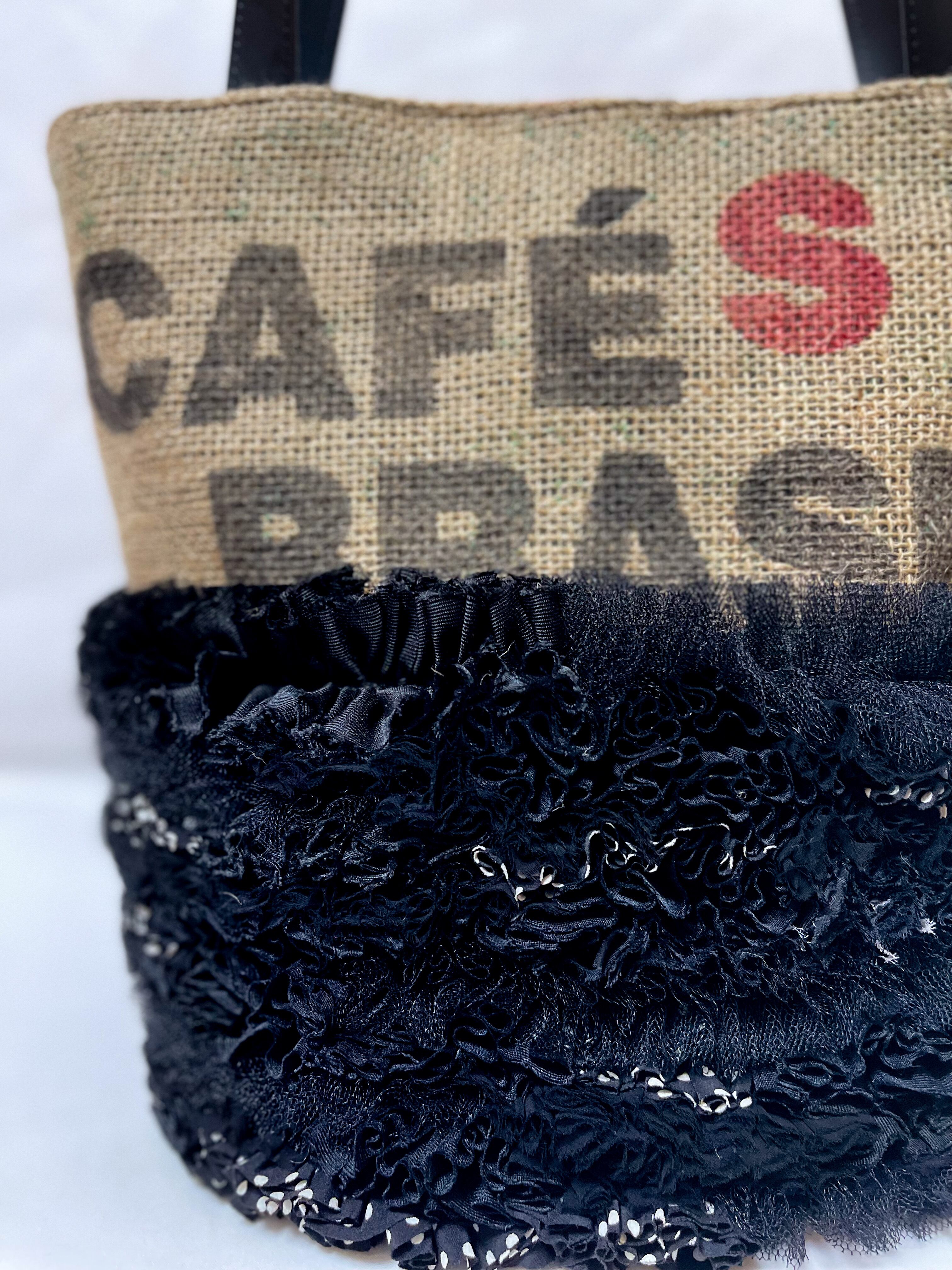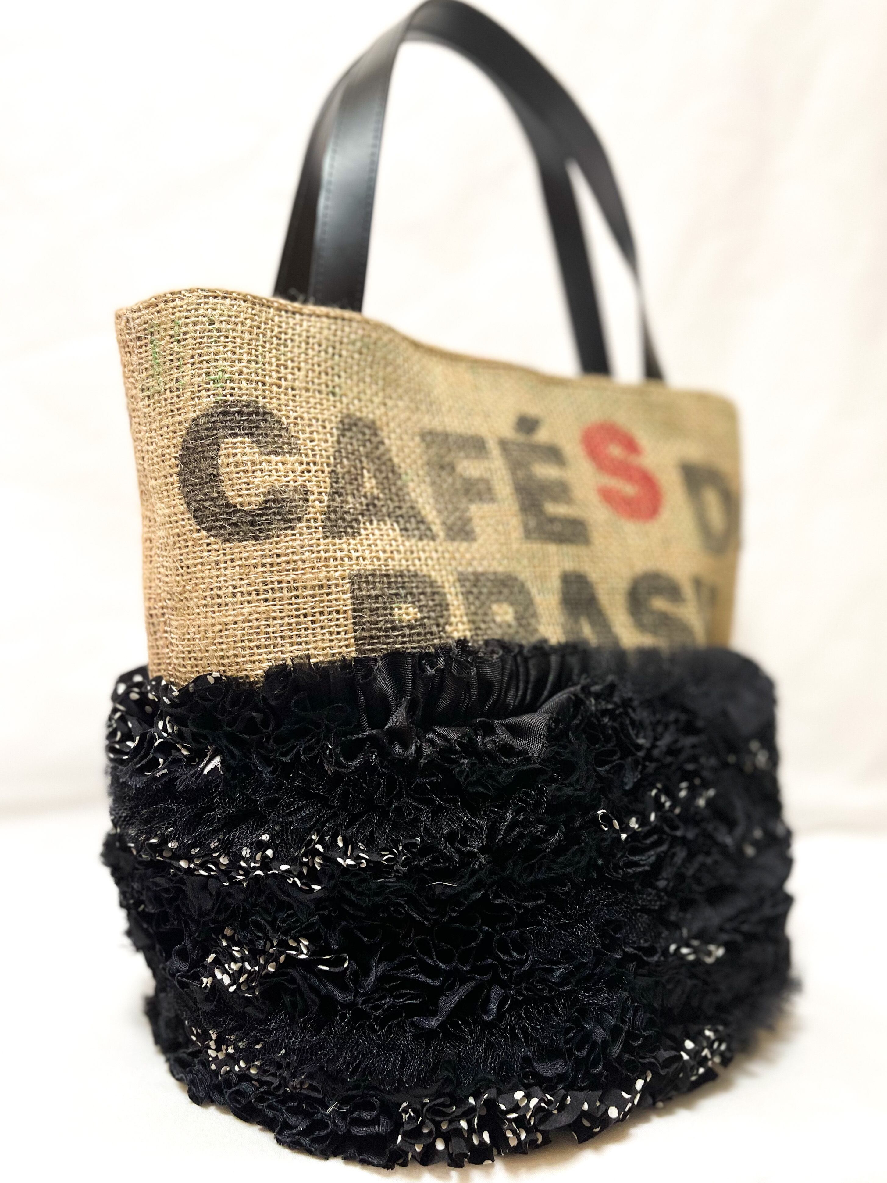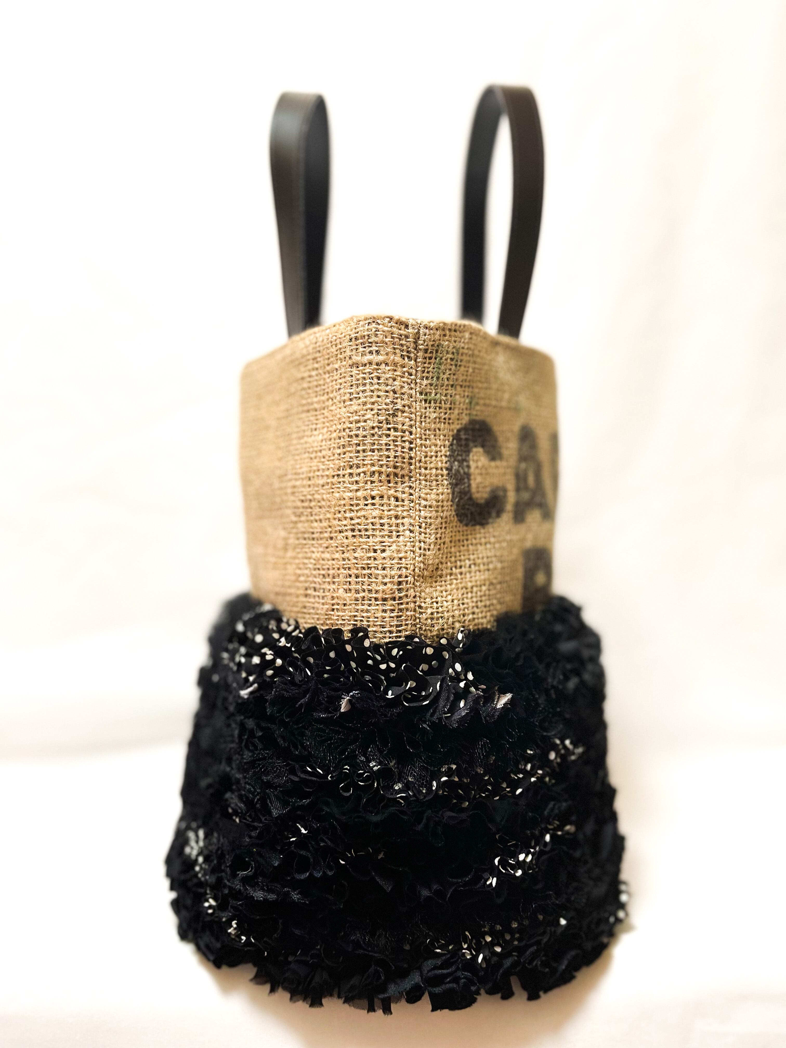 様々な布地をフリフリに施しコーヒーの麻袋とミックスしたデザインで、シンプルとは真逆のデコラティブなデザインに仕上げました。