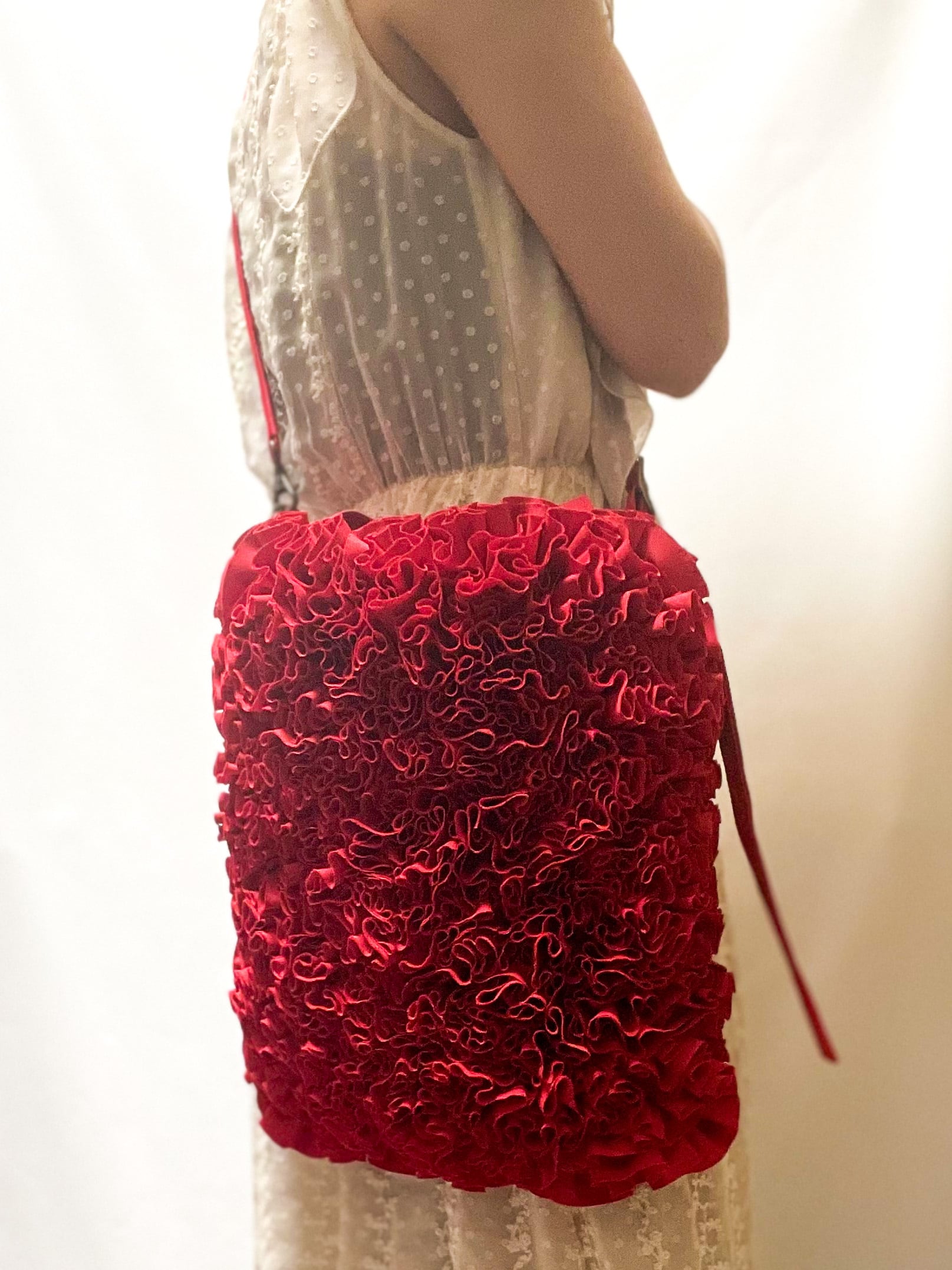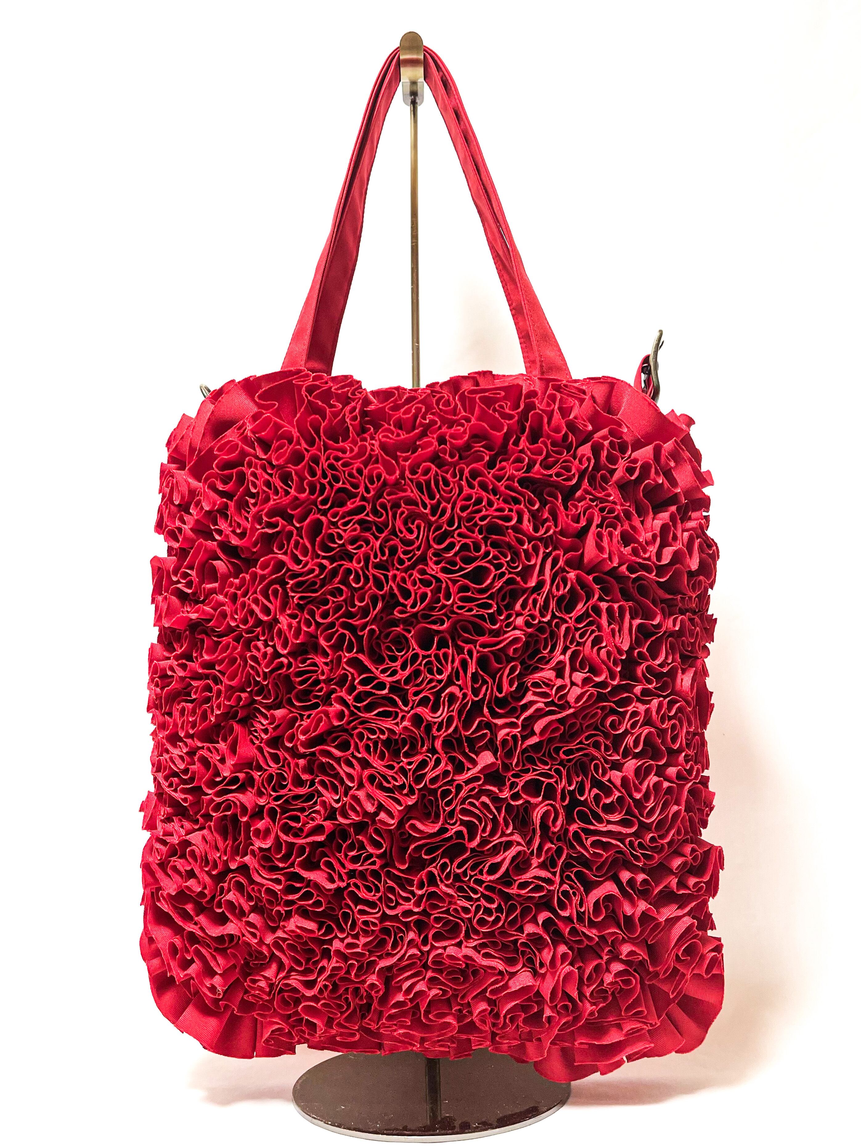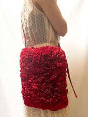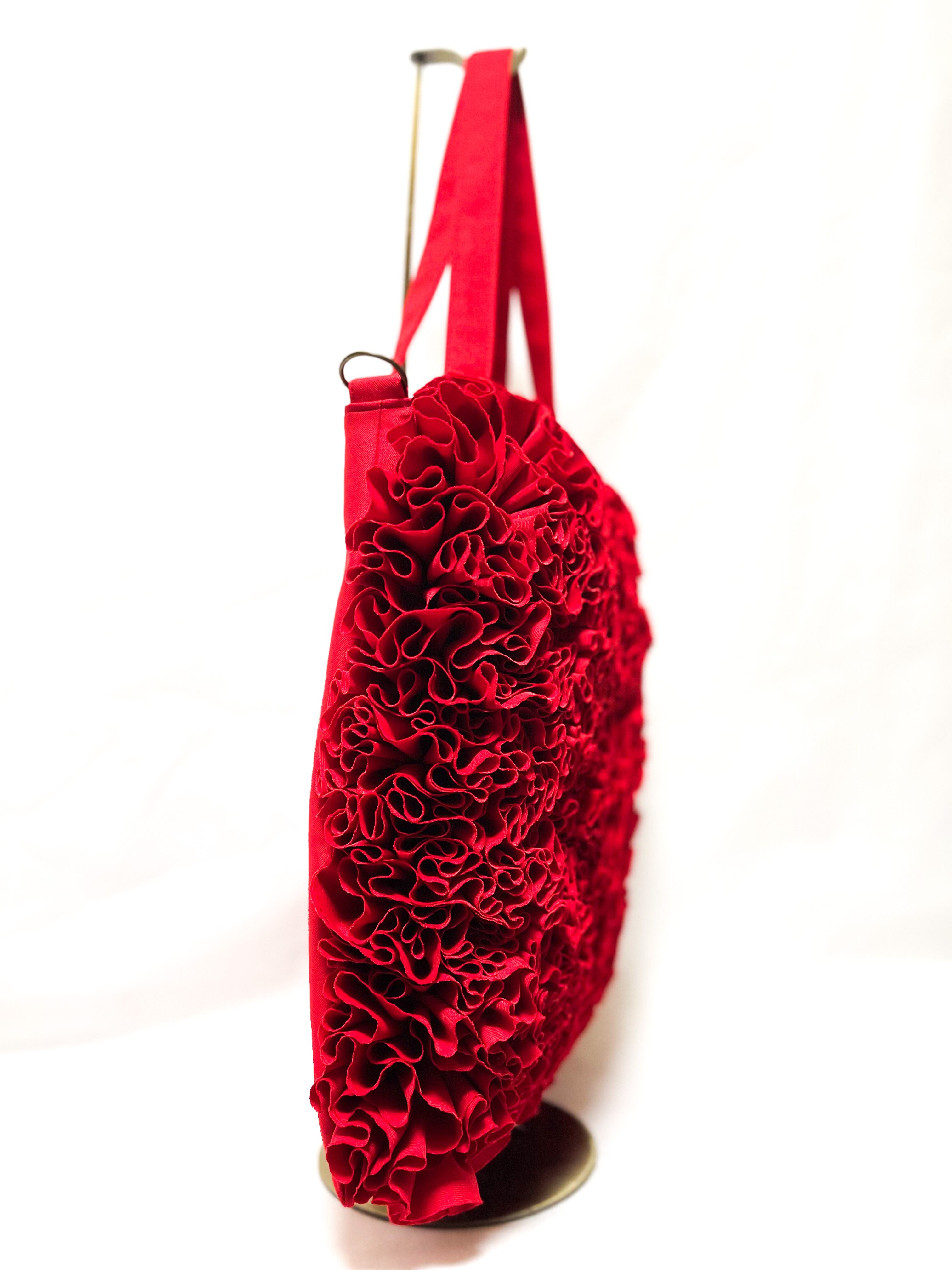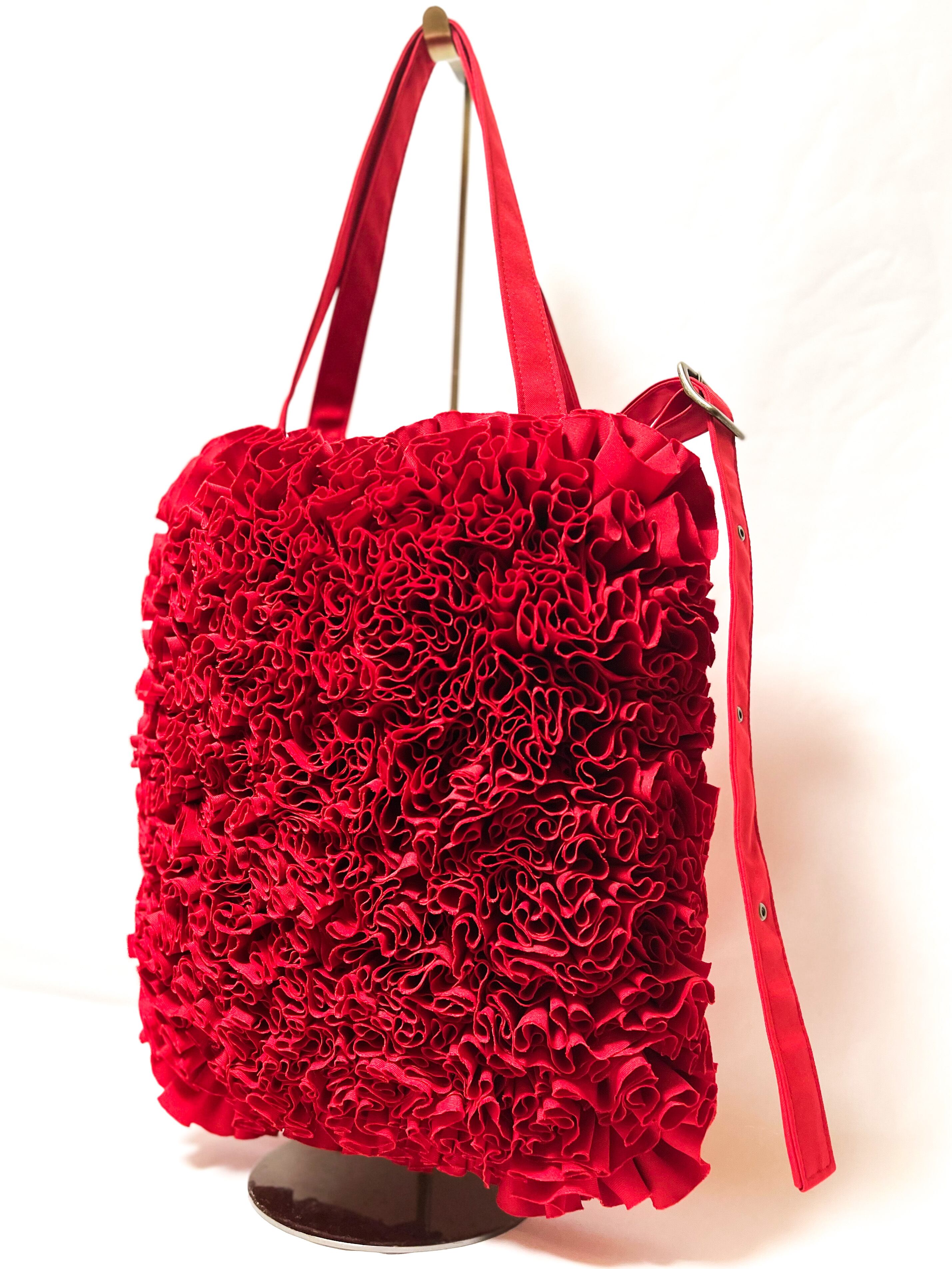 両面にギュギュっと詰まったブーケをイメージし、一つ一つお花の形にしながら手作業でフリルを施したお花が特徴的なトートバック。