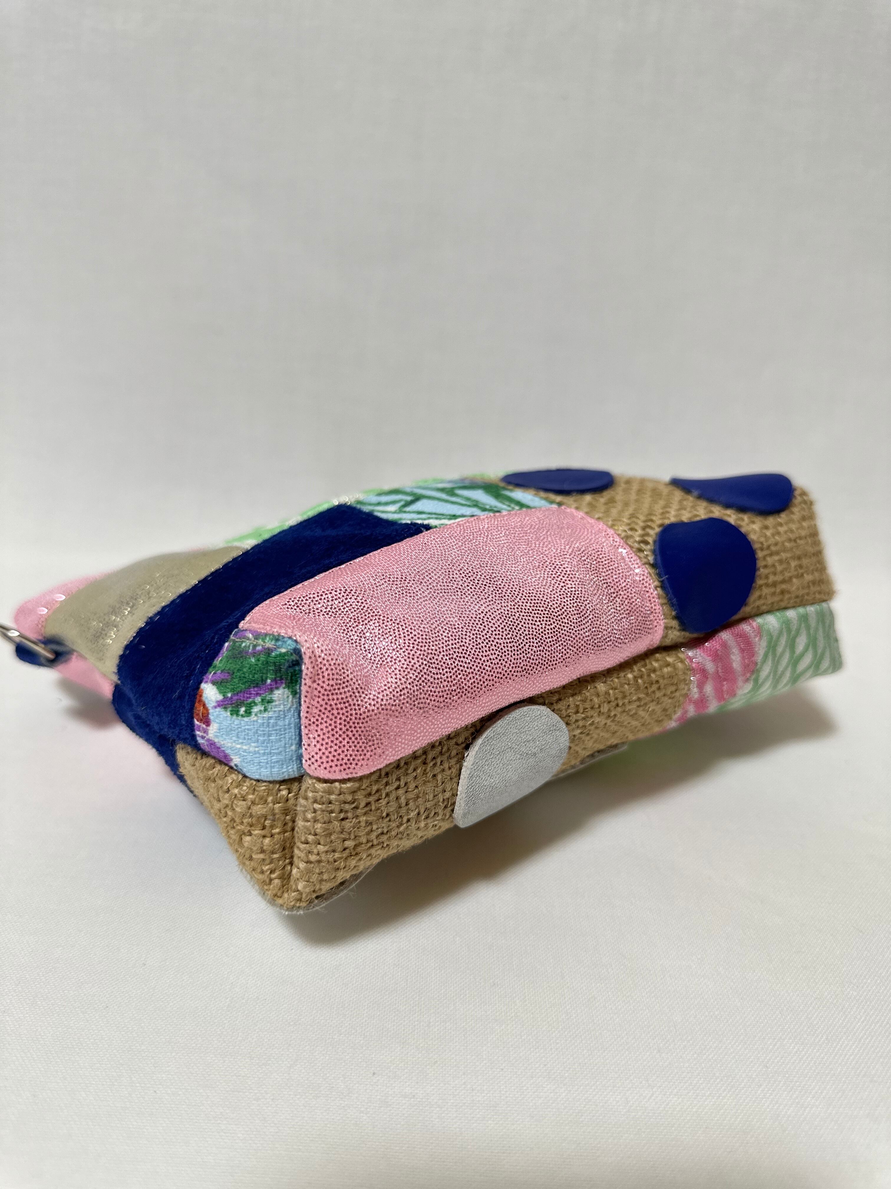 パッチワークポーチ ❸#ブルー・シルバードットMix / ショルダー付き