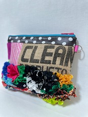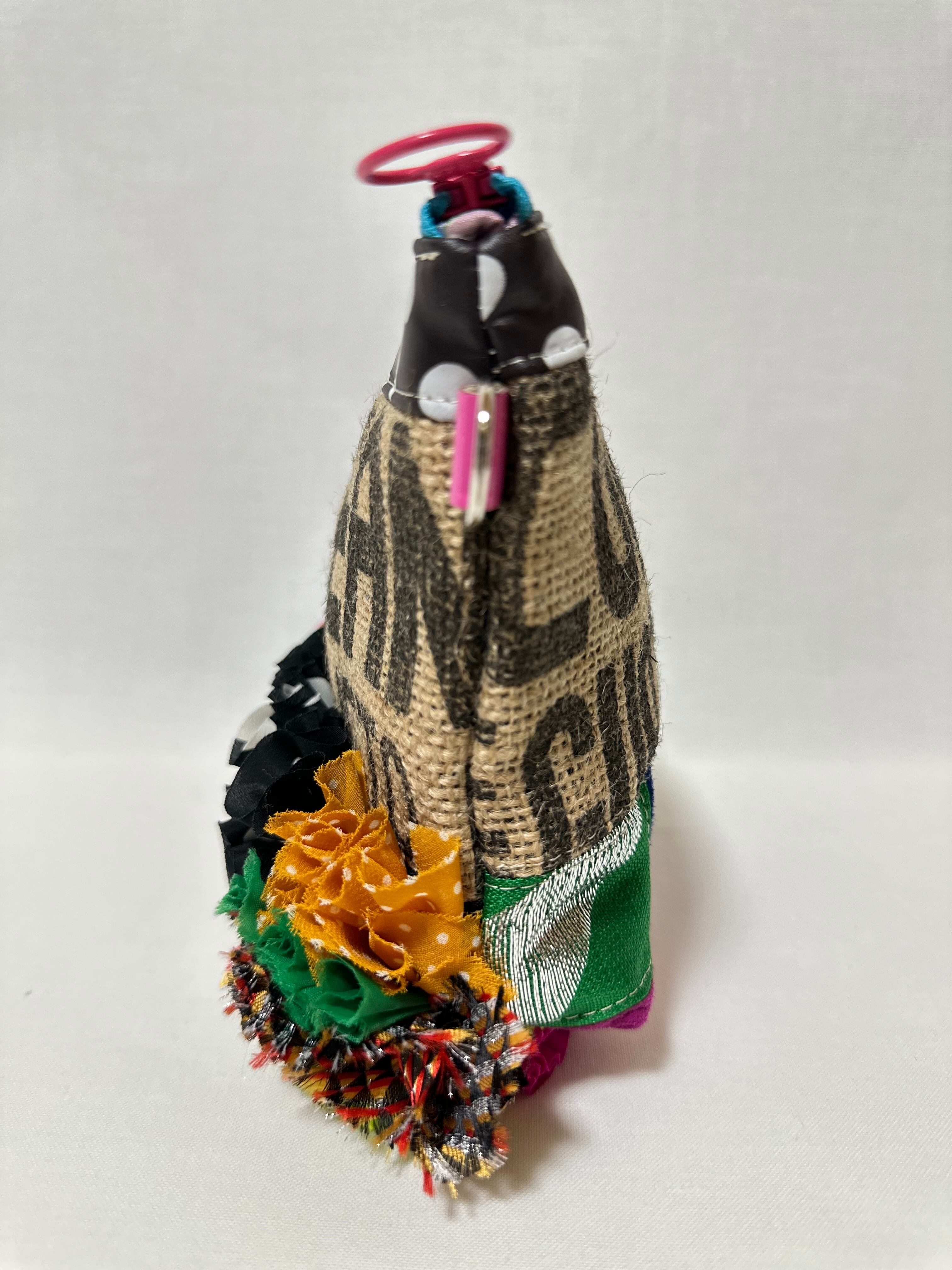 コーヒーの麻袋と様々な布地をフリルにし端材や新しい素材を組合せてパッチワークしました。