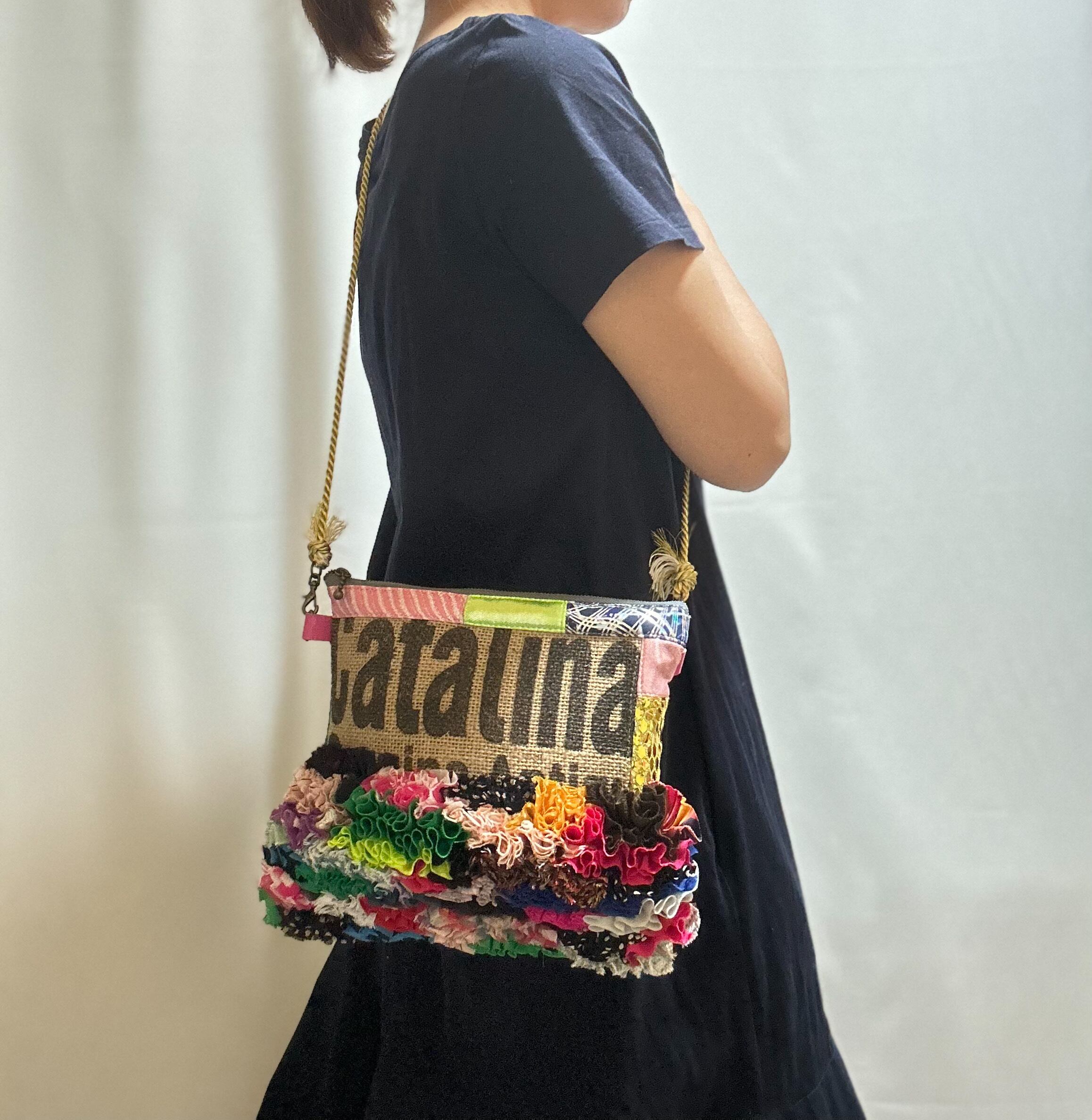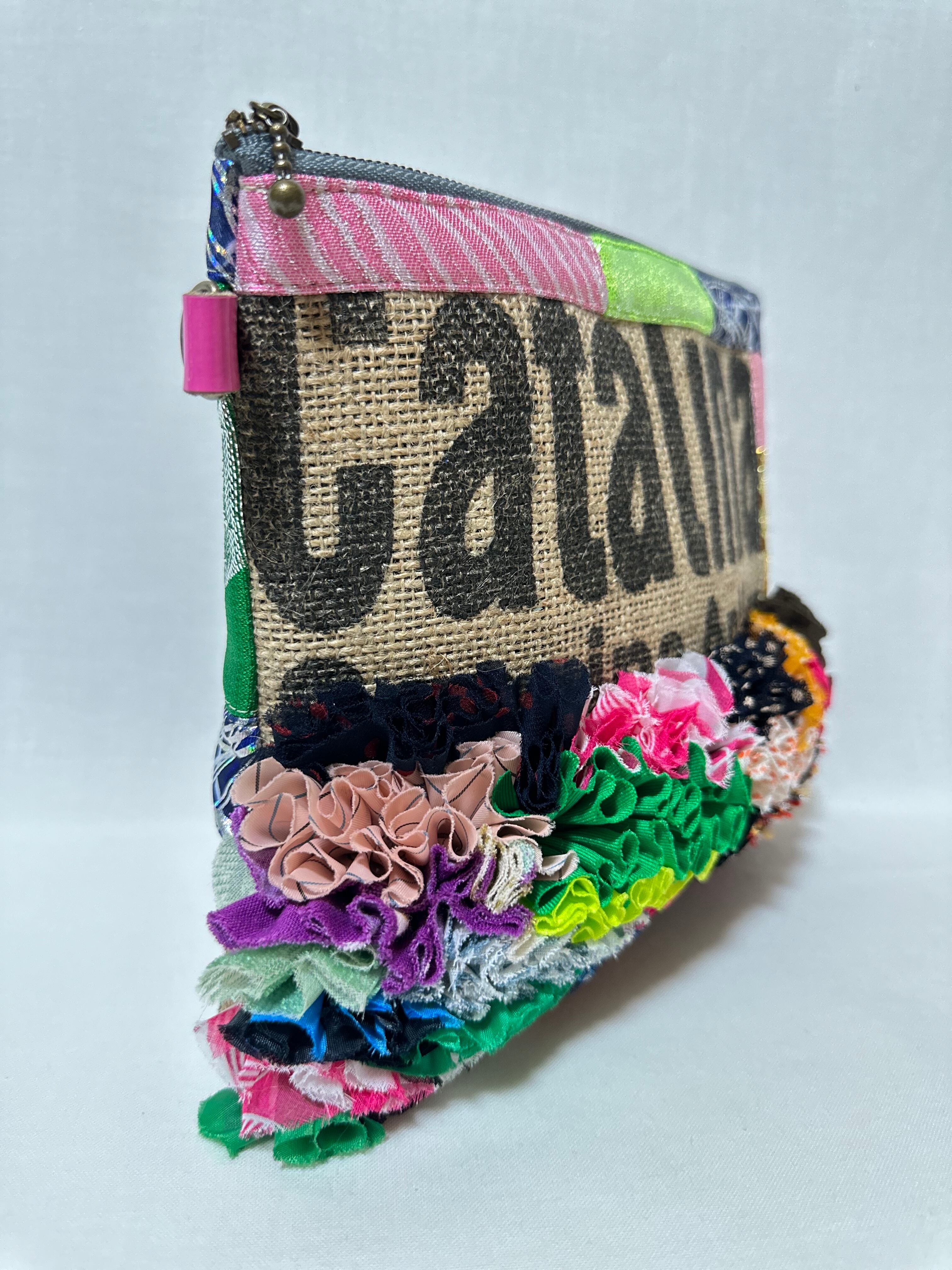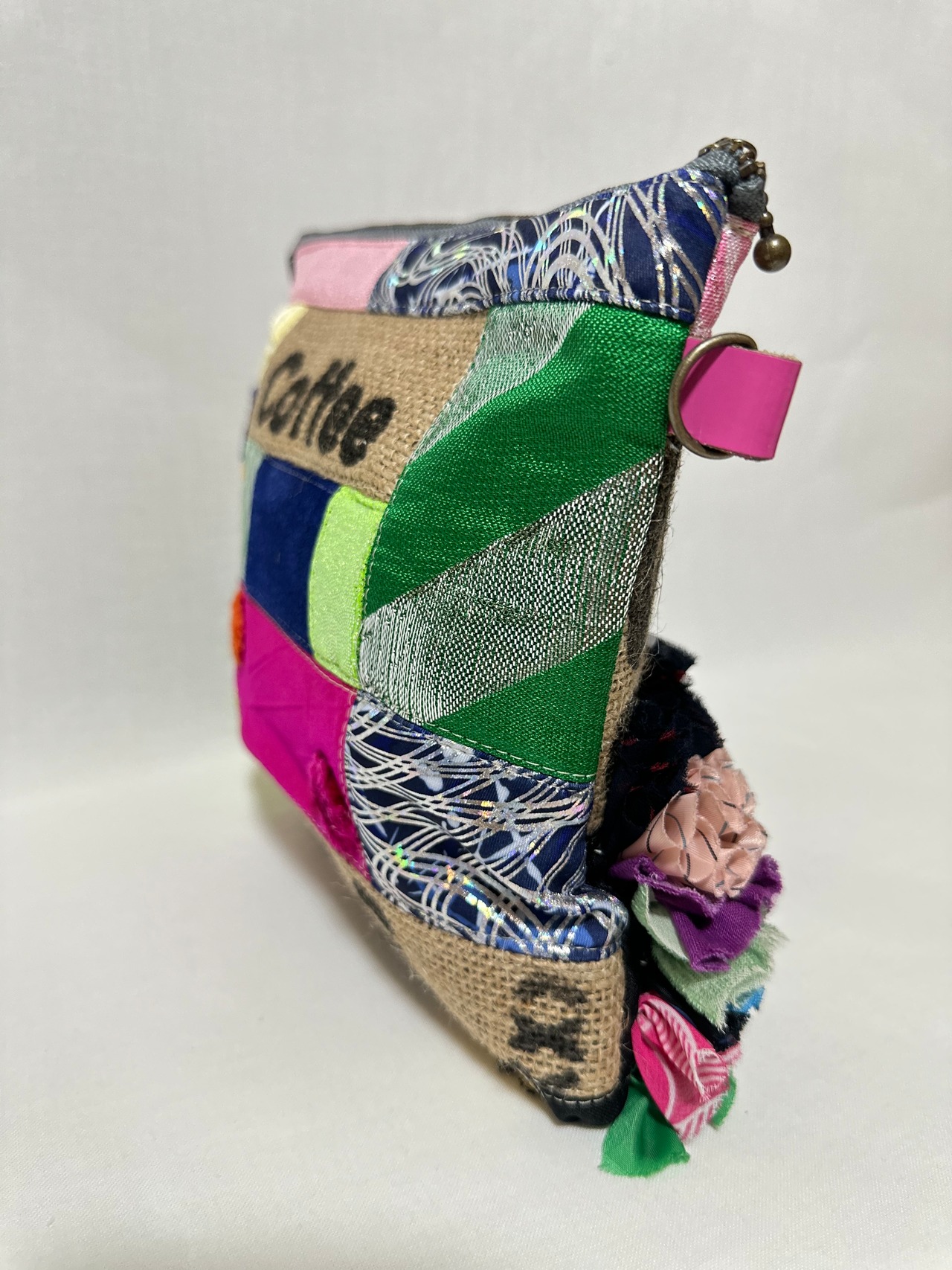 コーヒーの麻袋と様々な布地をフリルにし端材や新しい素材を組合せてパッチワークしました。