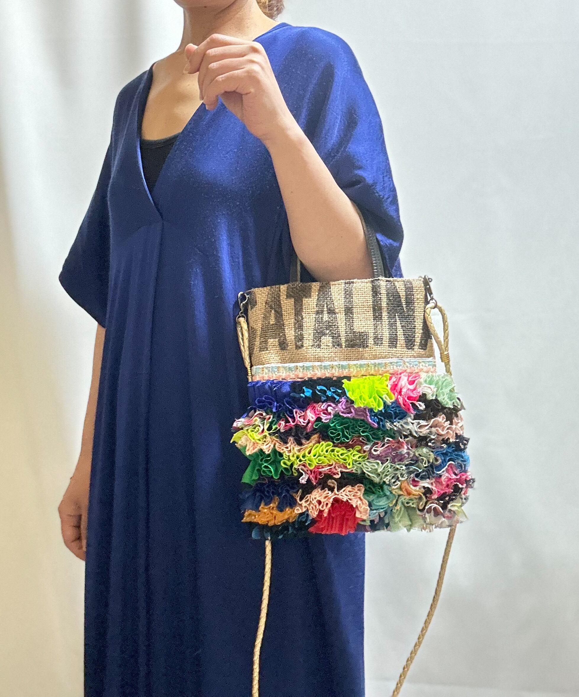 コーヒーの麻袋と様々な素材をフリルに施し端材やレザー・新しい素材を組合せパッチワークしました。