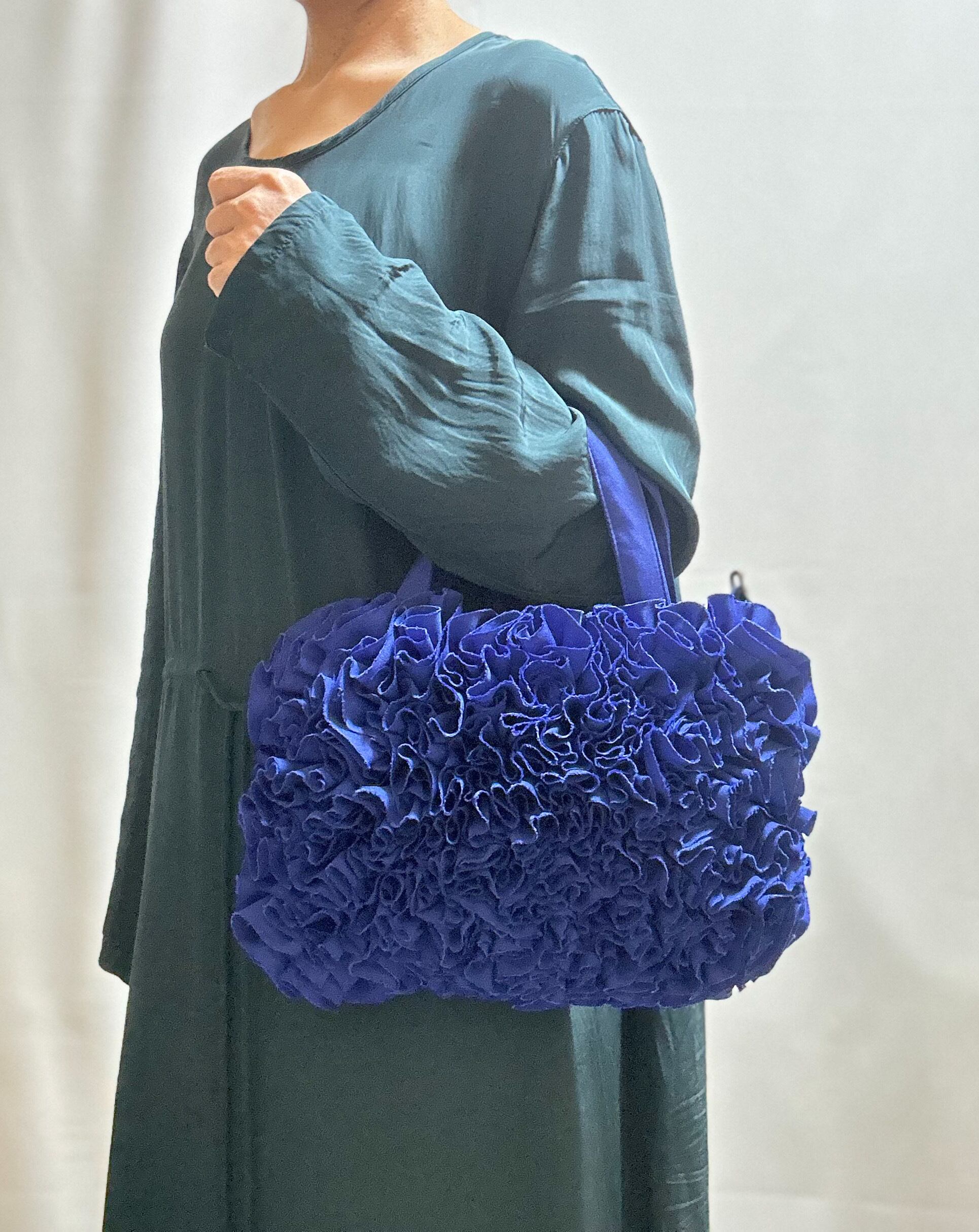 両面にギュギュっと詰まったブーケをイメージし、一つ一つお花の形にしながら手作業でフリルを施したお花が特徴的なトートバックにミニタイプが登場です。