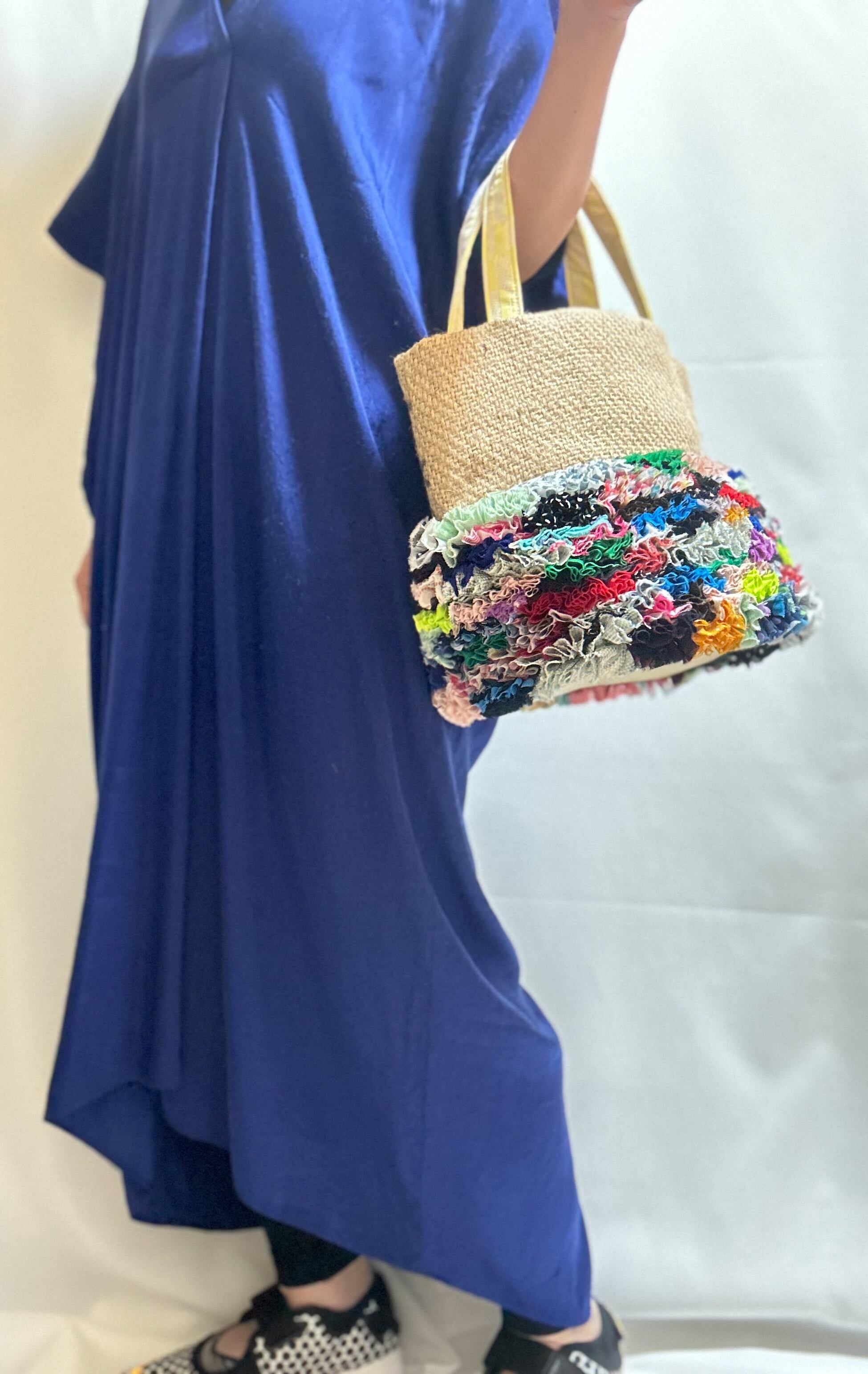 様々な布地をフリフリに施し、コーヒーの麻袋と組み合わせたバッグです。