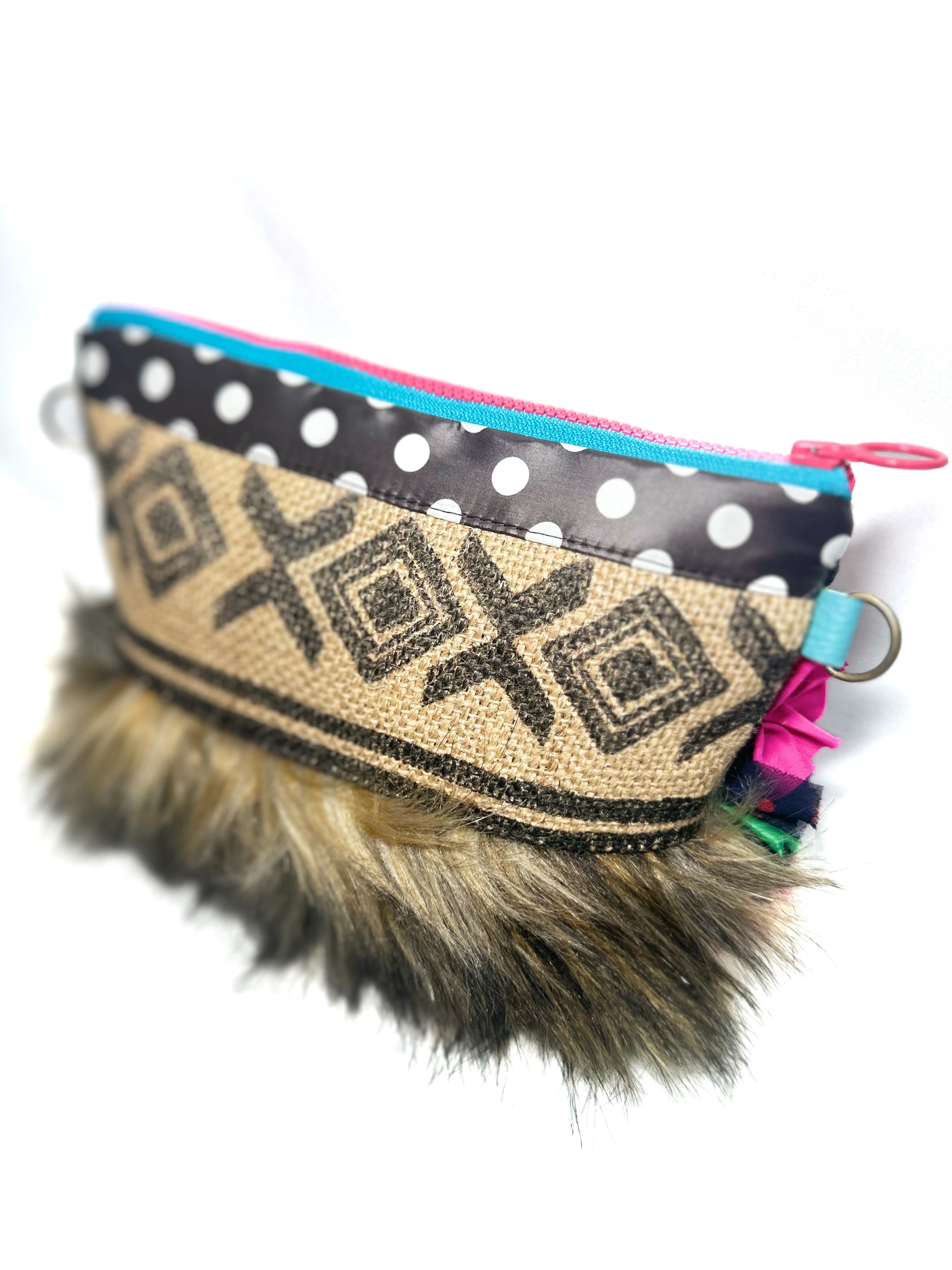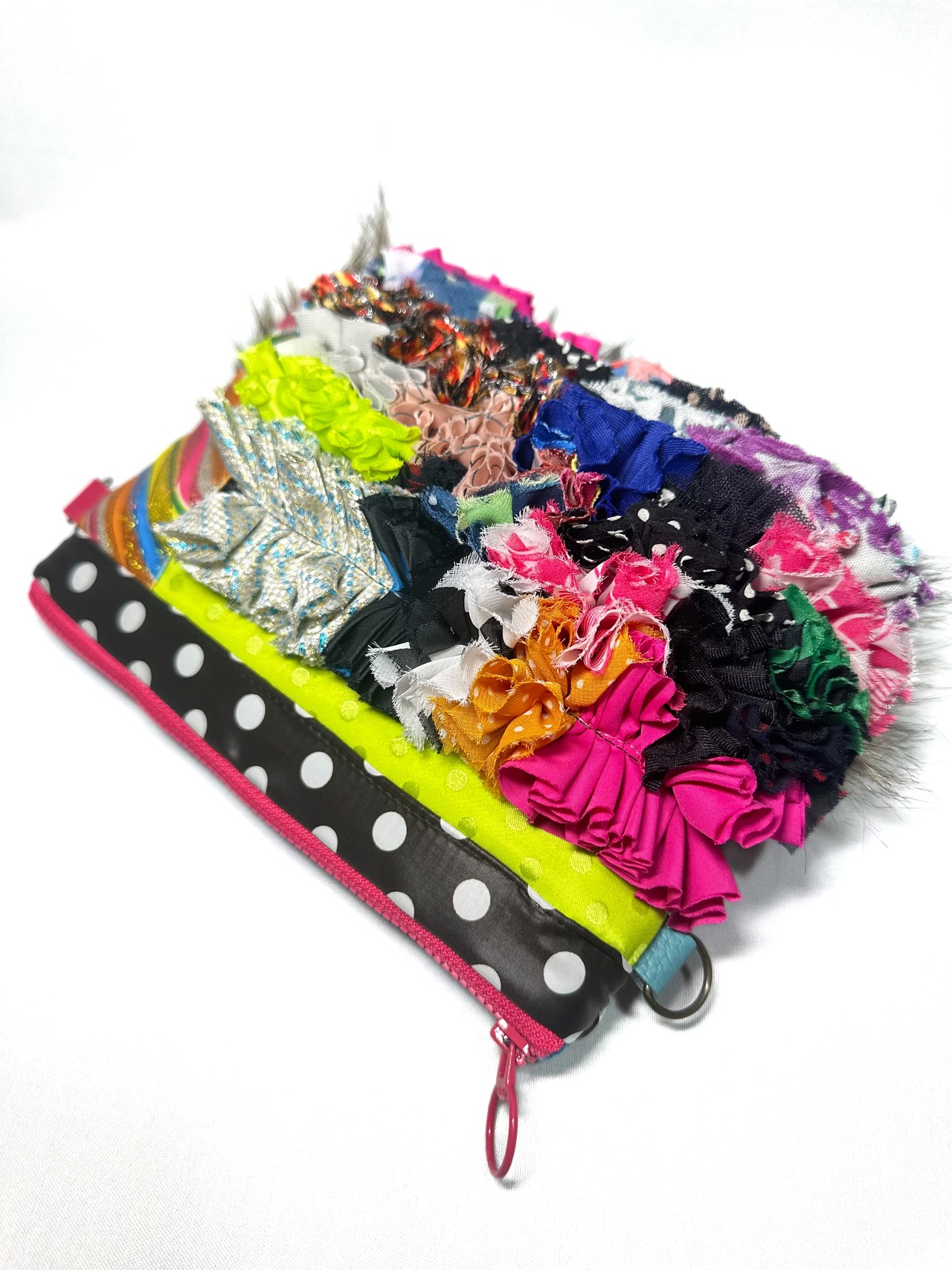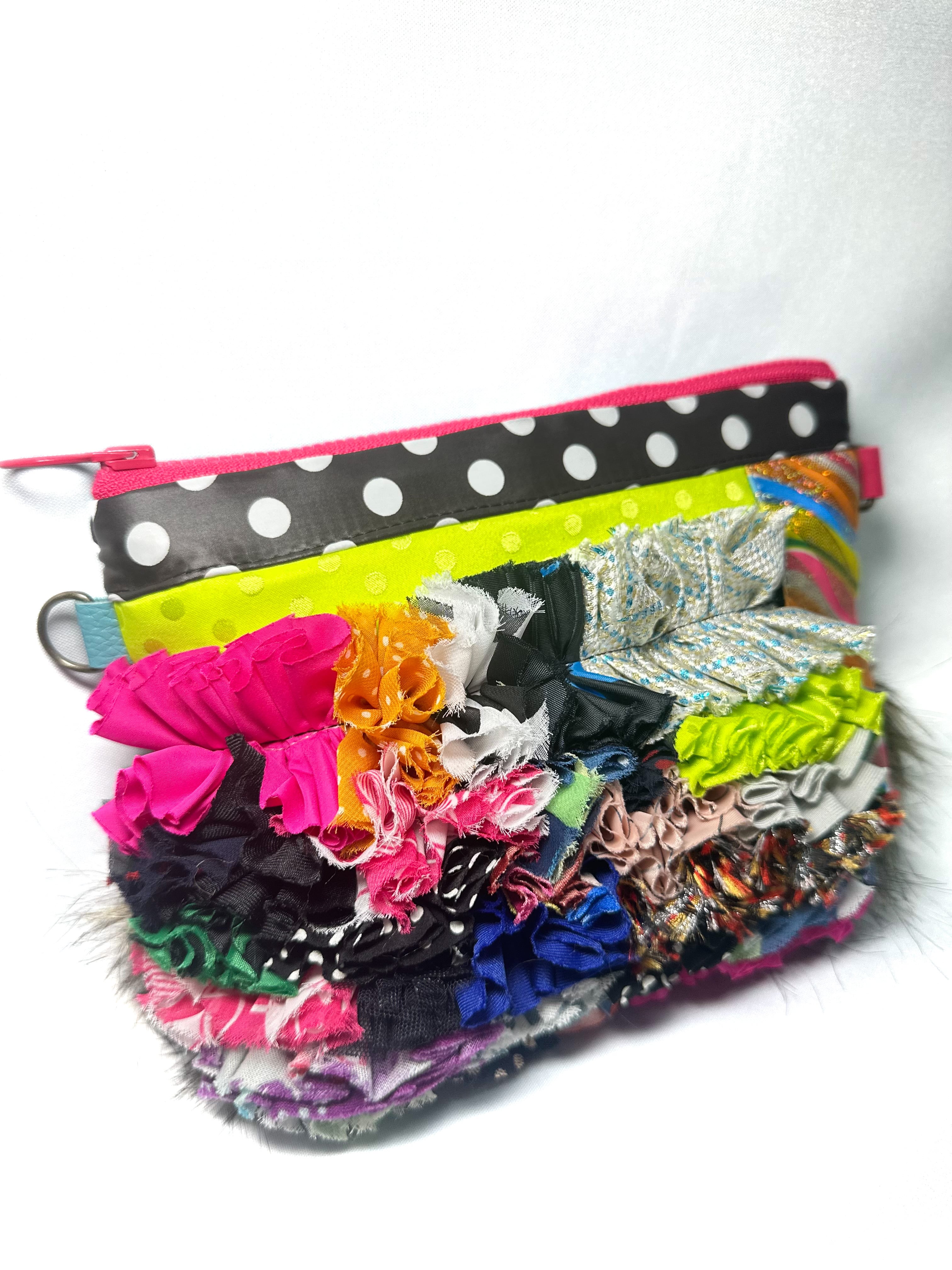 a Linden:tree オリジナルのサスティナブルアイテムで取り外し可能のショルダーが付いたカラフルなフリフリが可愛いポーチです。