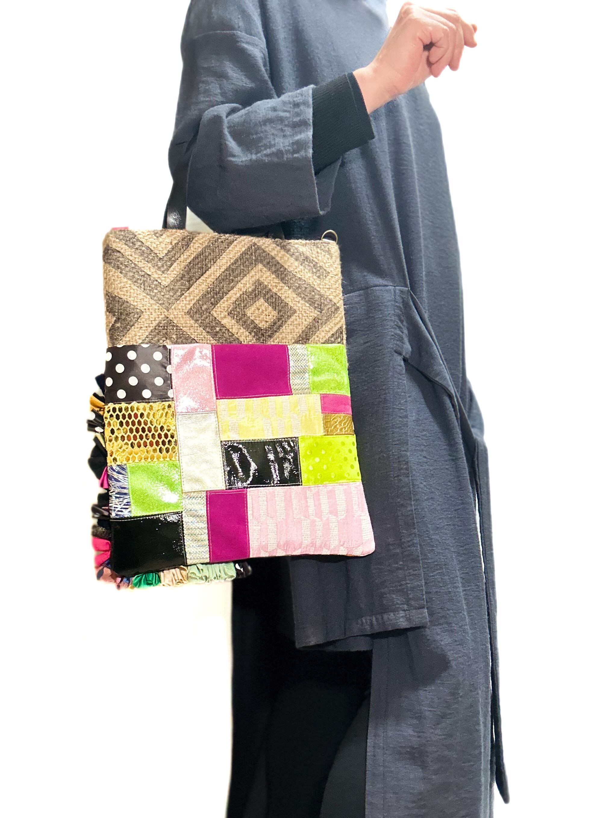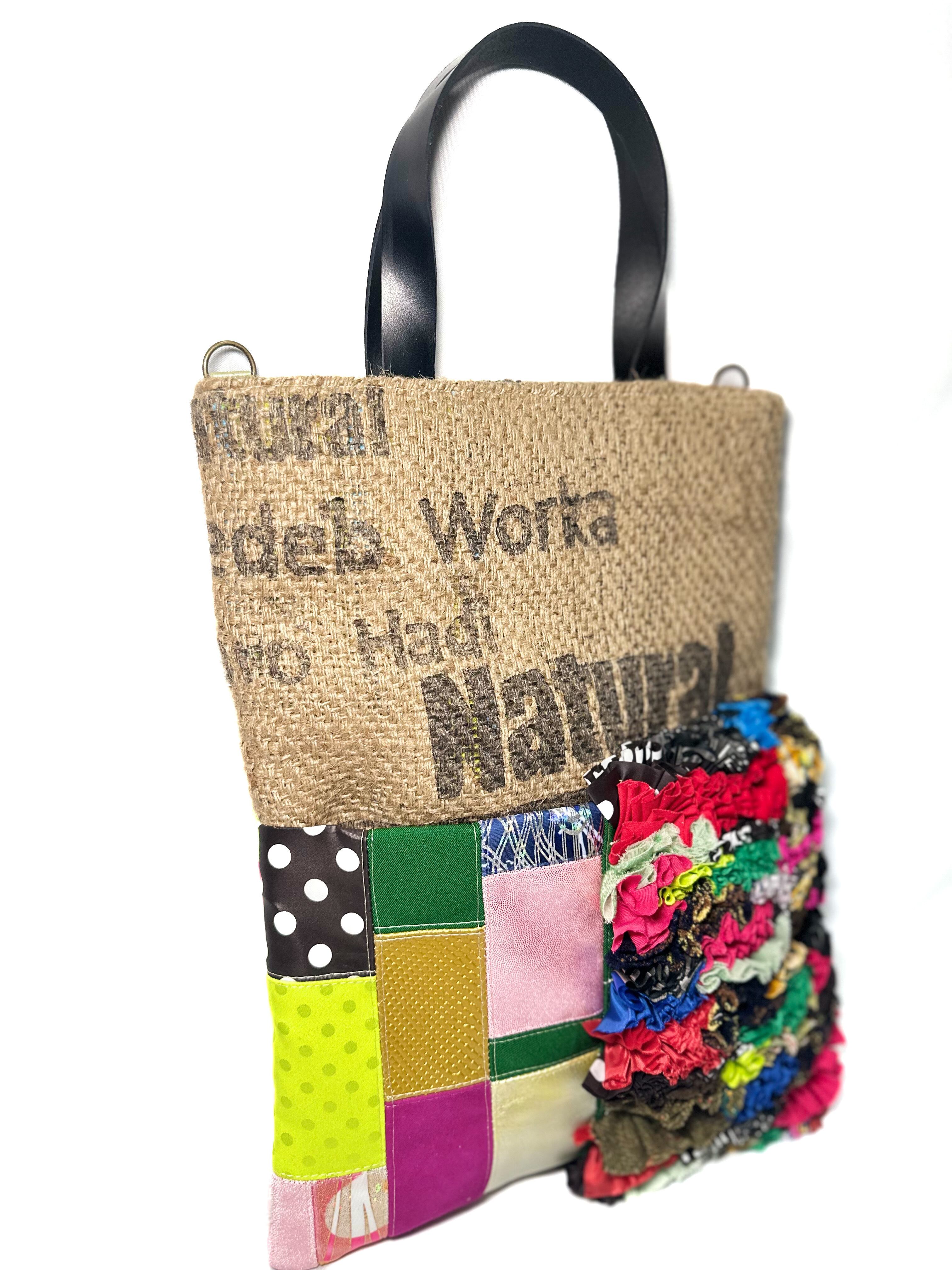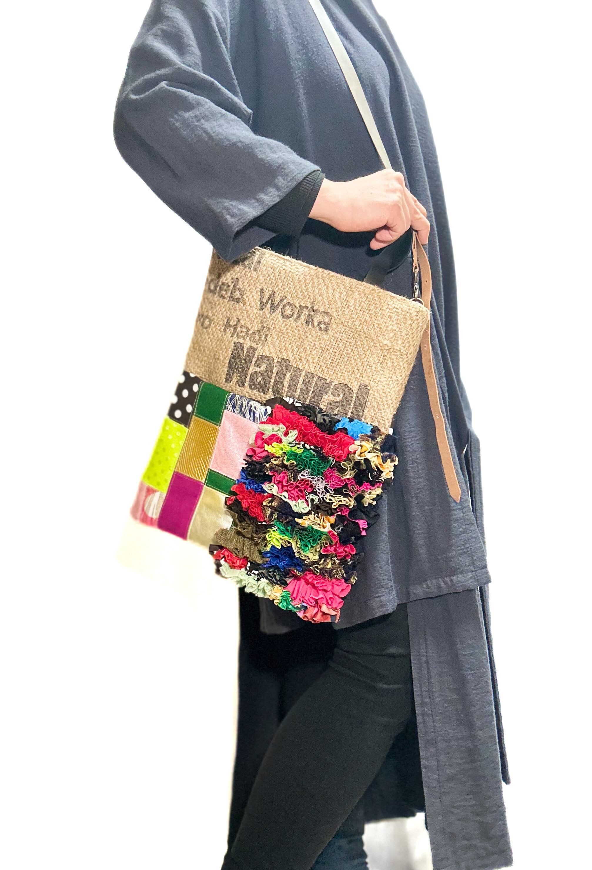 様々な布地をフリフリにしたり端材の革や様々な素材をコーヒーの麻袋と組み合わせパッチワークしたカラフルでデコラティブな他にはないデザインに仕上げました。