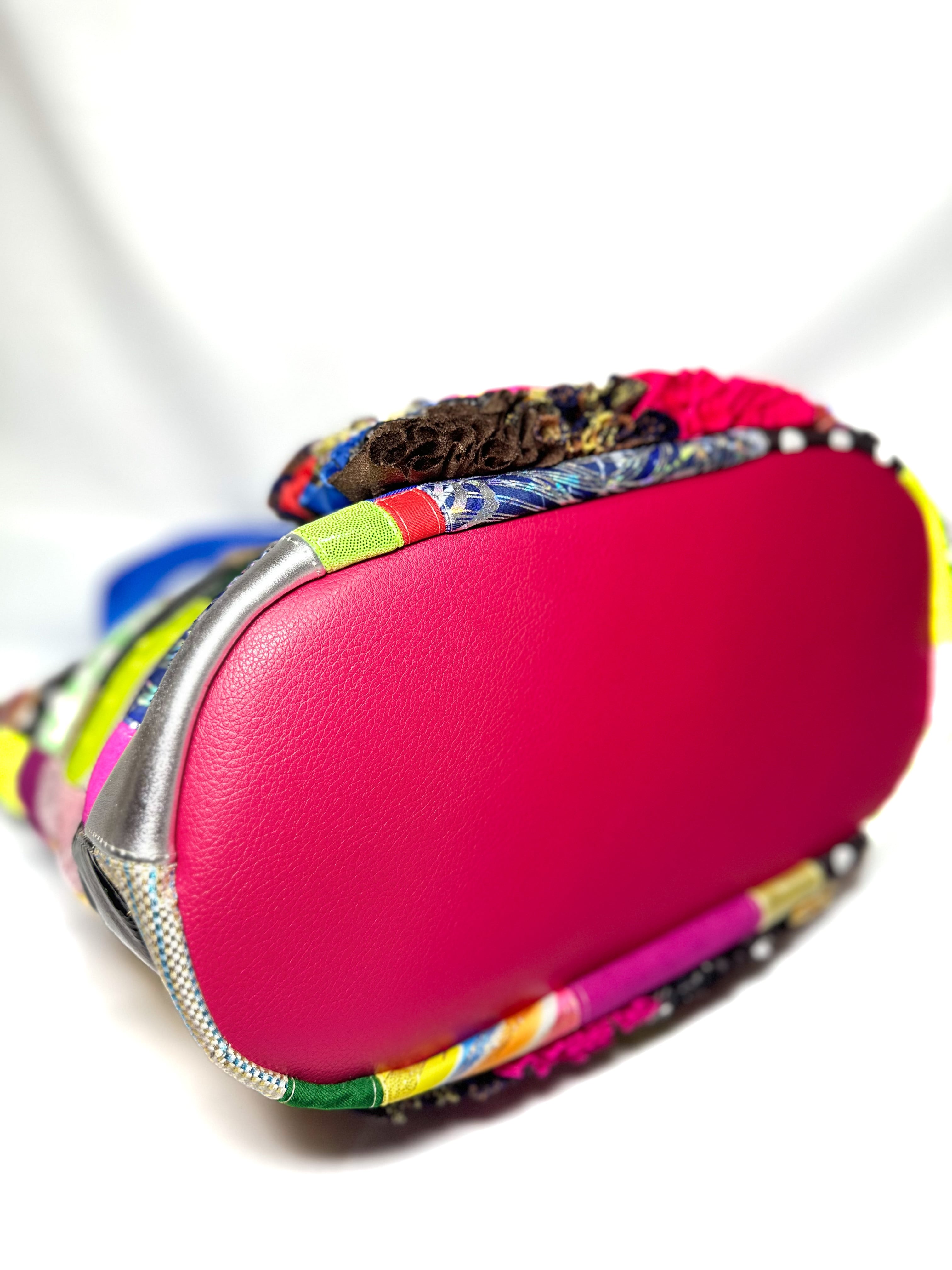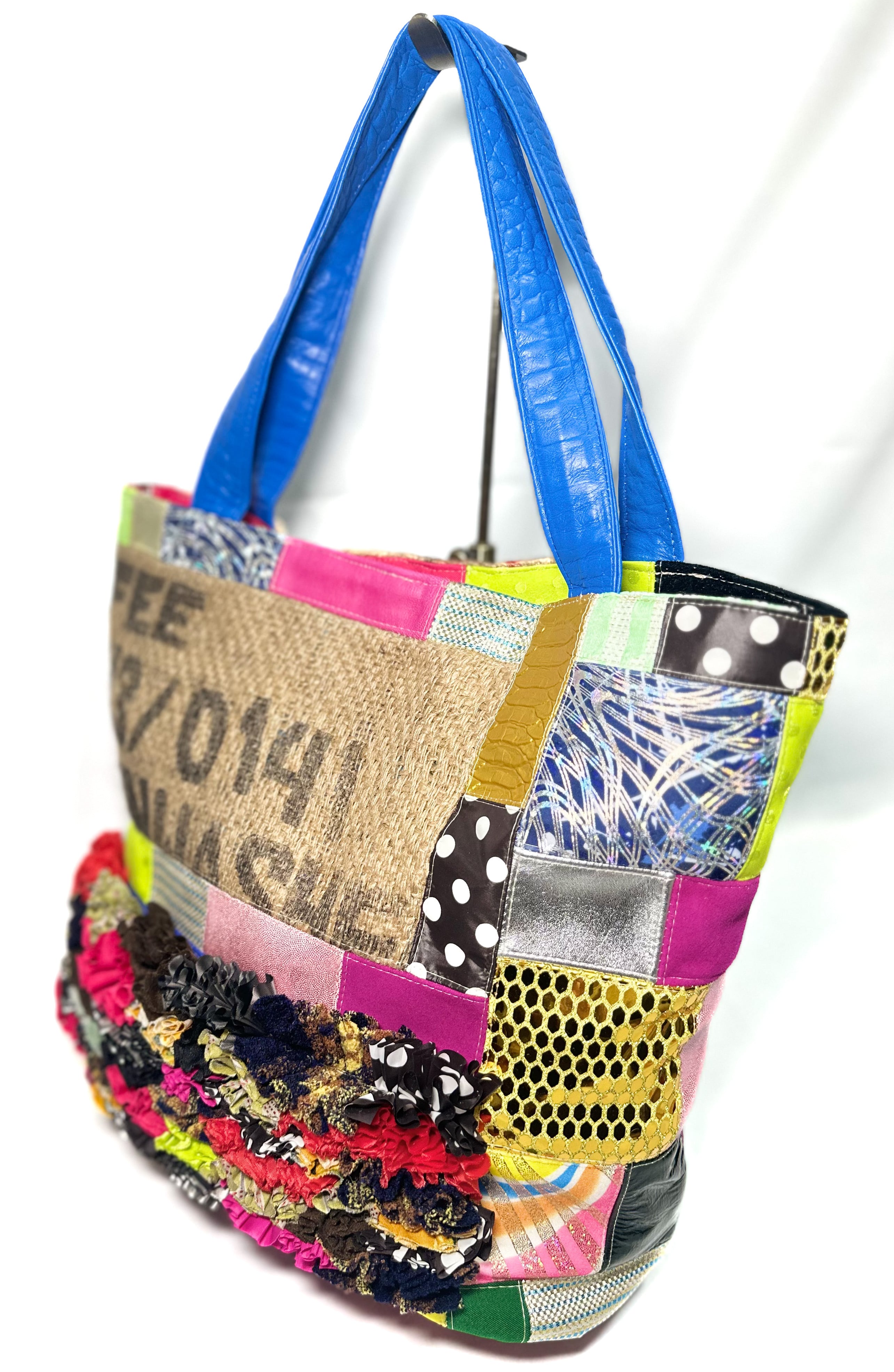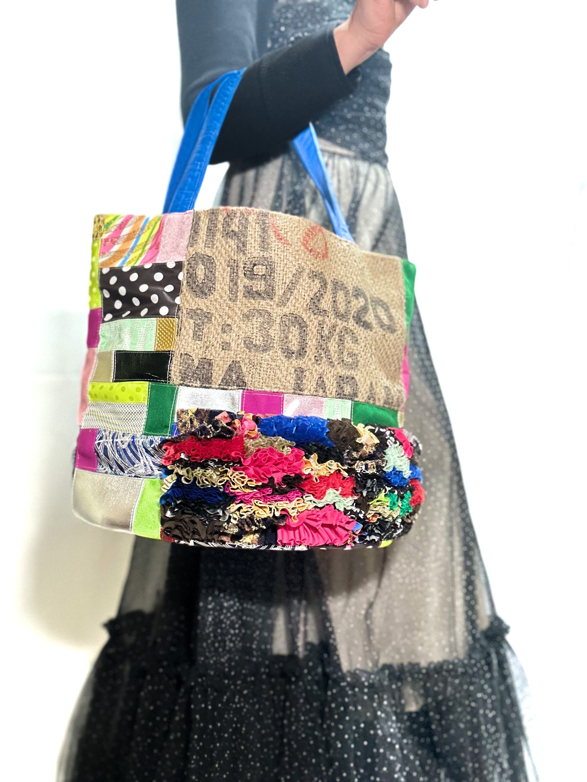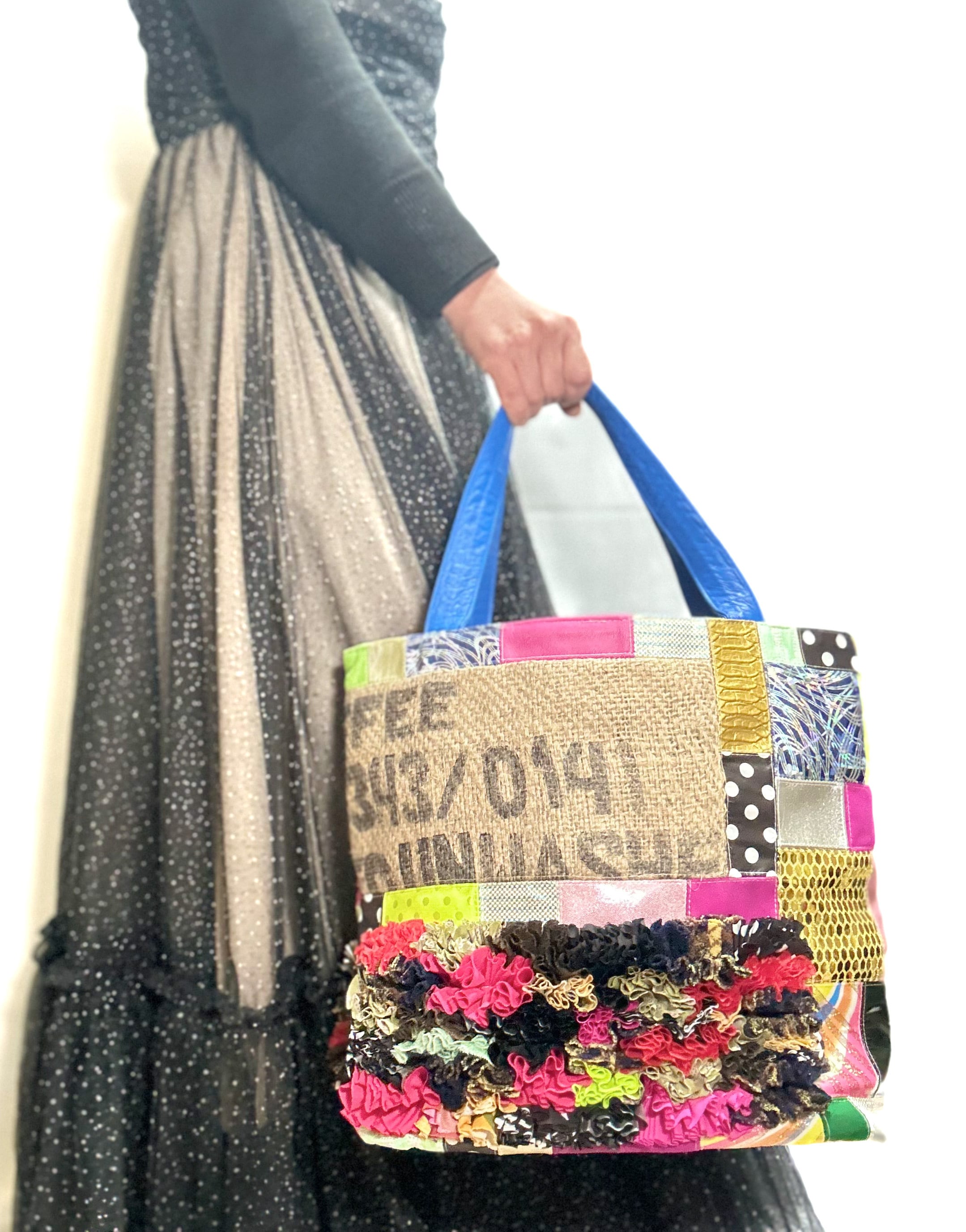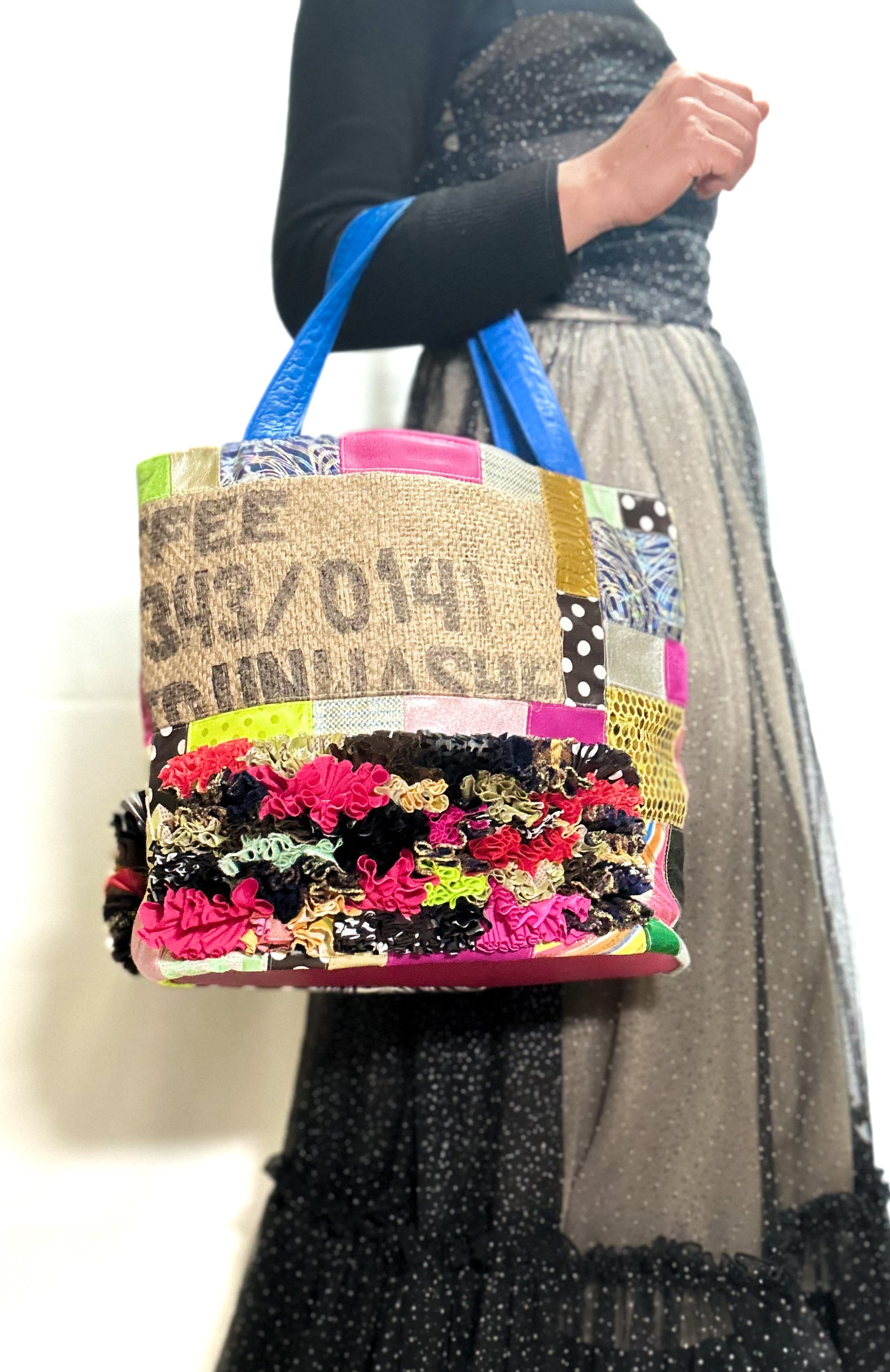 様々な布地をフリルにし、ひとつの布に仕上げ特徴的な端材の革や新しい素材などをコーヒーの麻袋と組み合わせてパッチワークにした他にはないデザインのカラフルなトートバッグです。