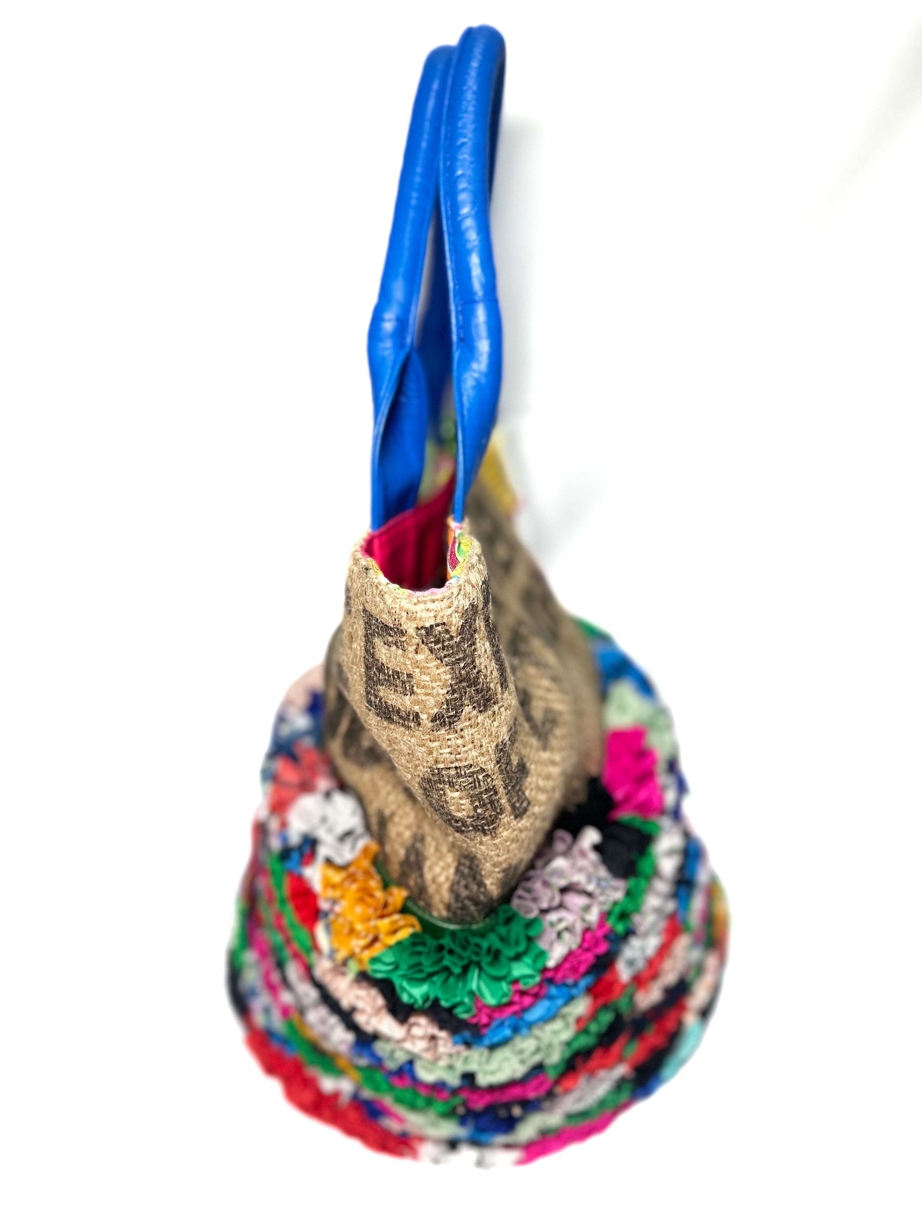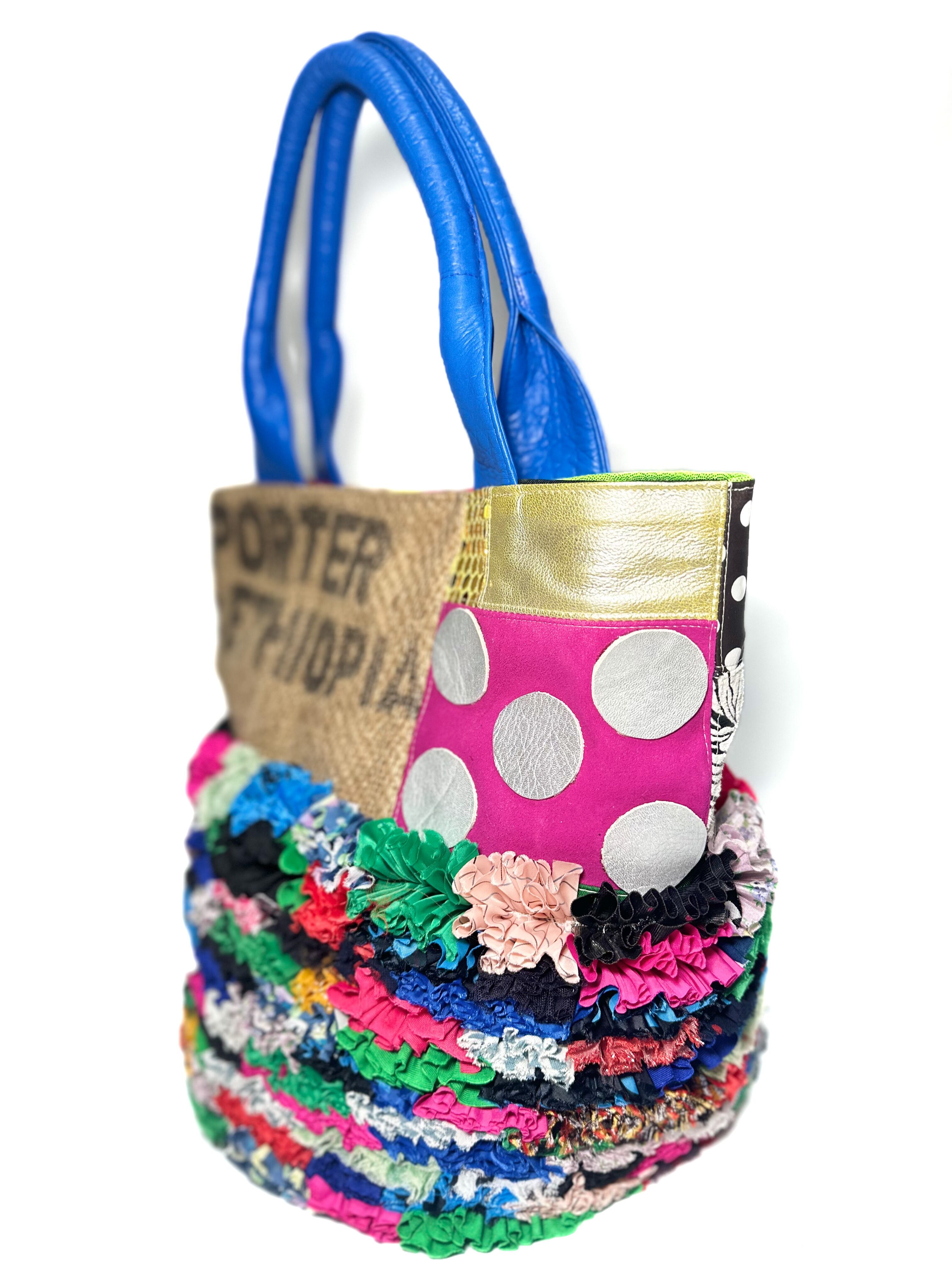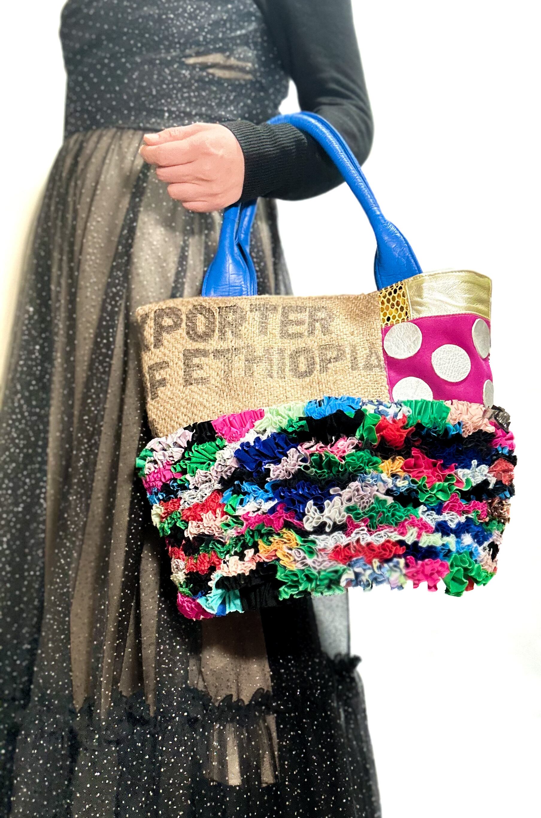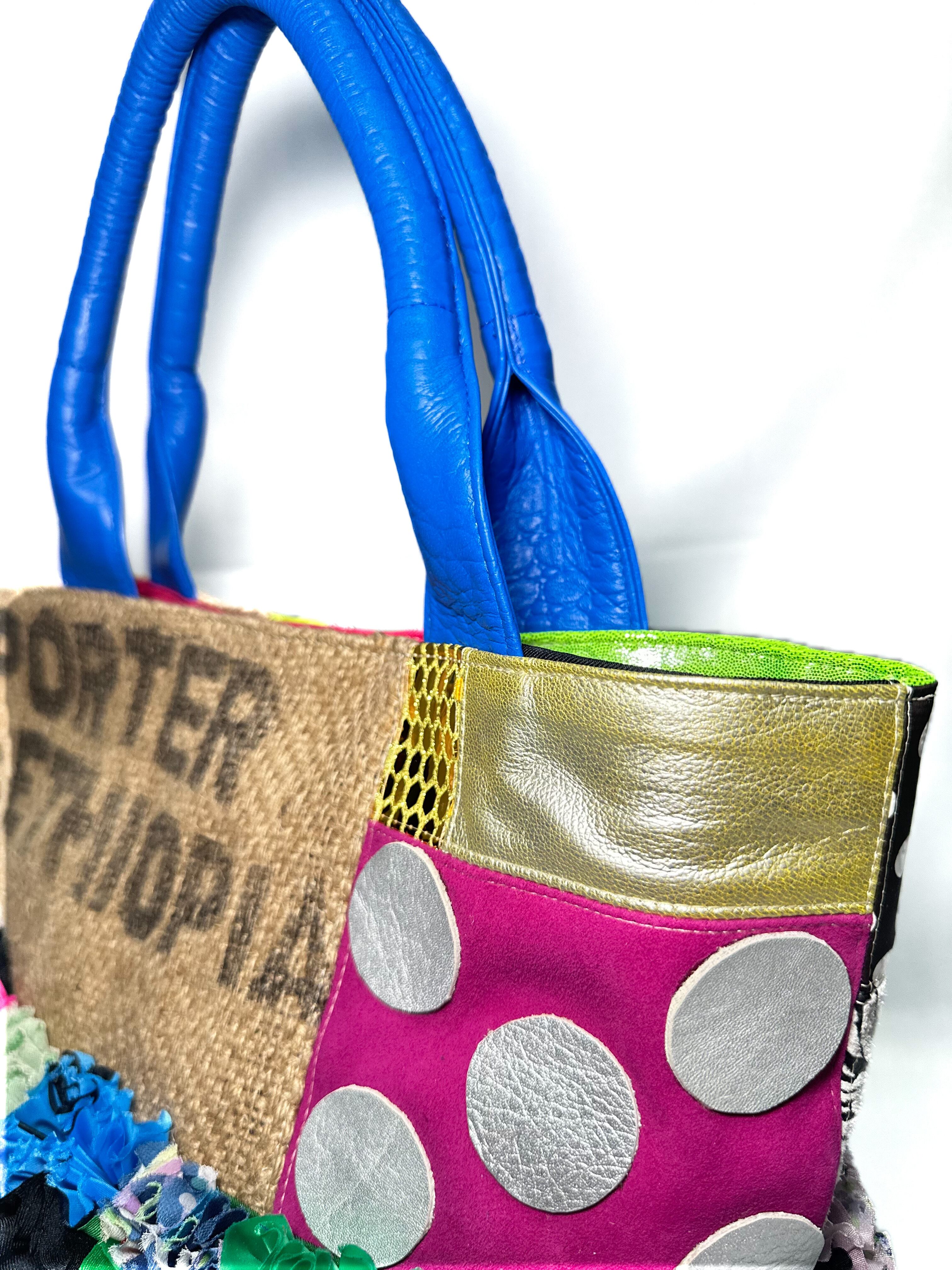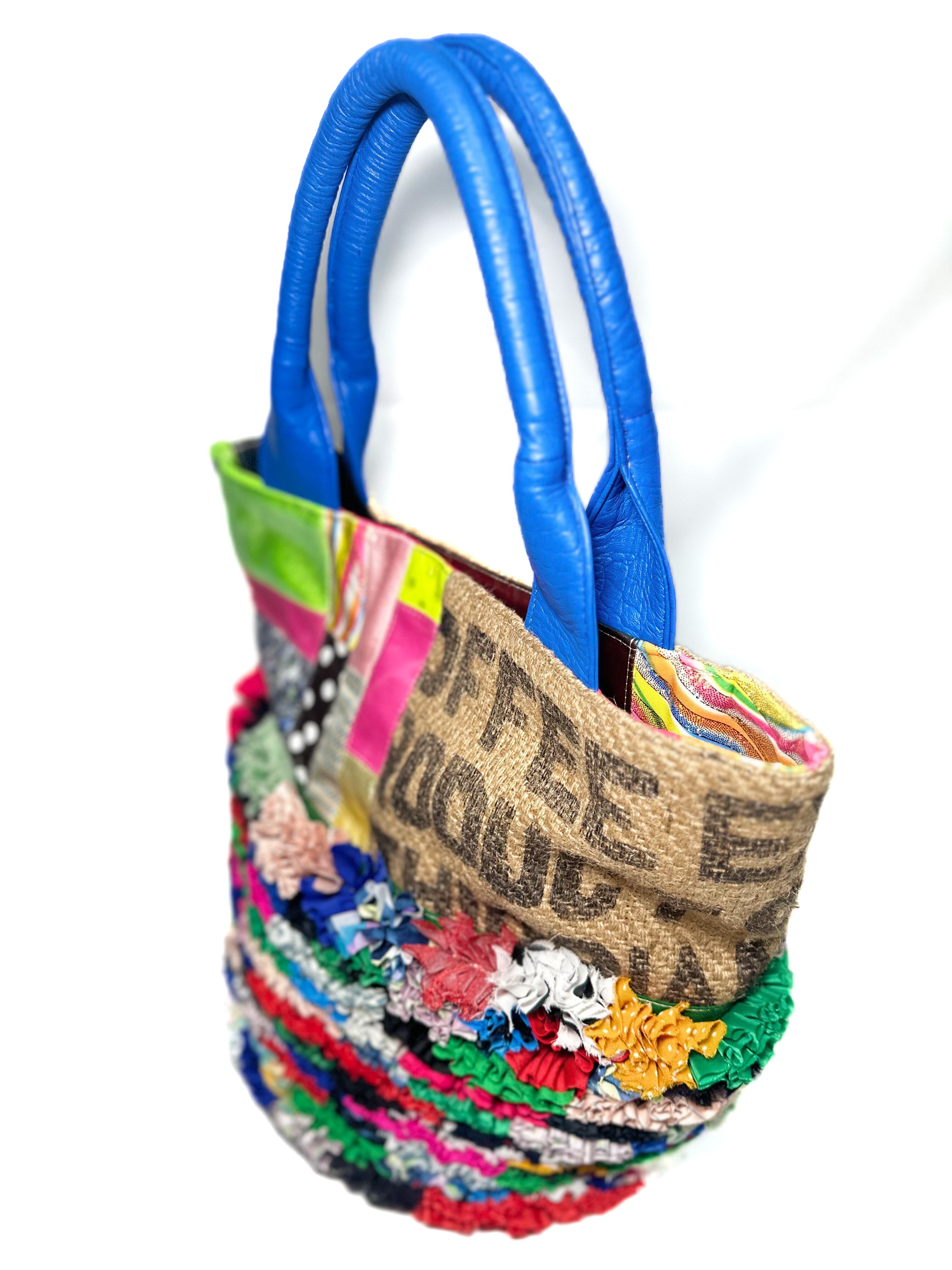 個性的な端材の革や新しい素材などをコーヒーの麻袋と組み合わせてパッチワークにし他にはないデザインのカラフルでデコラティブなトートバッグです。