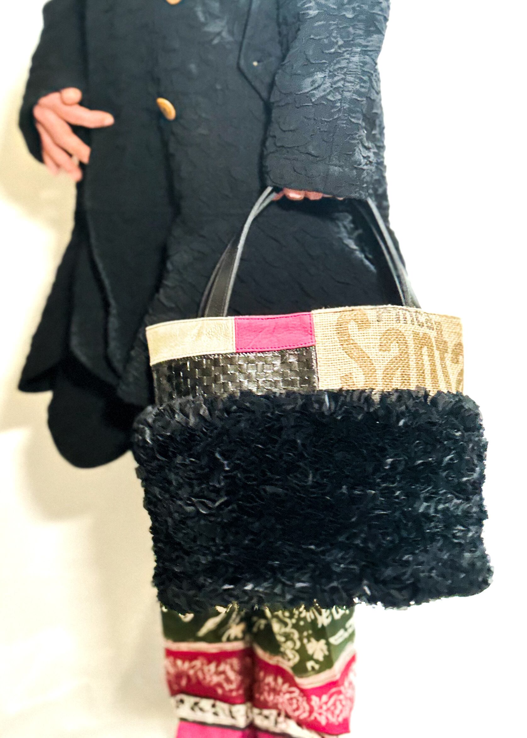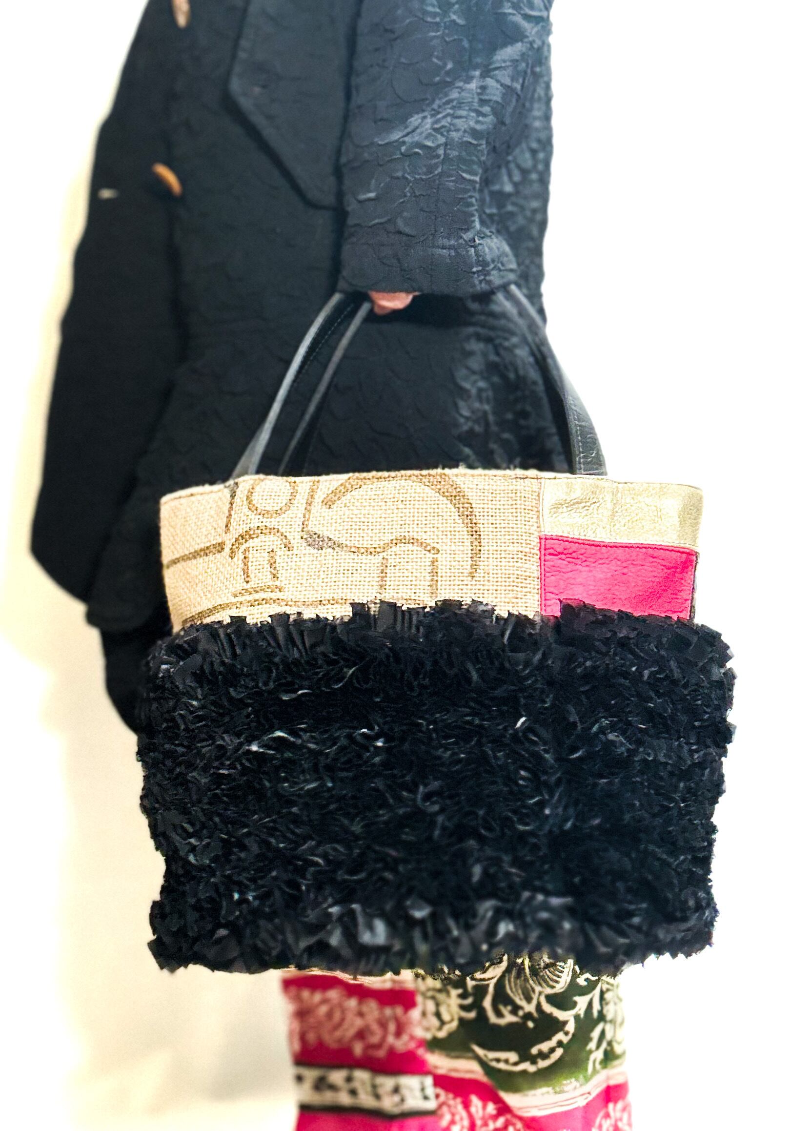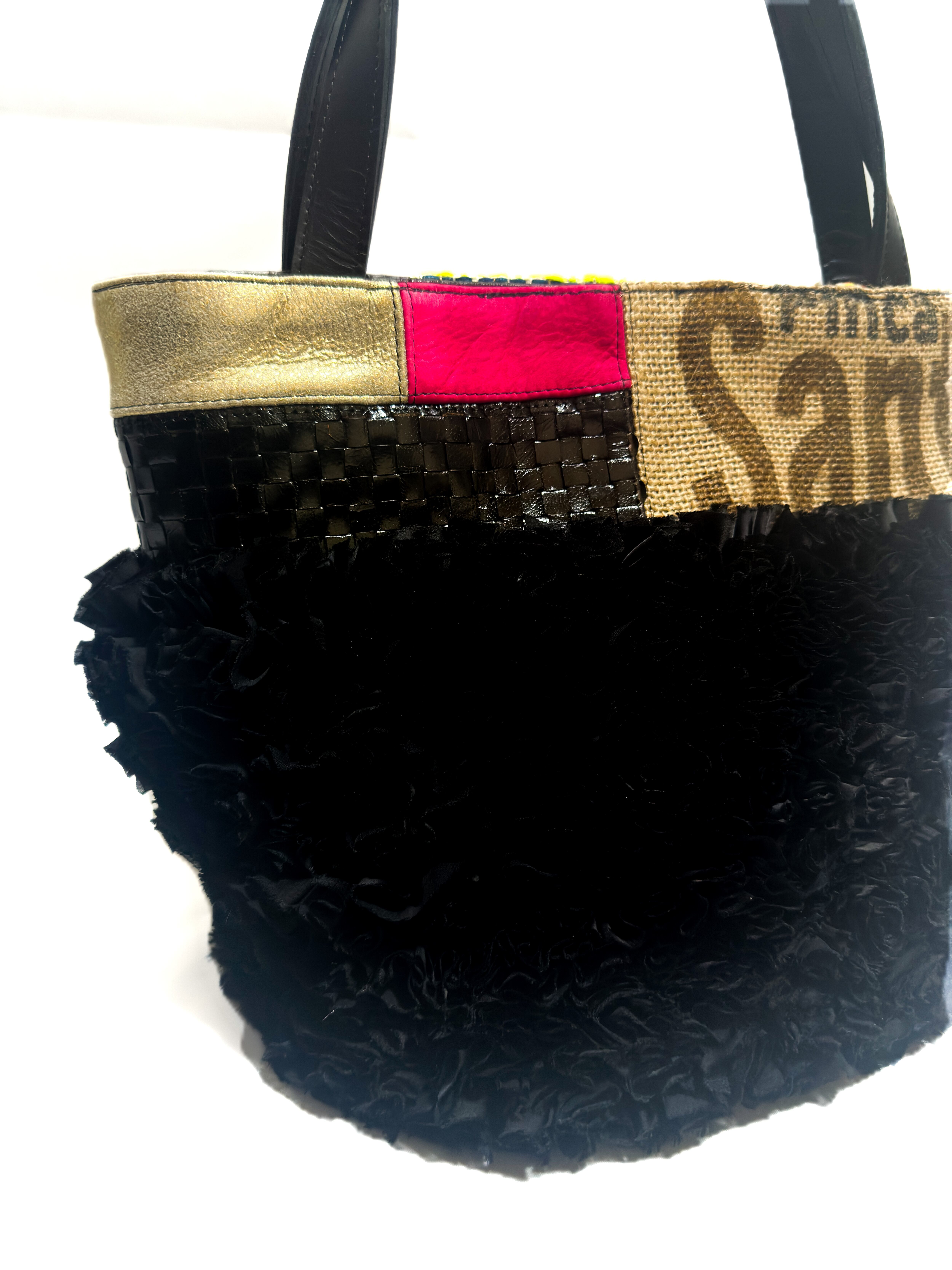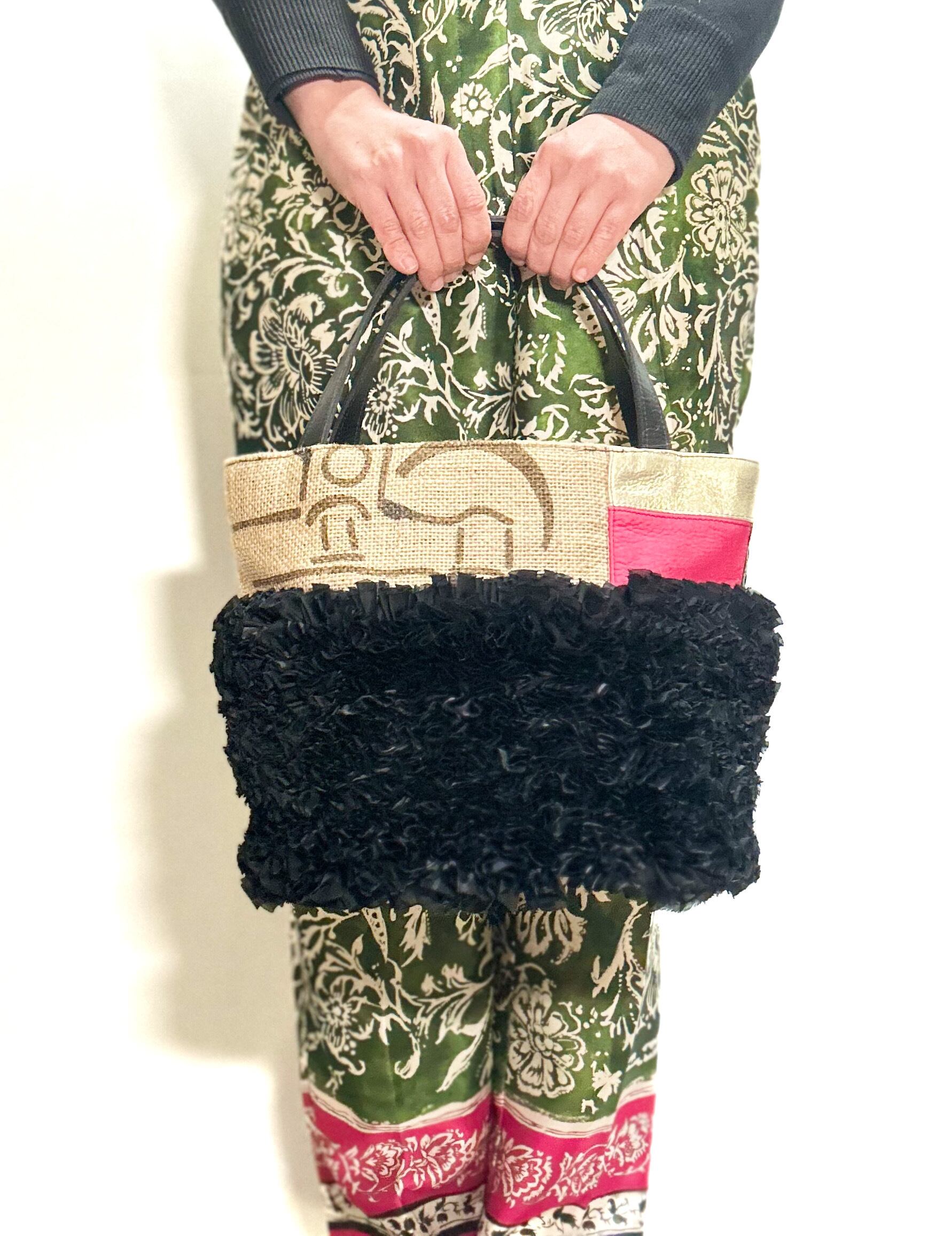 個性的な端材の革や新しい素材などをコーヒーの麻袋と組み合わせてパッチワークにし他にはないデザインのデコラティブなトートバッグです。