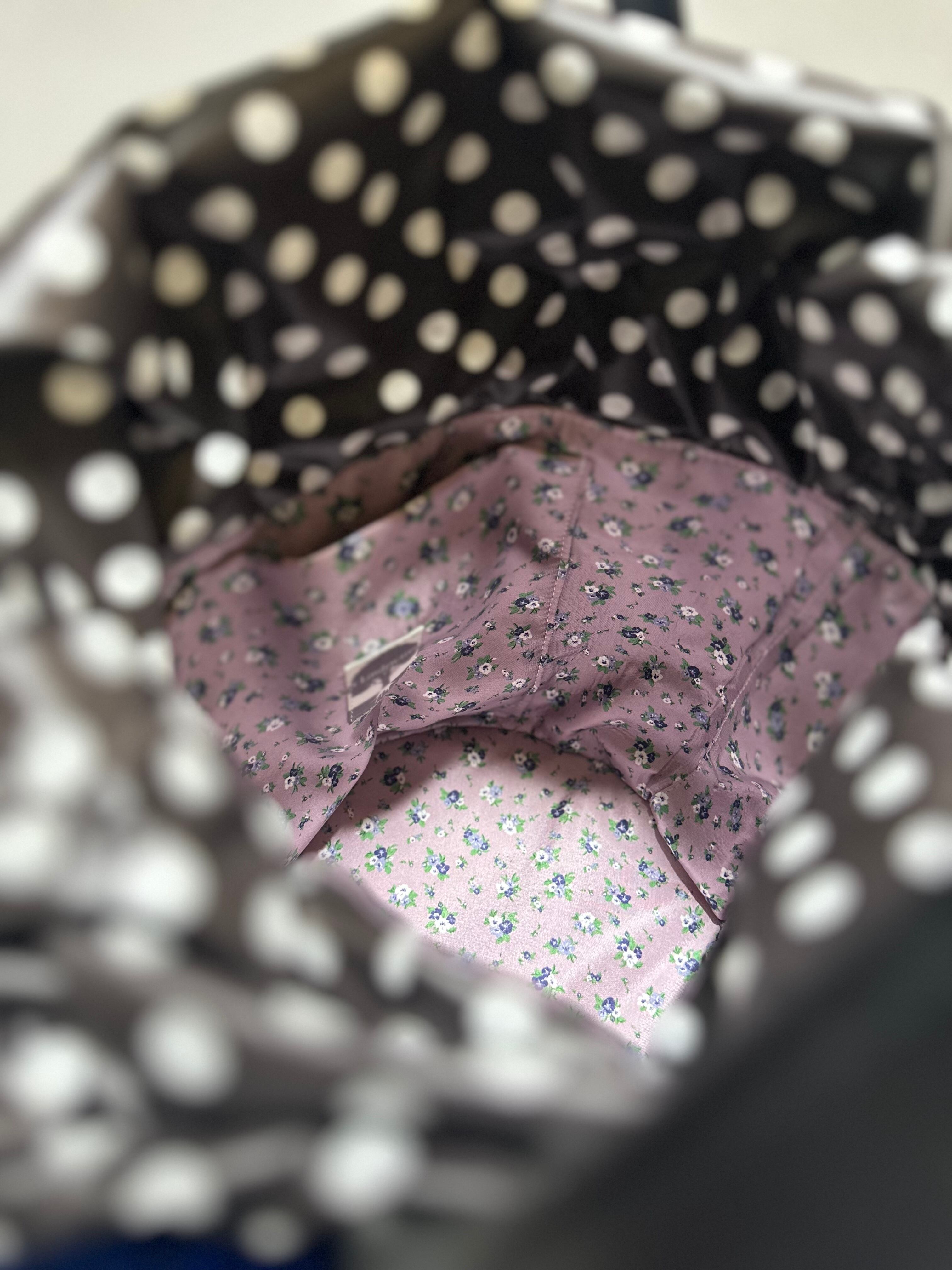 裏の縁部分のパッチワークや底もドットになっていて、チラッとしか見えない部分も可愛いデザインになってます。
