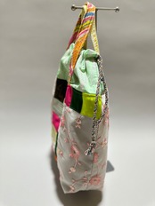 お花がついたチュールや個性的なテキスタイルをパッチワークしエコバッグとして製作しましたがメインで使用していただいても可愛いデザインです。