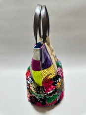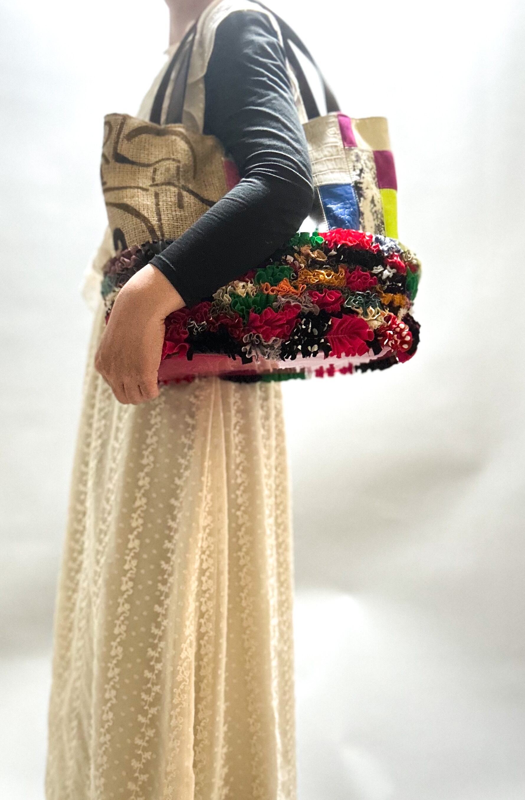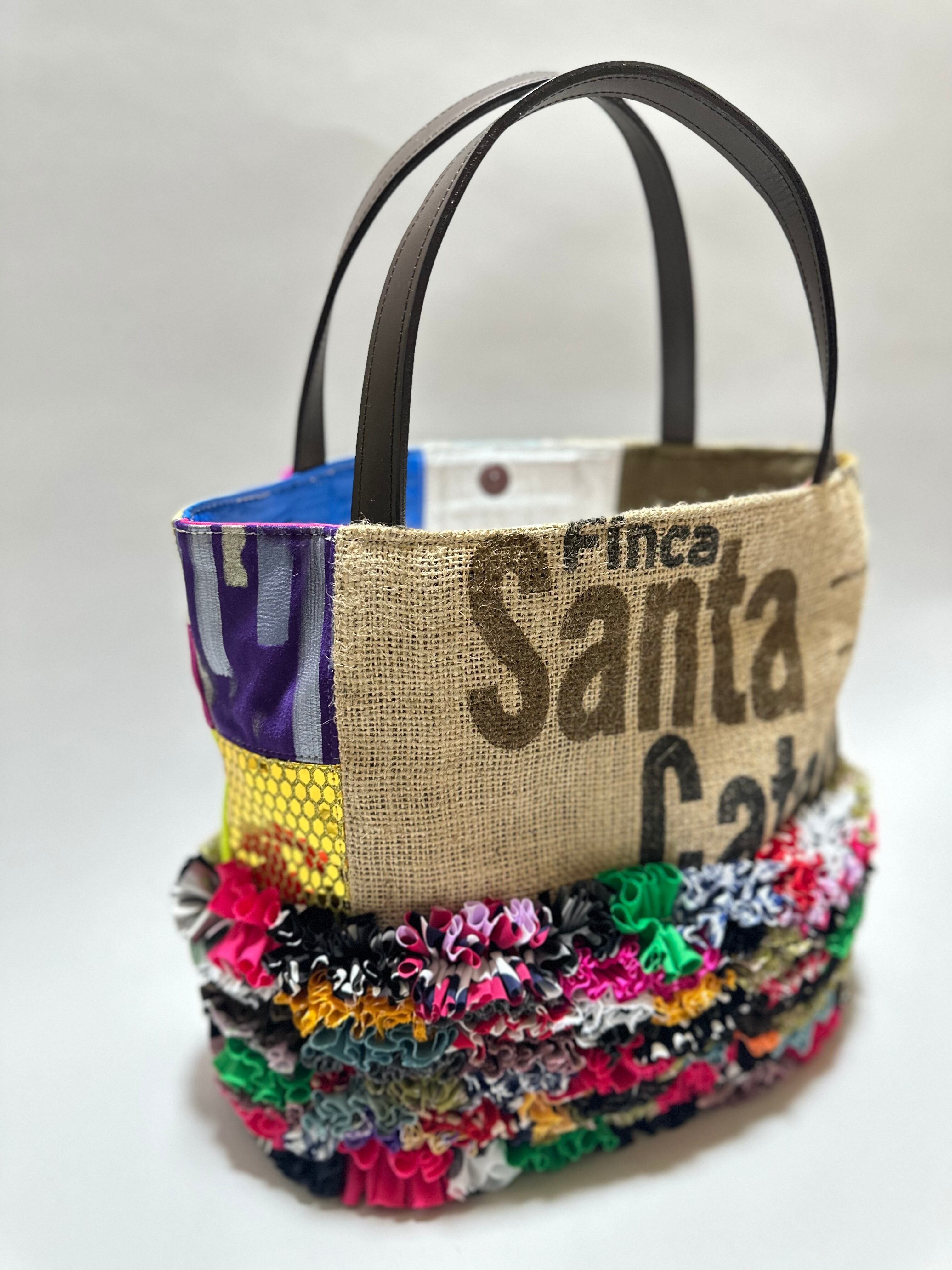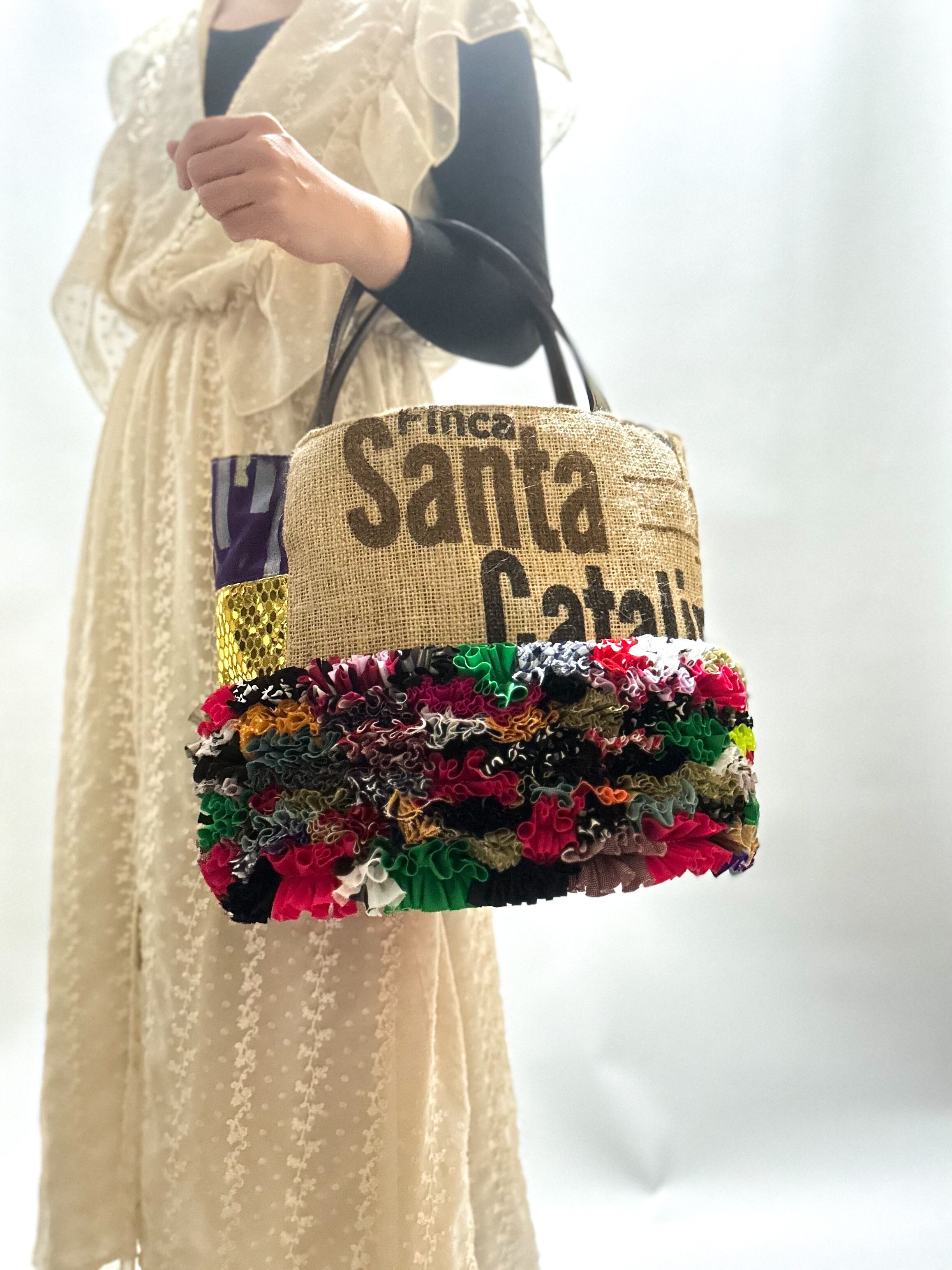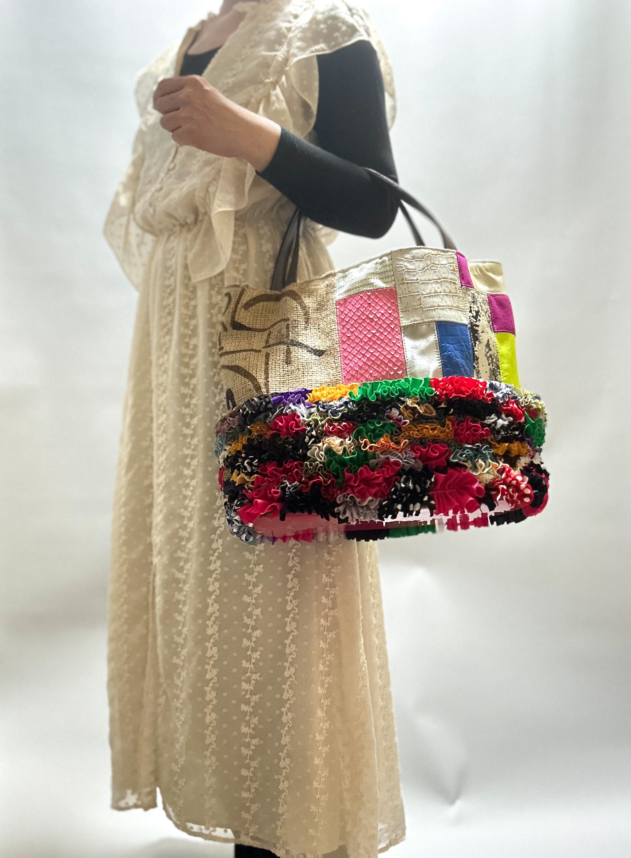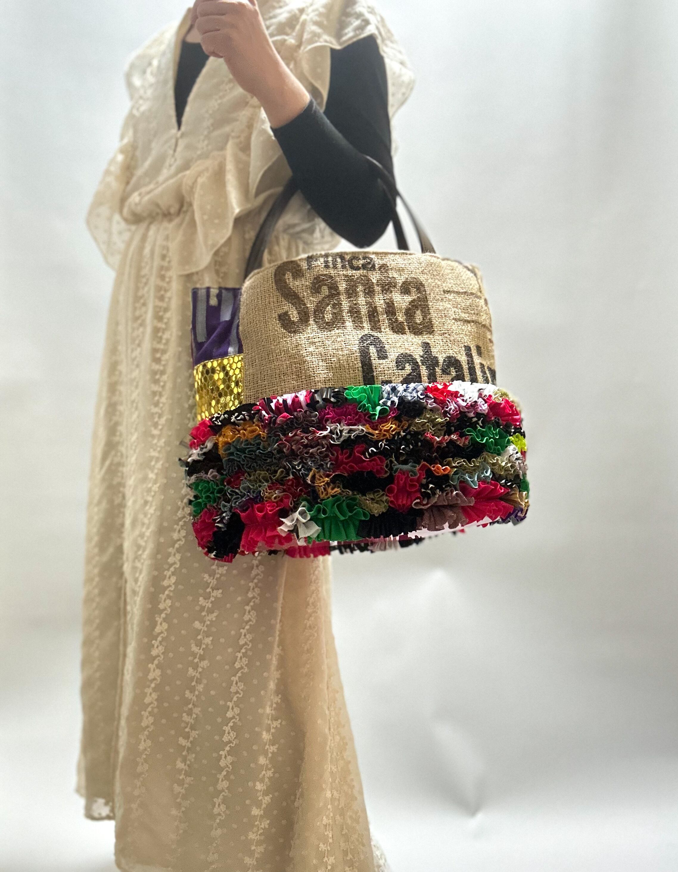 様々な布地をフリルにし、ひとつの布に仕上げ特徴的な端材の革や新しい素材などをコーヒーの麻袋と組み合わせてパッチワークにした他にはないデザインのカラフルなトートバッグです。