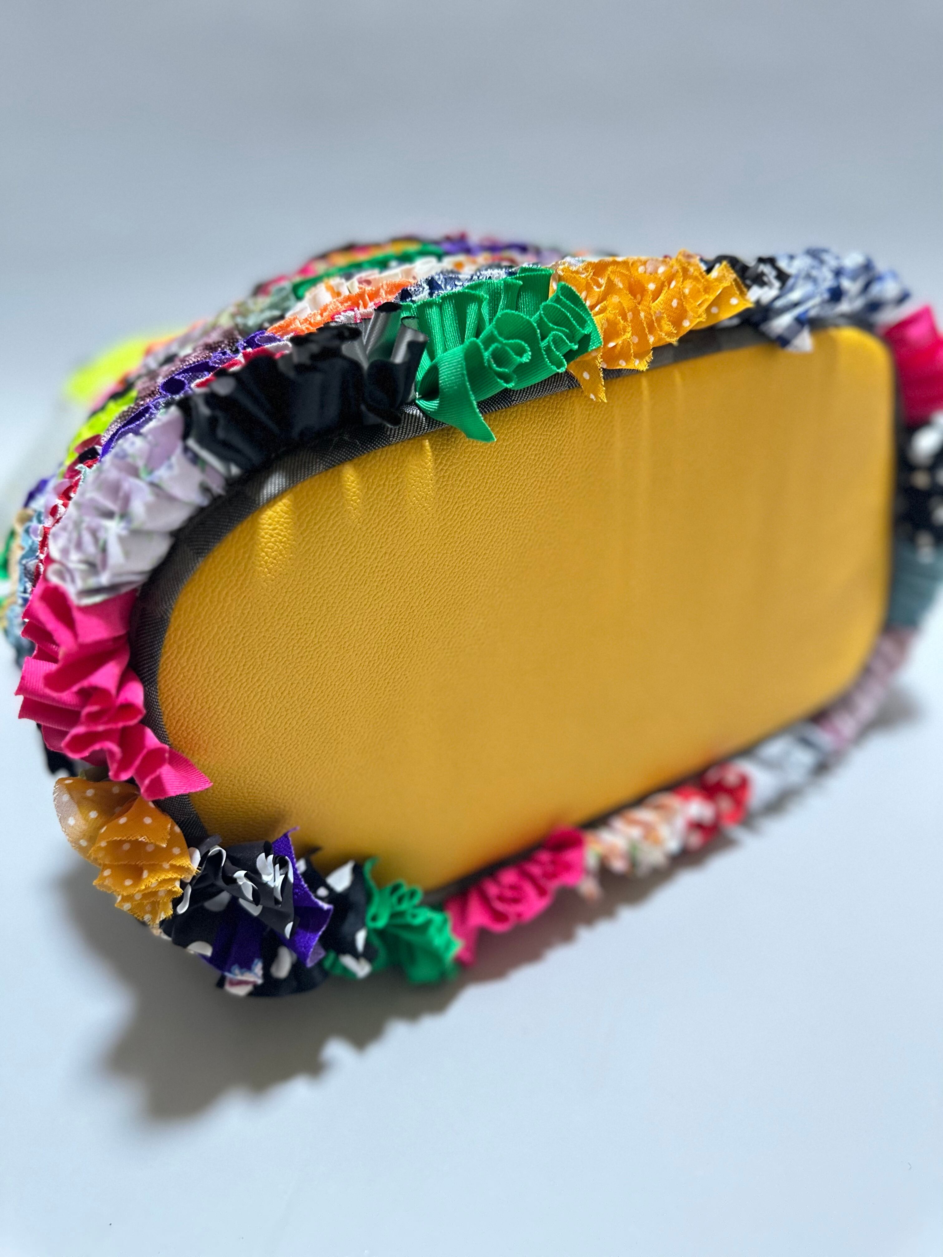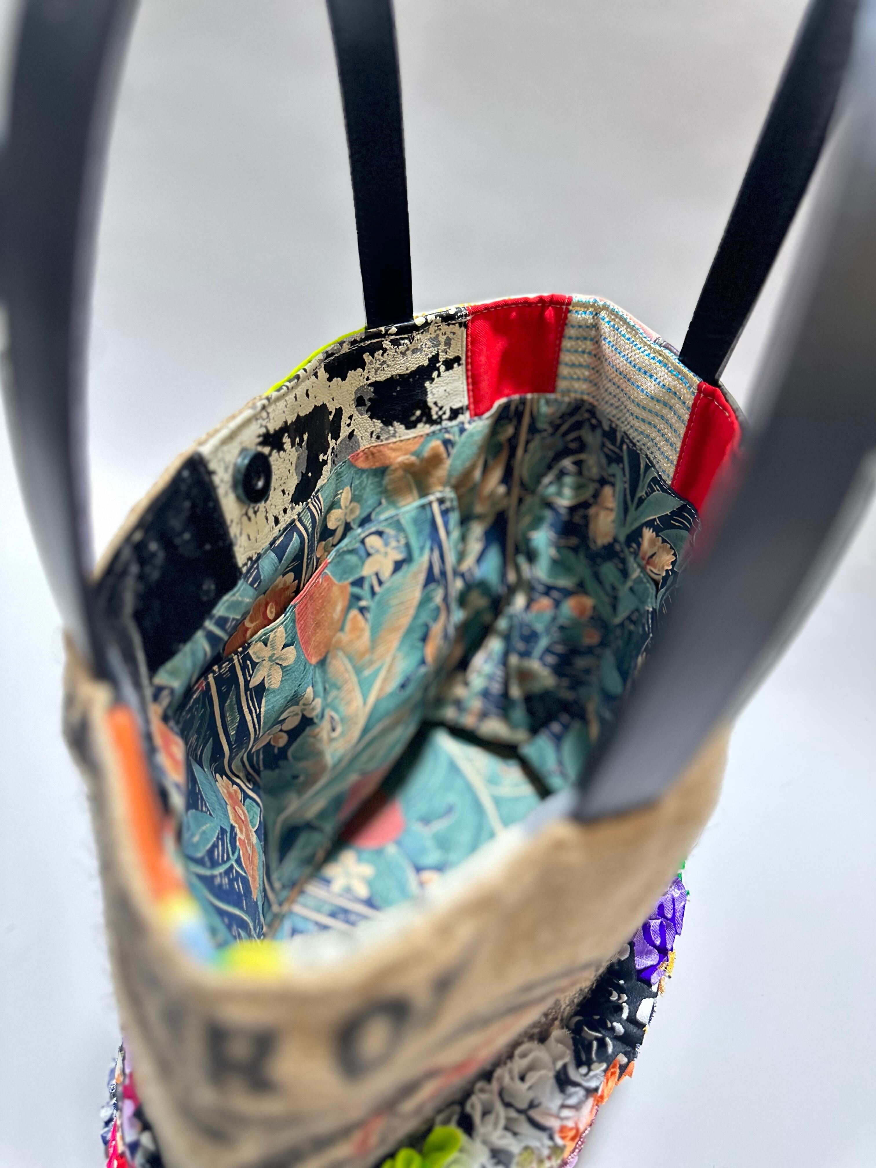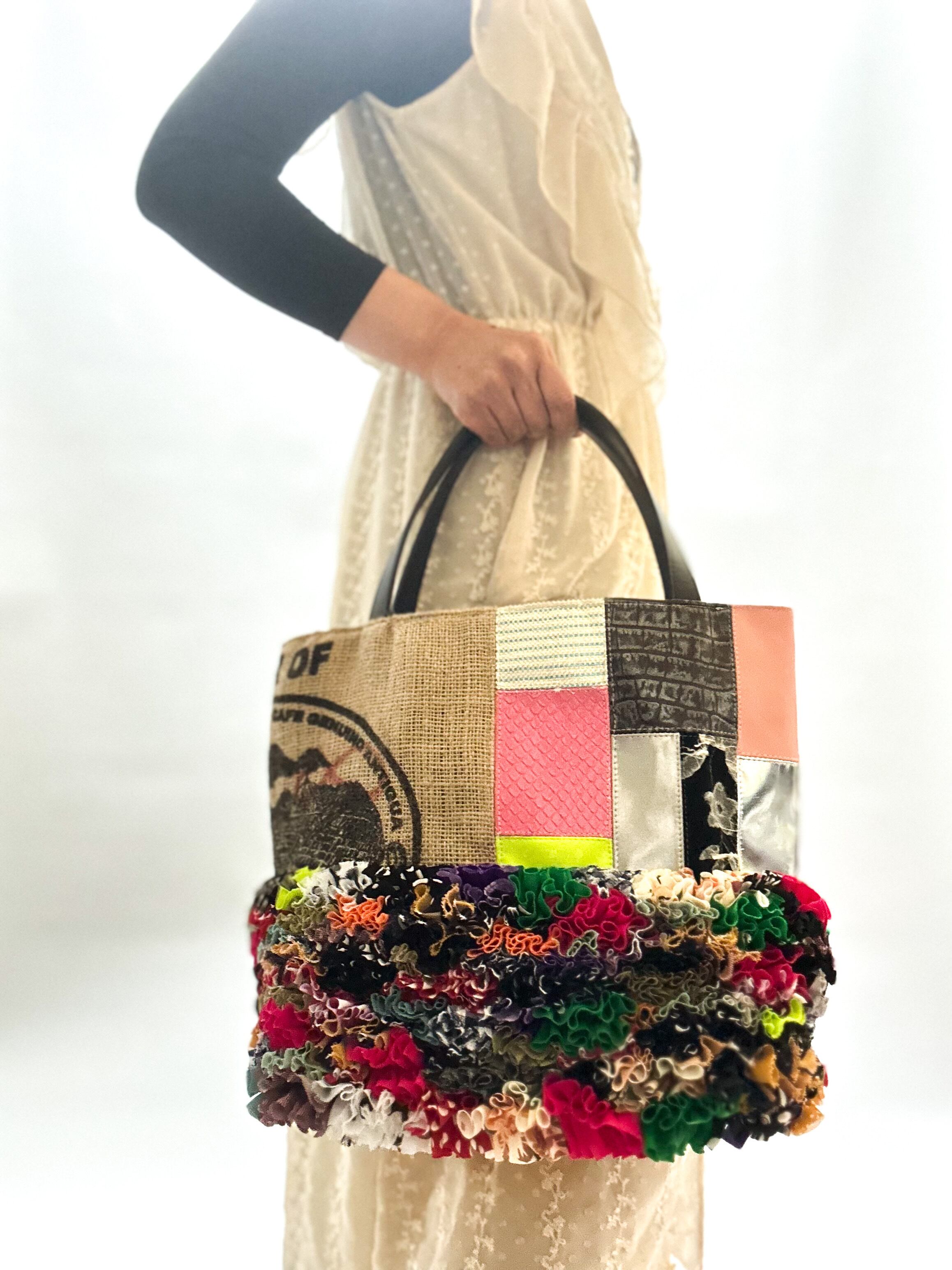様々な布地をフリルにし、ひとつの布に仕上げ特徴的な端材の革や新しい素材などをコーヒーの麻袋と組み合わせてパッチワークにした他にはないデザインのカラフルなトートバッグです。