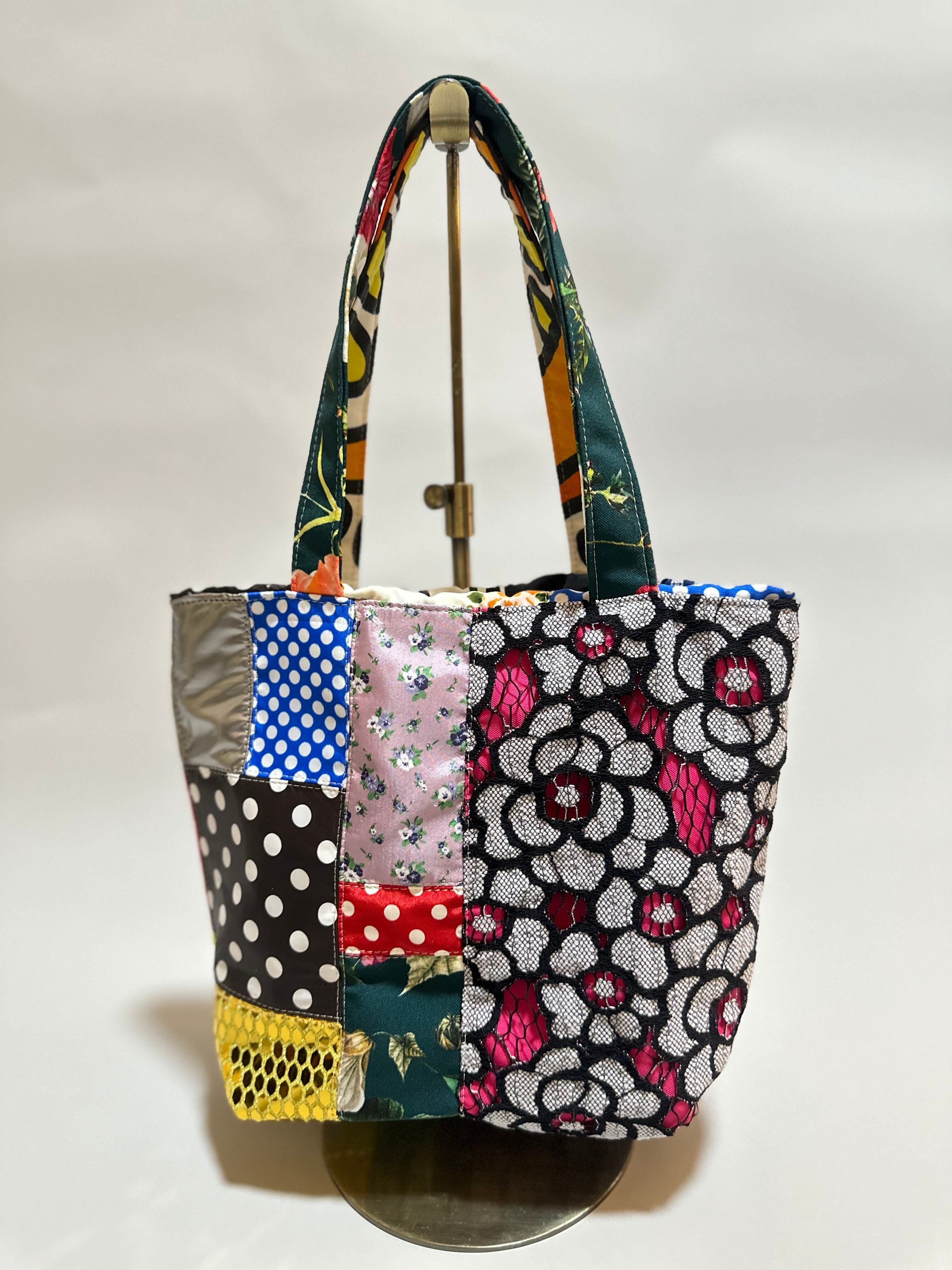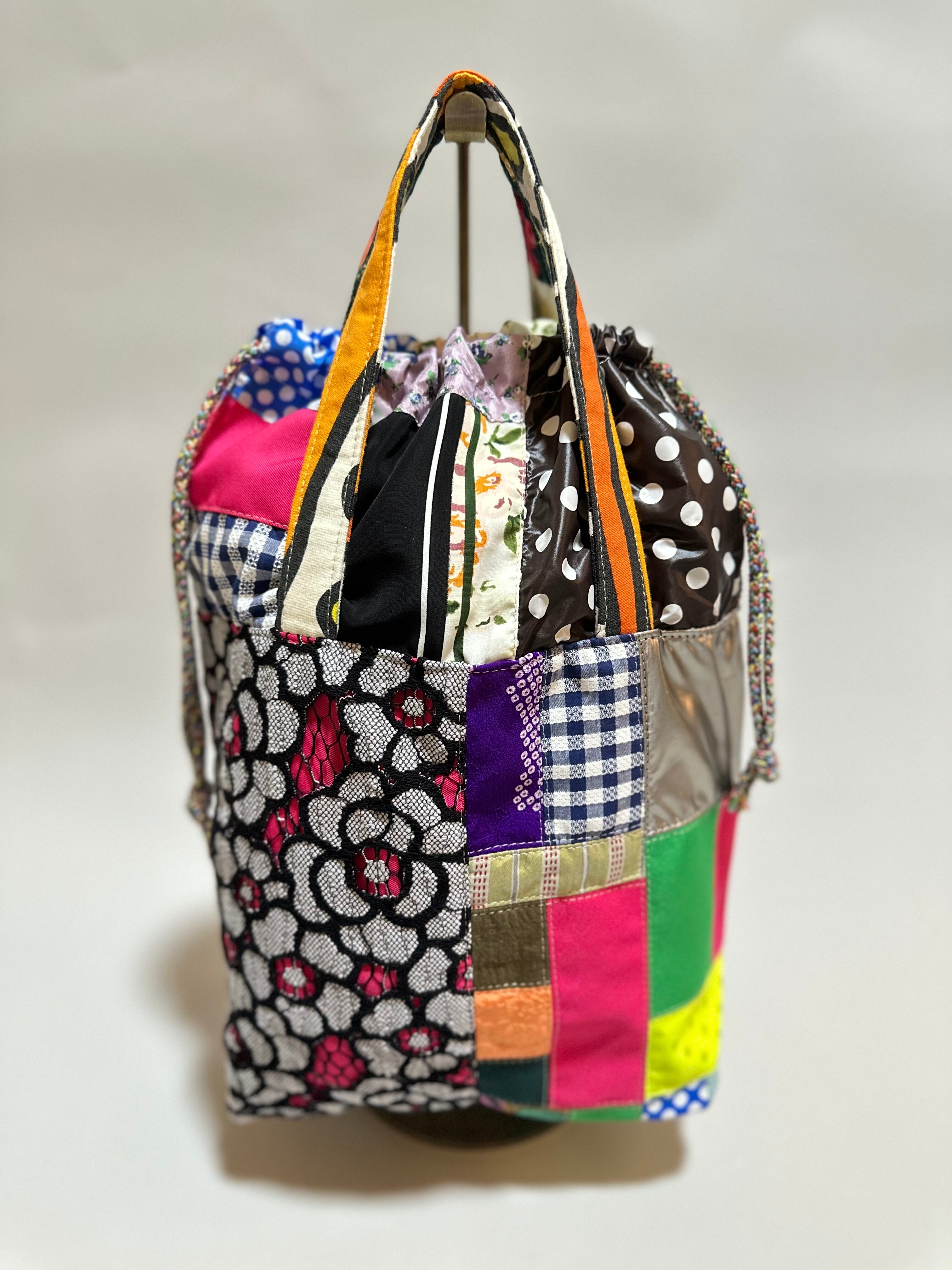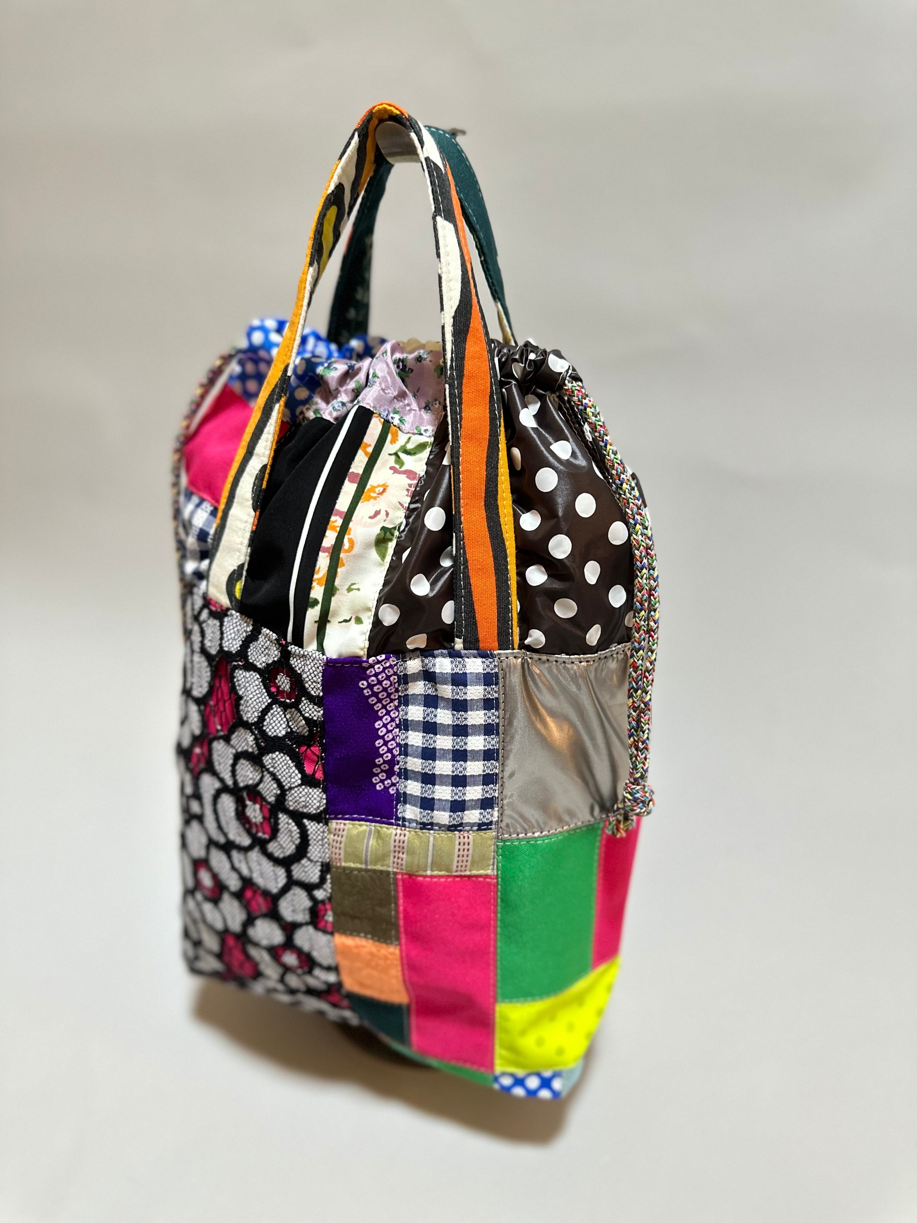 本来は廃棄されてしまう端材を新しい素材と組み合わせてパッチワークし、新しい型に仕上げた a Linden:tree オリジナルのサスティナブルな巾着タイプのエコトートバッグです。