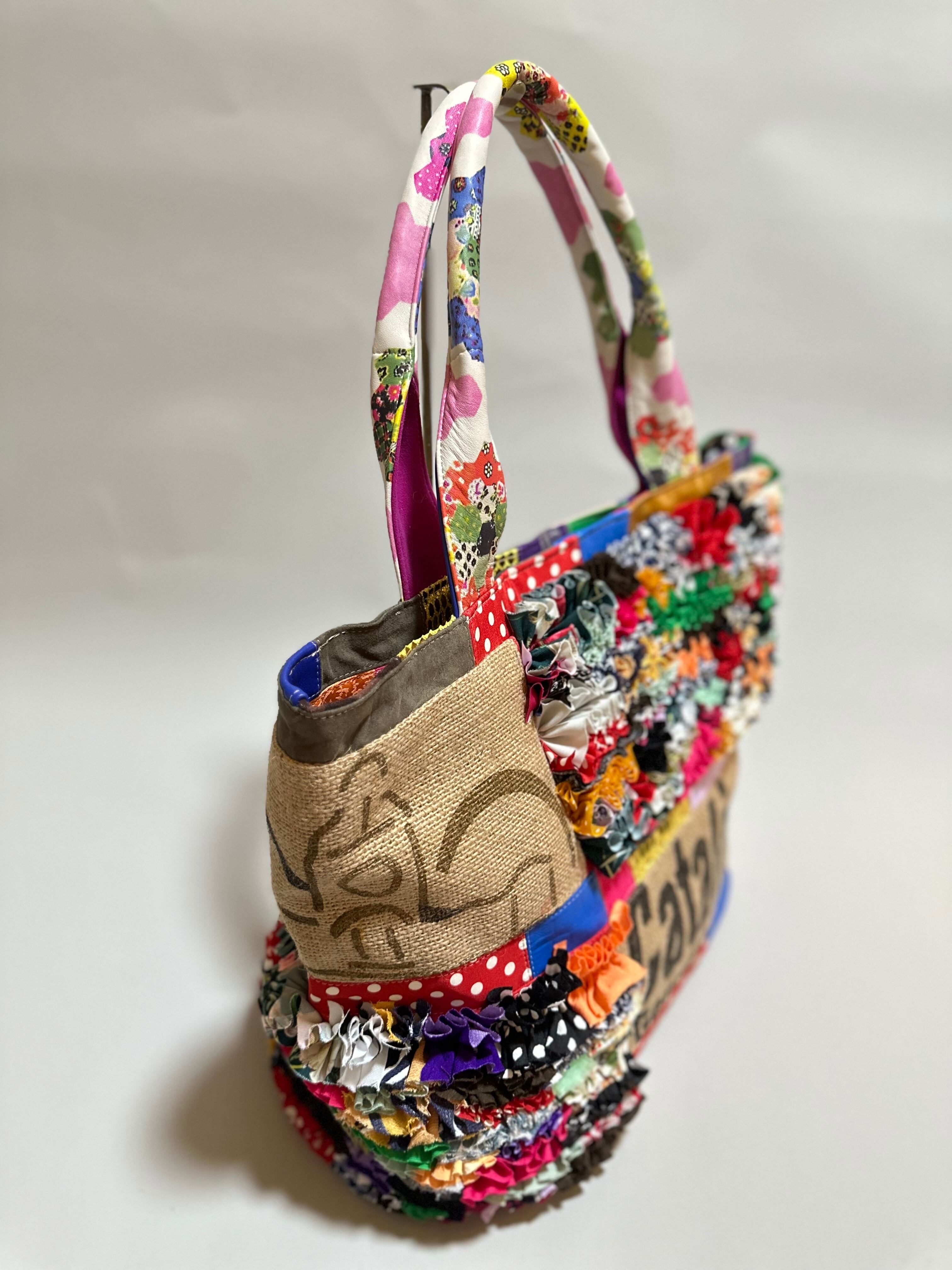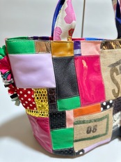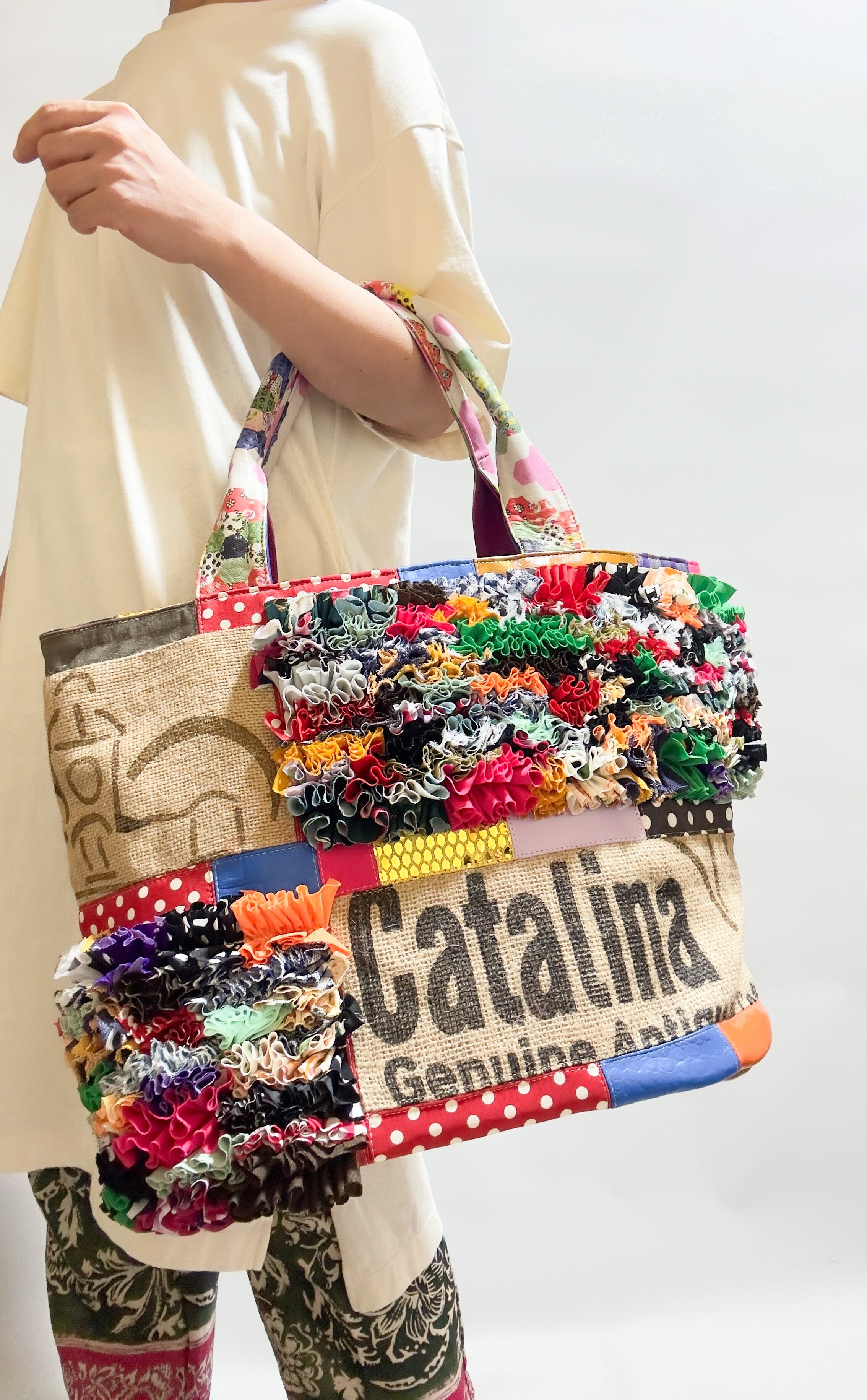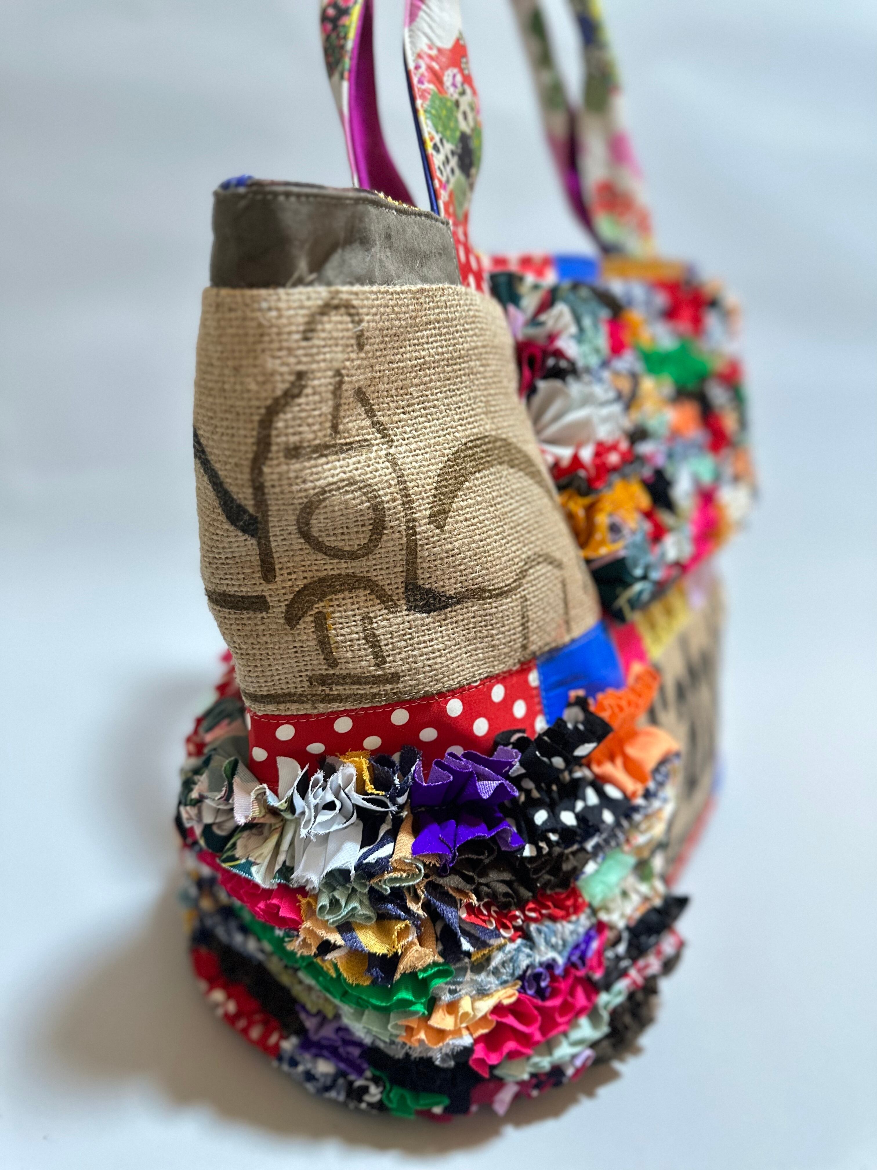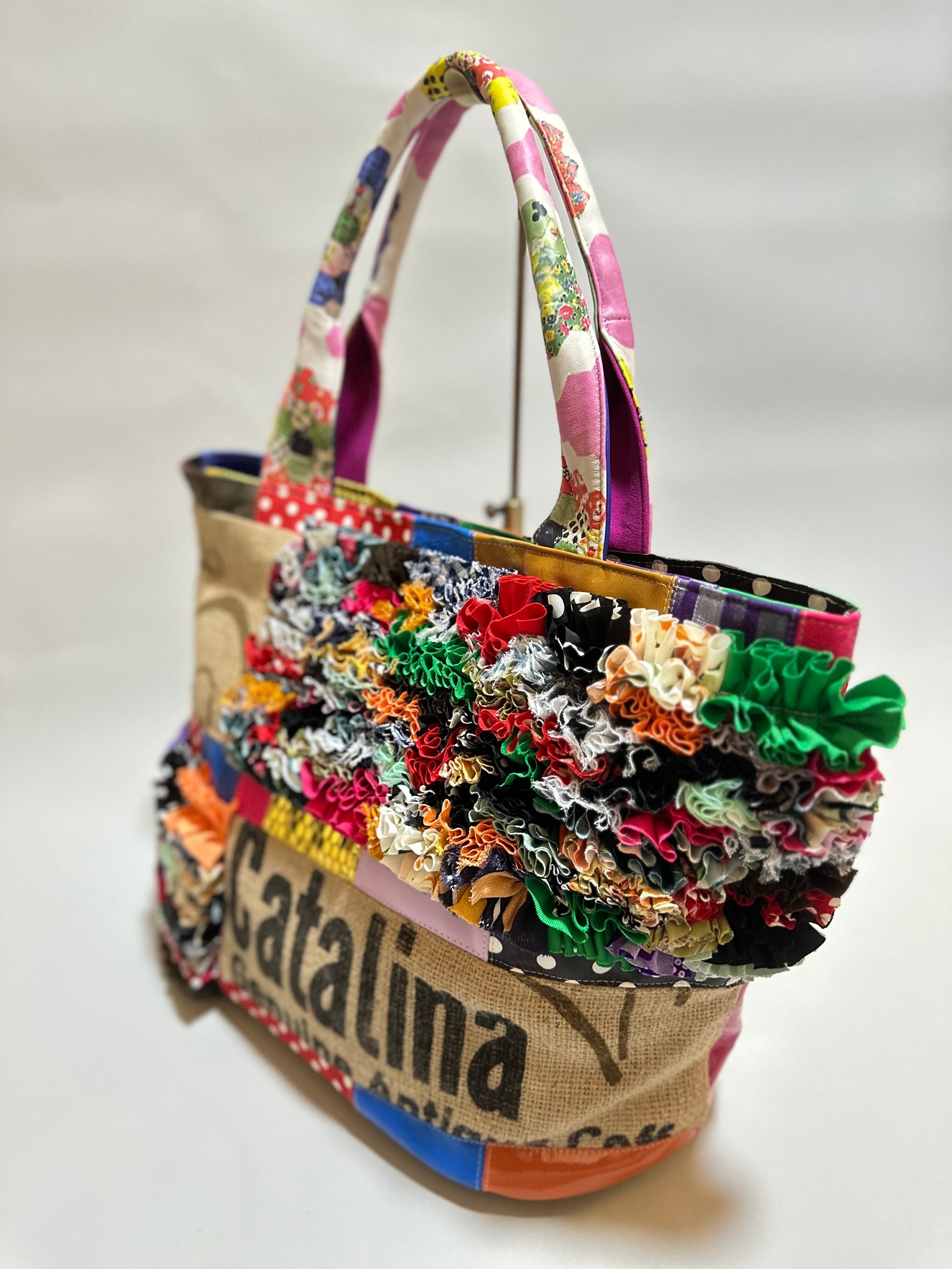 様々な布地をフリルにし、ひとつの布に仕上げ特徴的な端材の革や新しい素材などをコーヒーの麻袋と組み合わせてパッチワークにした他にはないデザインのカラフルなトートバッグです。