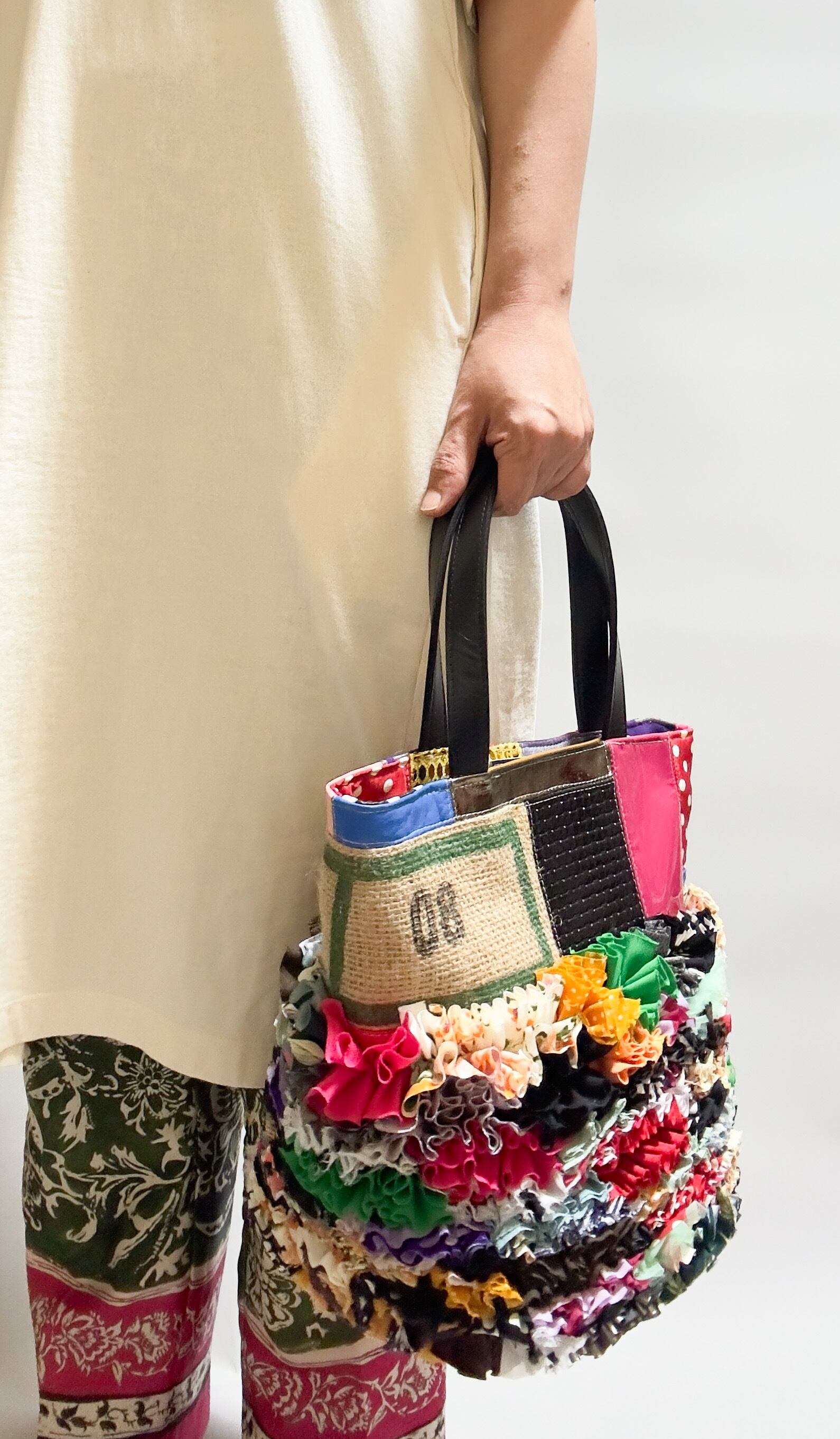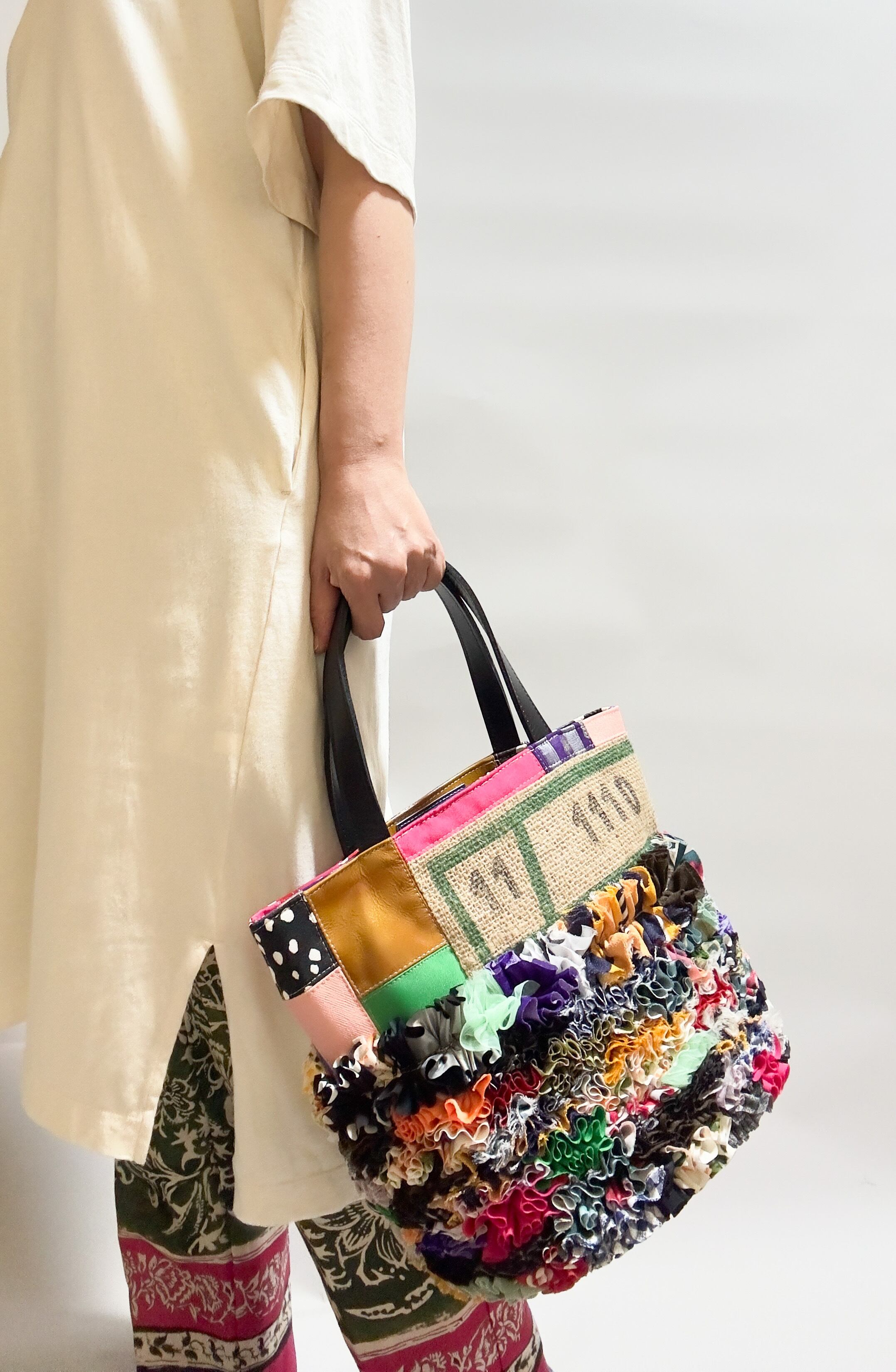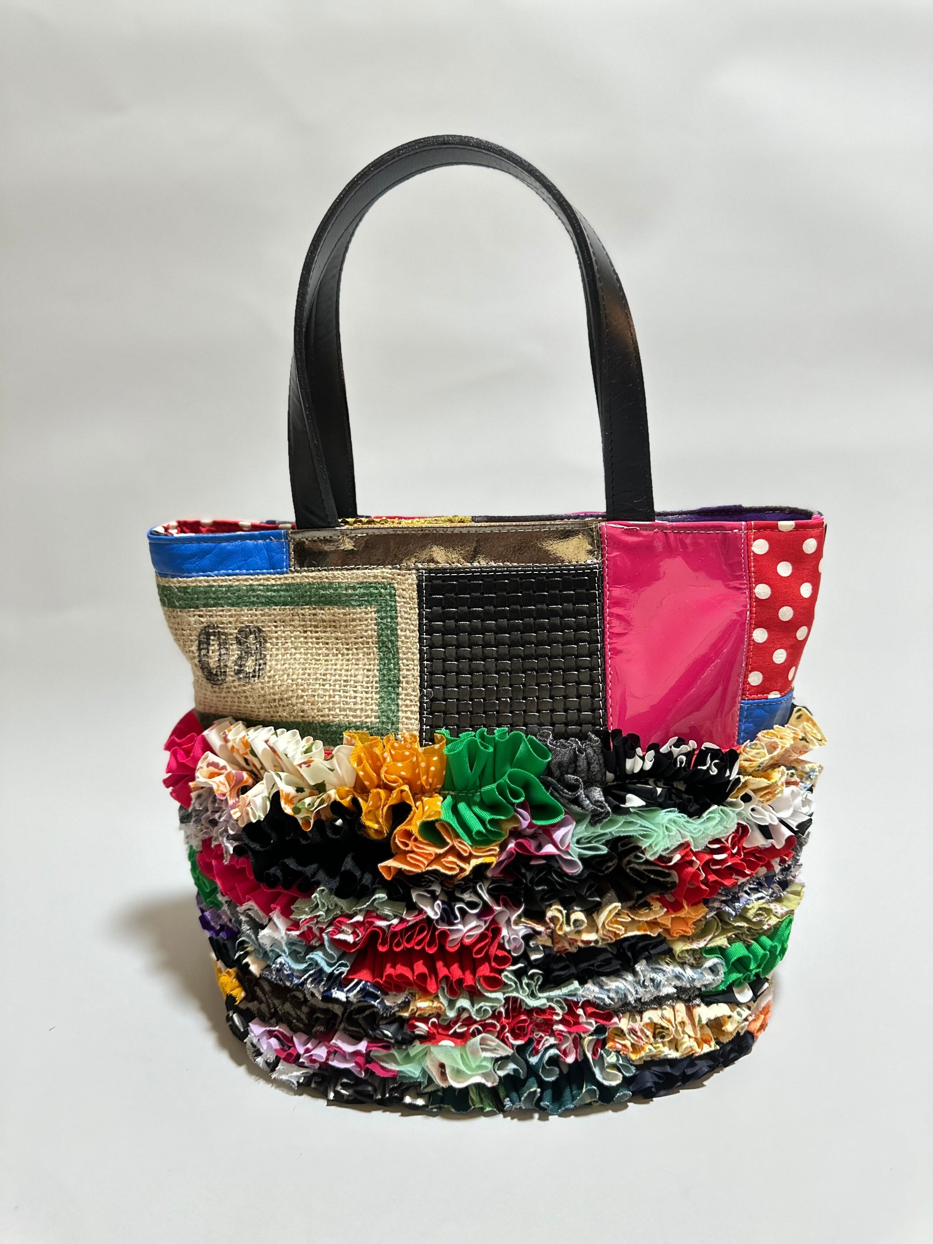 個性的な端材の革や新しい素材などをコーヒーの麻袋と組み合わせてパッチワークにし他にはないデザインのデコラティブなトートバッグです。
