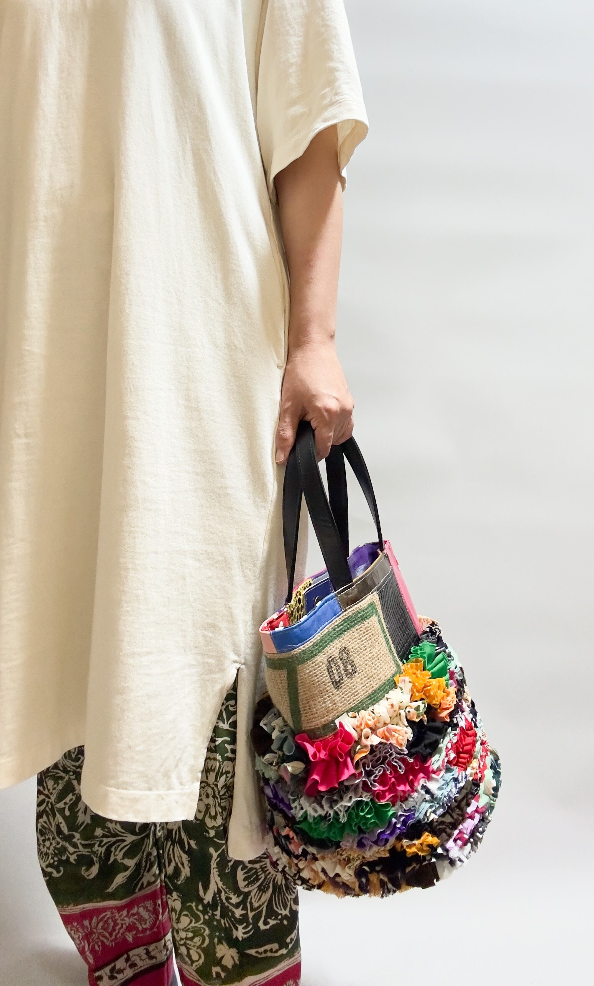 さまざまな素材をフリルにし、ひとつの布地のように仕上げました。