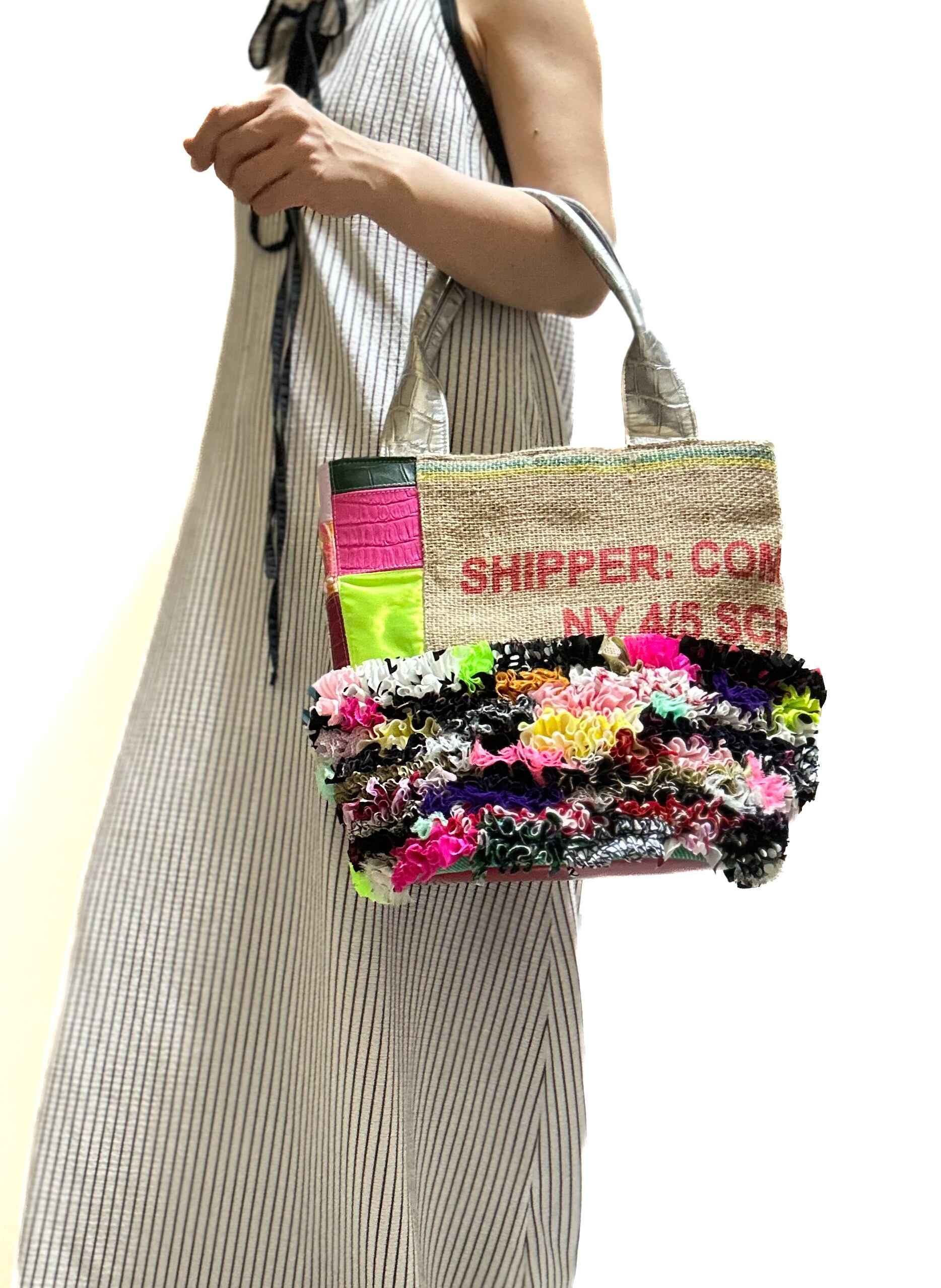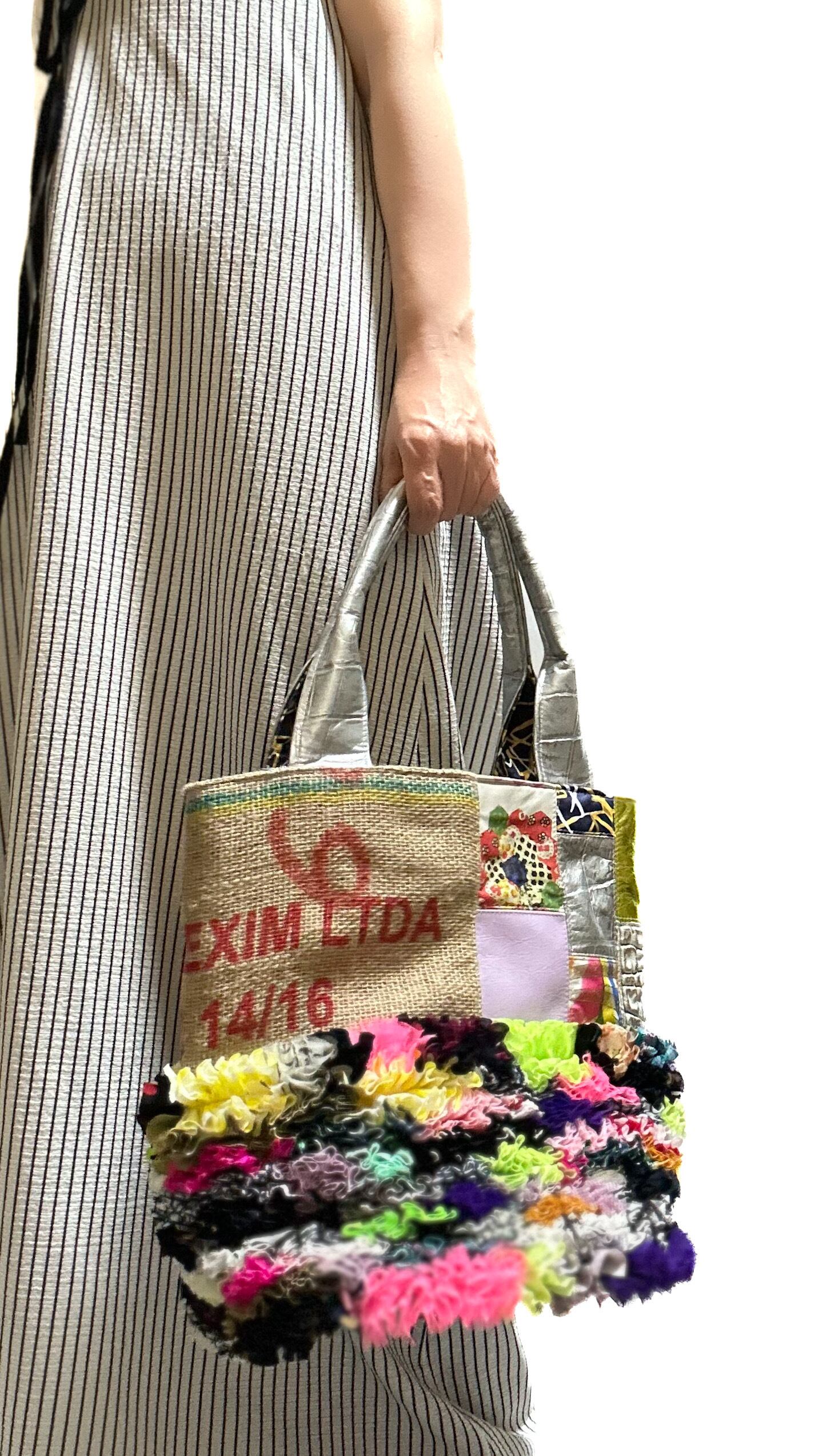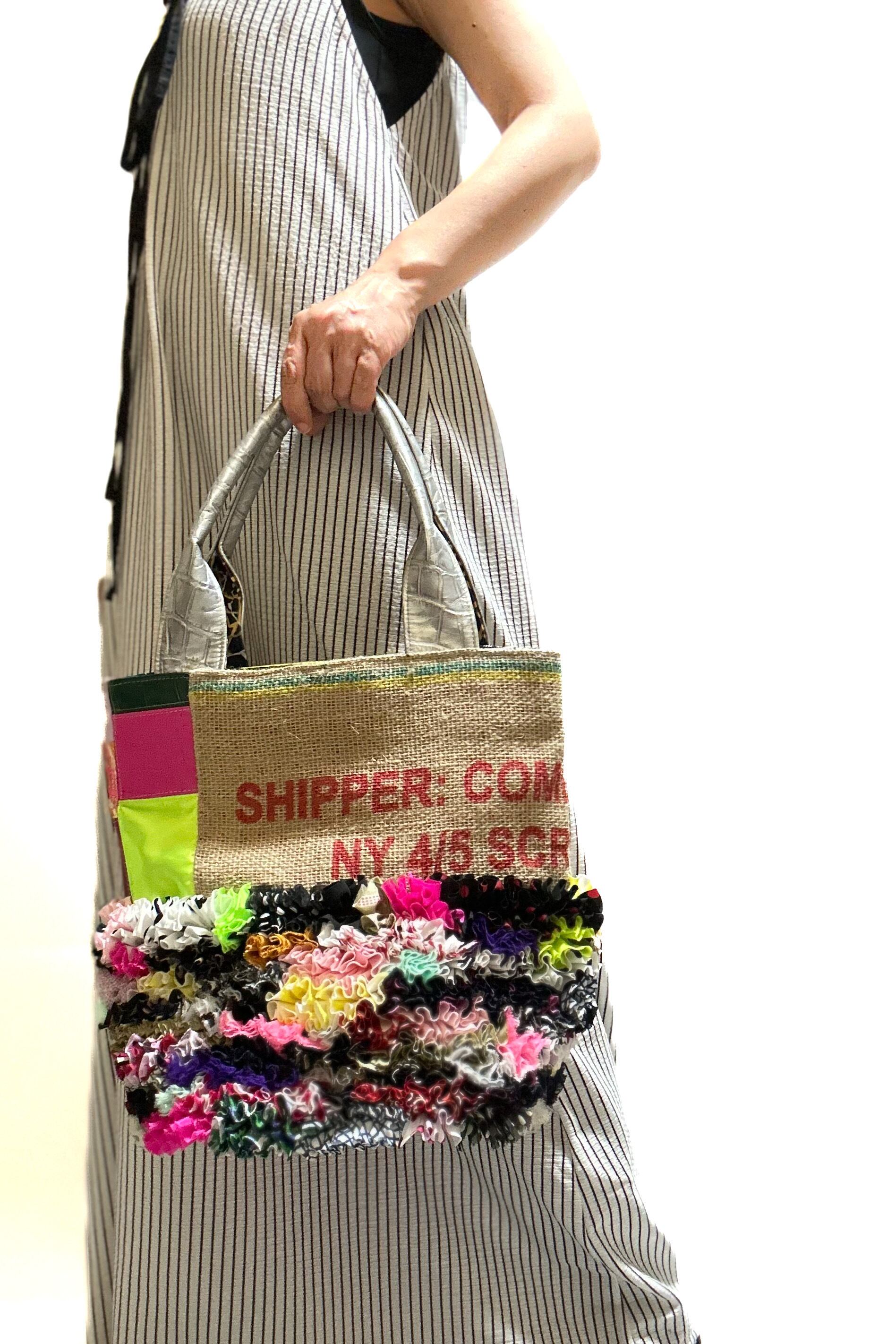 様々な布地をフリルにし、ひとつの布に仕上げ特徴的な端材の革や新しい素材などをコーヒーの麻袋と組み合わせてパッチワークにした他にはないデザインのカラフルなトートバッグです。