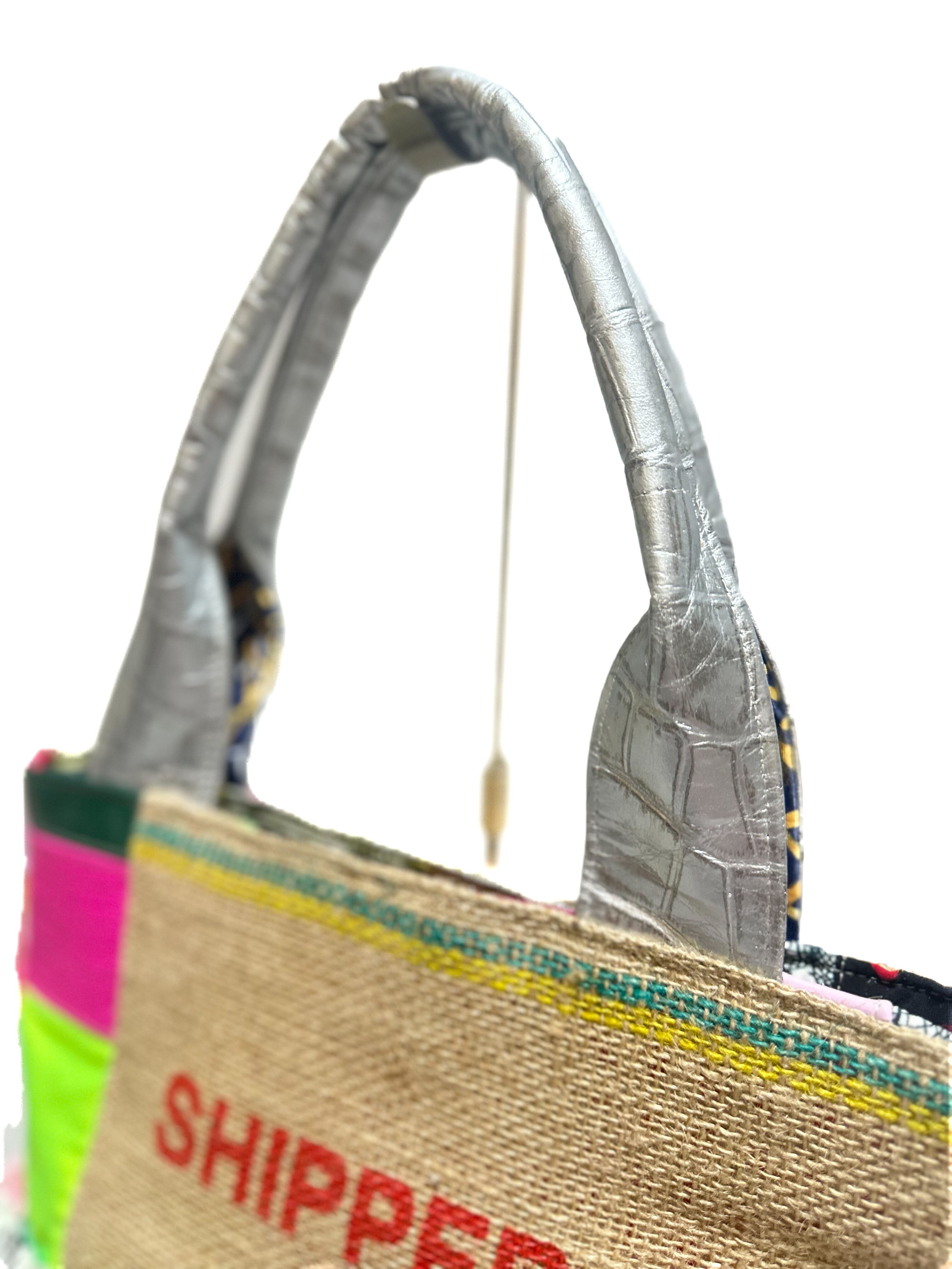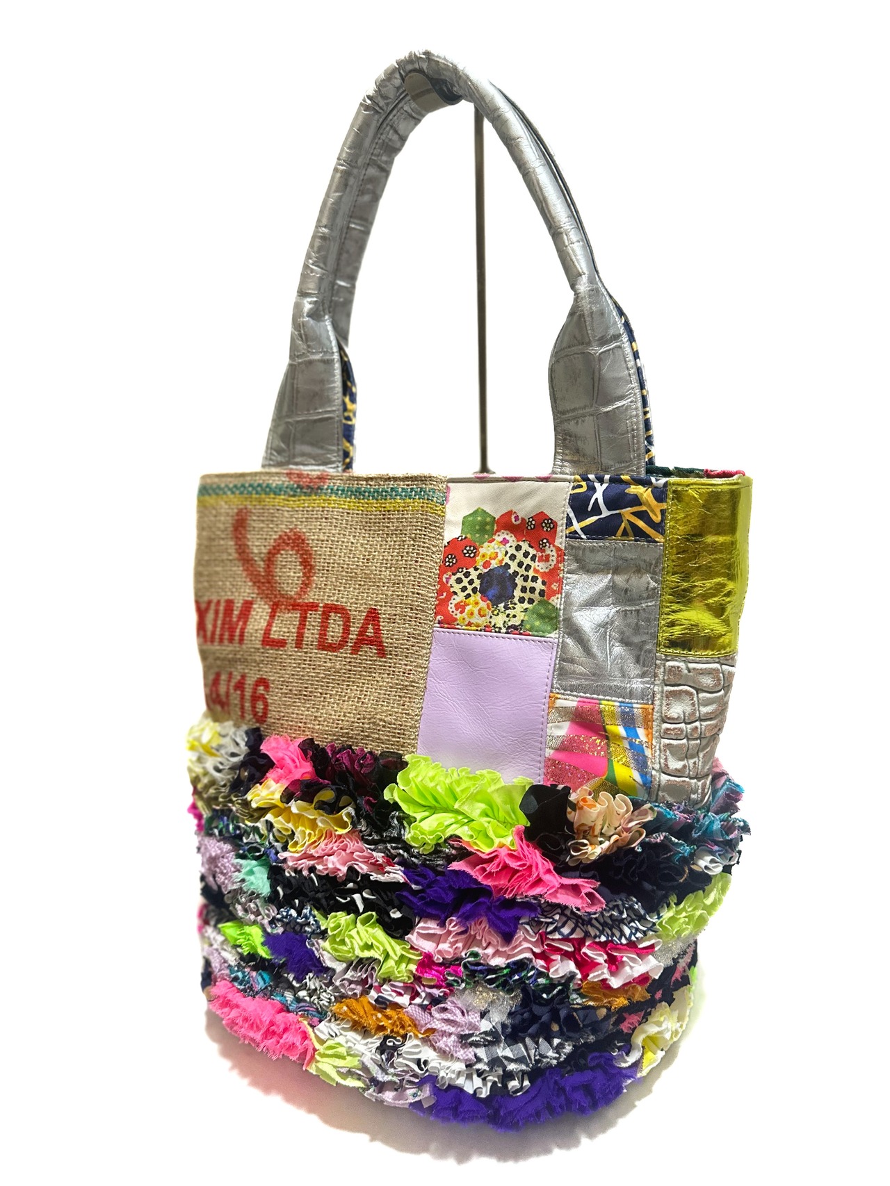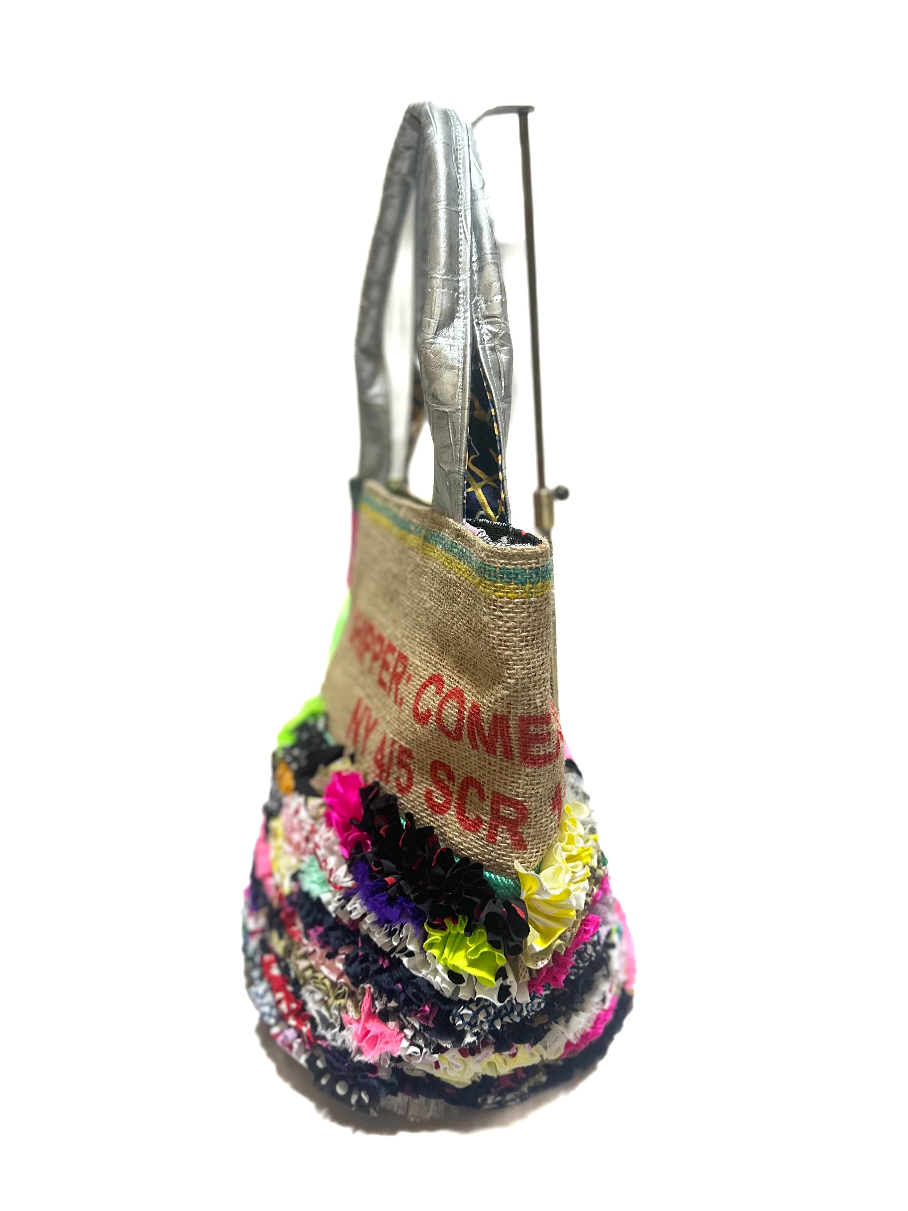 様々な布地をフリルにし、ひとつの布に仕上げ特徴的な端材の革や新しい素材などをコーヒーの麻袋と組み合わせてパッチワークにした他にはないデザインのカラフルなトートバッグです。