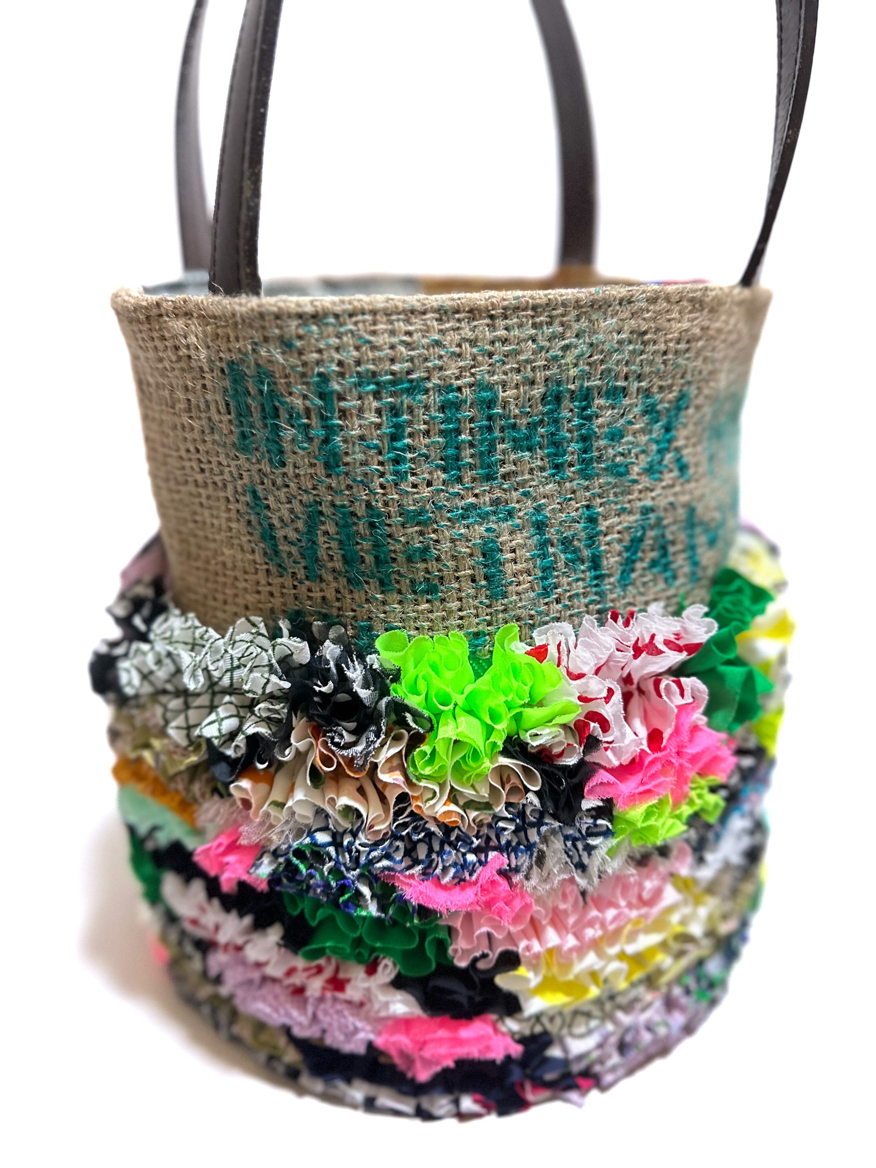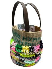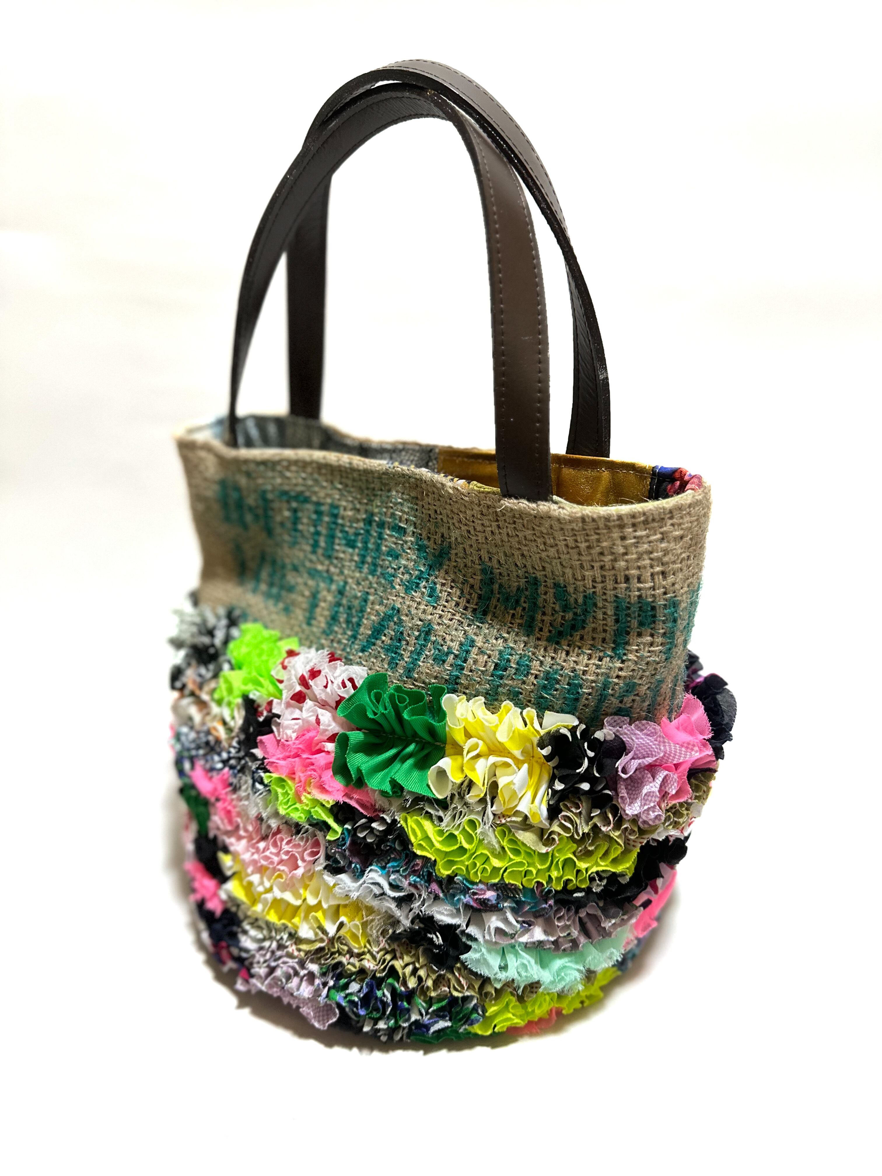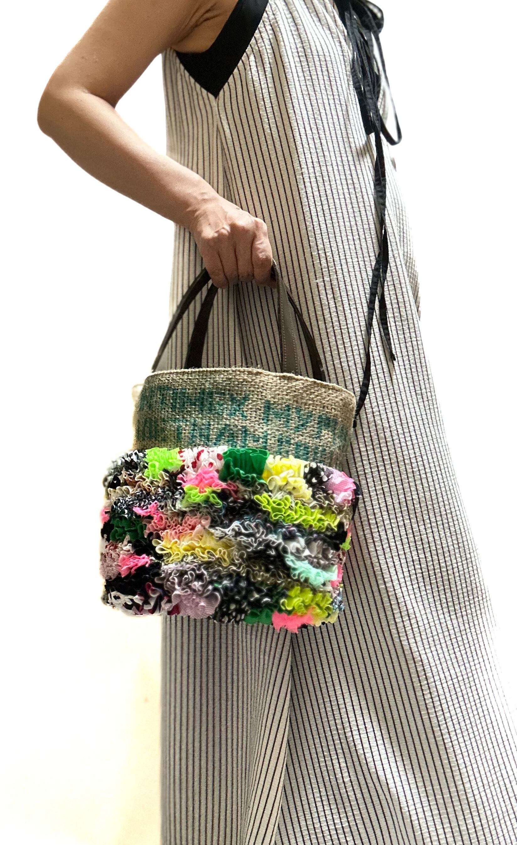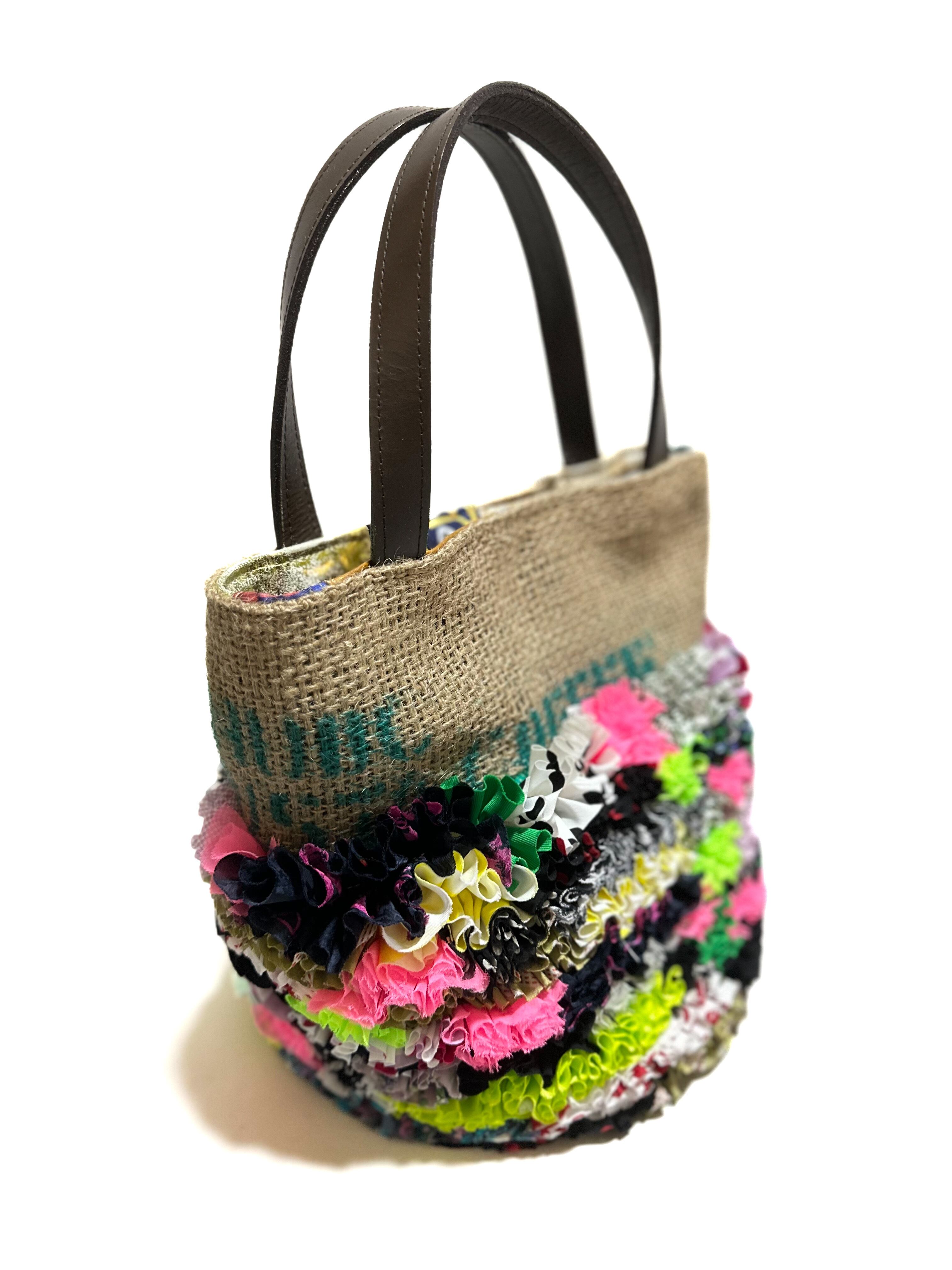 様々な布地をフリルにし、ひとつの布に仕上げコーヒーの麻袋と組み合わせた他にはないデザインのカラフルなトートバッグです。