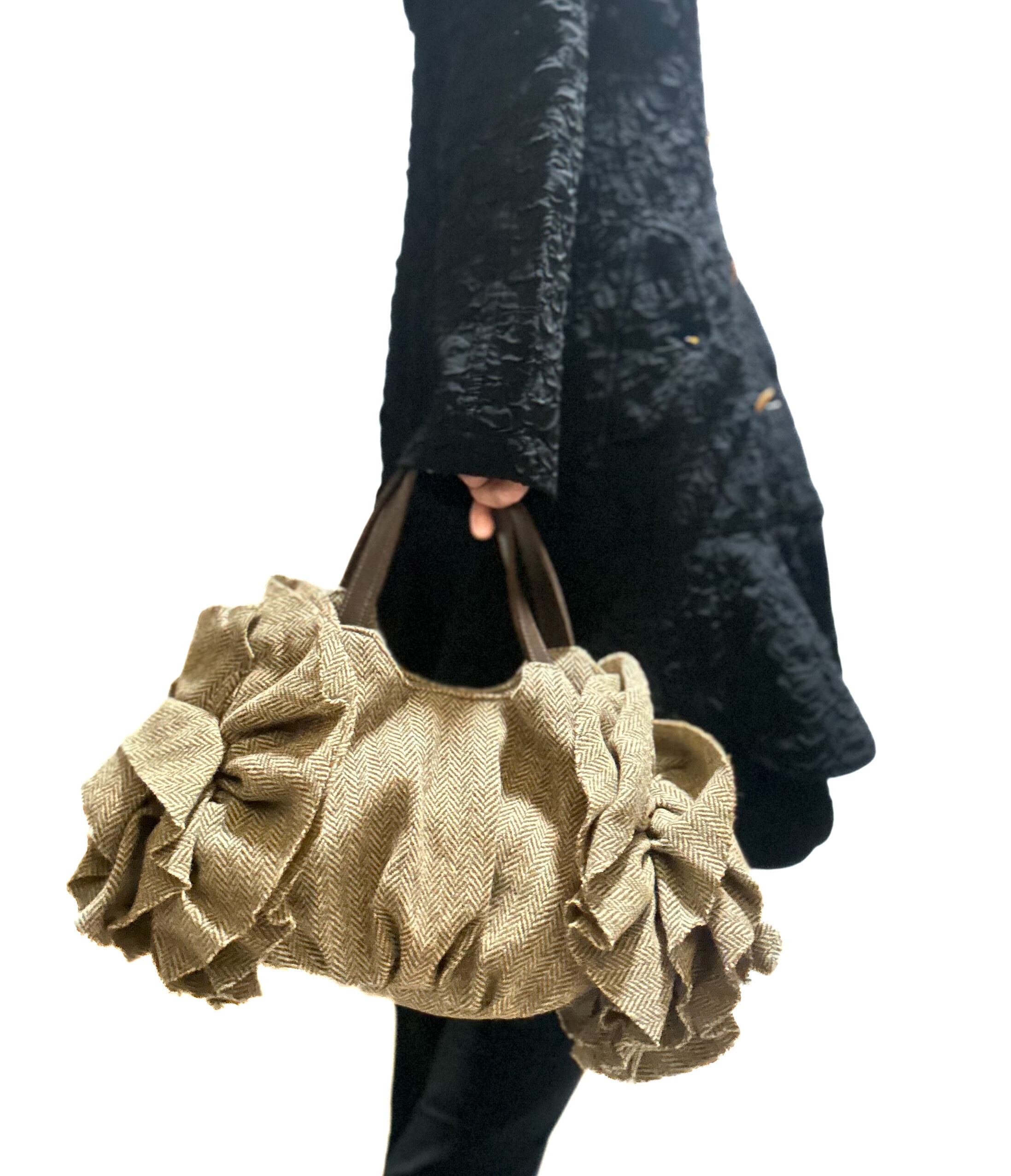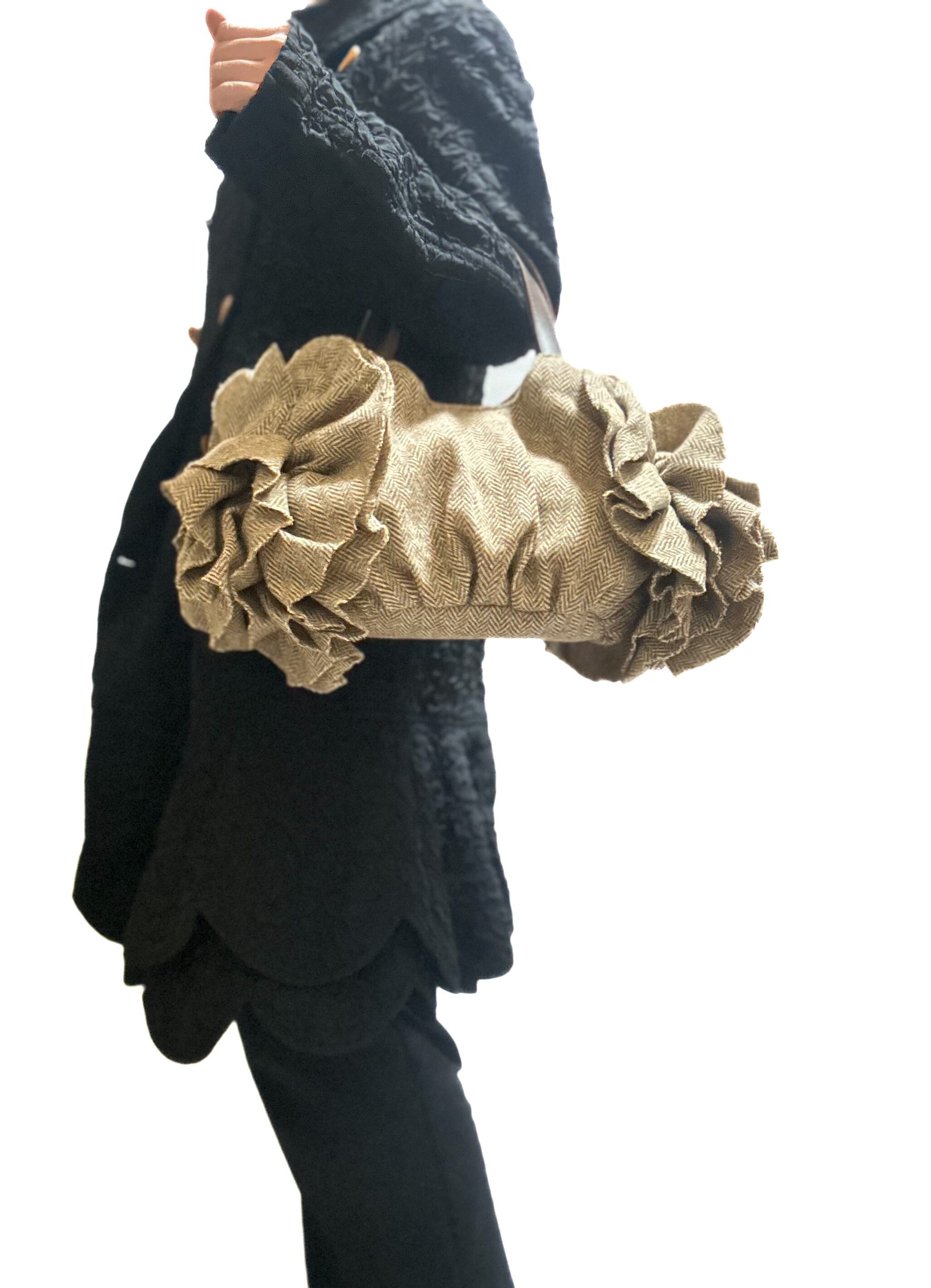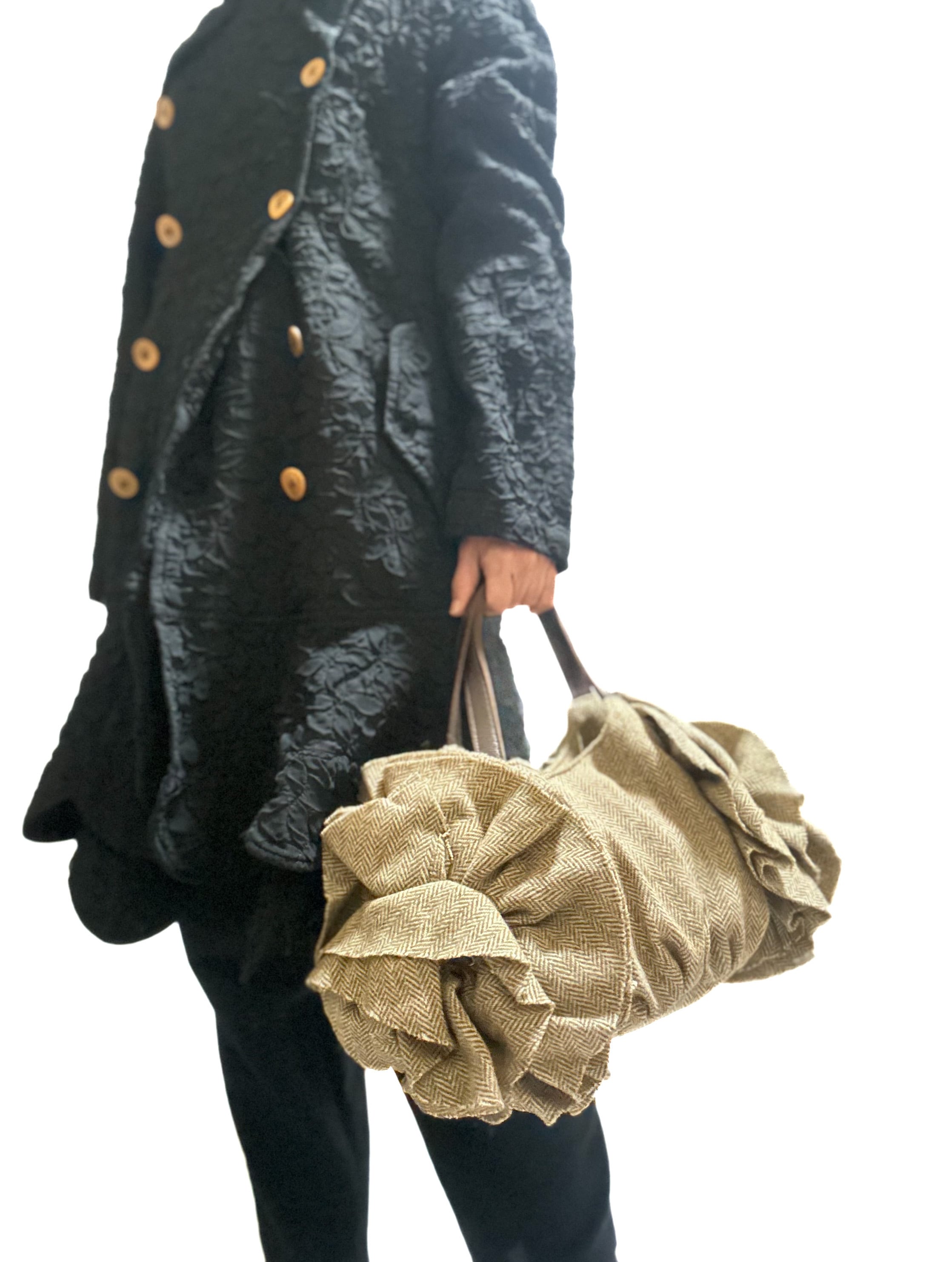 上品なヘリンボーンを使用しデザイン性もあり、個性のあるバッグですが日常使いでもフォーマルにも合わせていただけますので、様々なコーディネートを楽しんでもらえたら嬉しいです。また、お着物に合わせてもステキなんですよ。